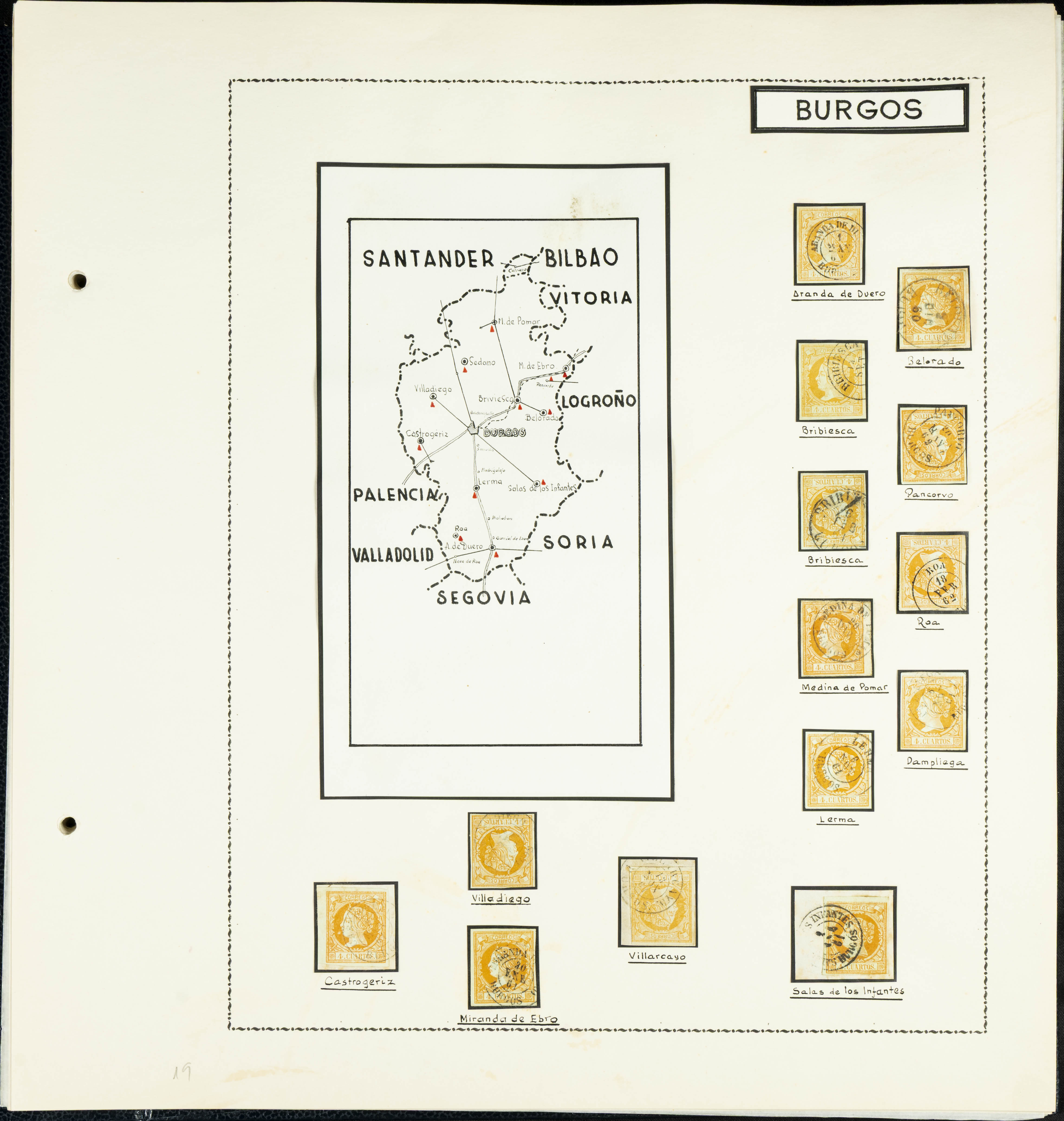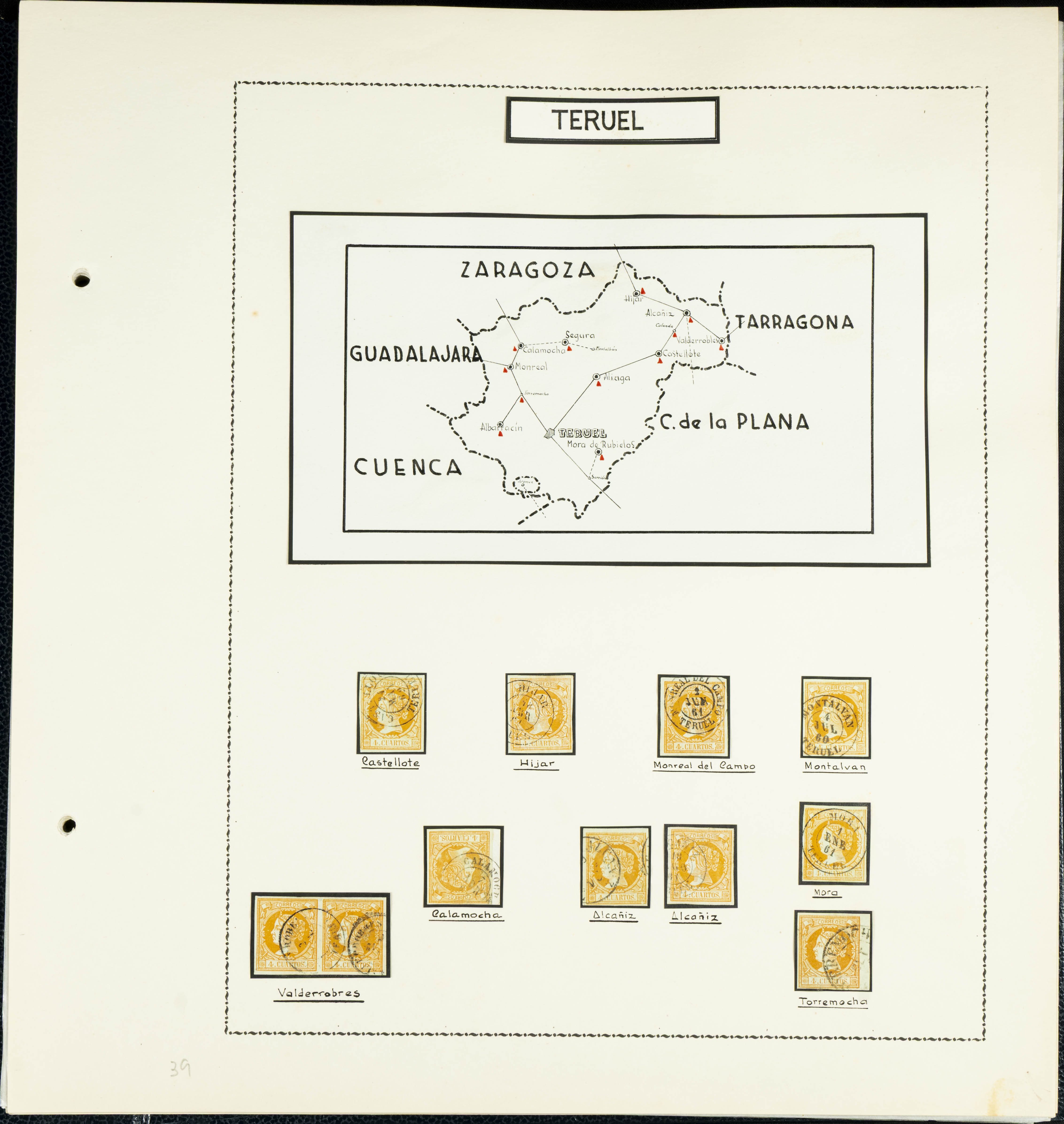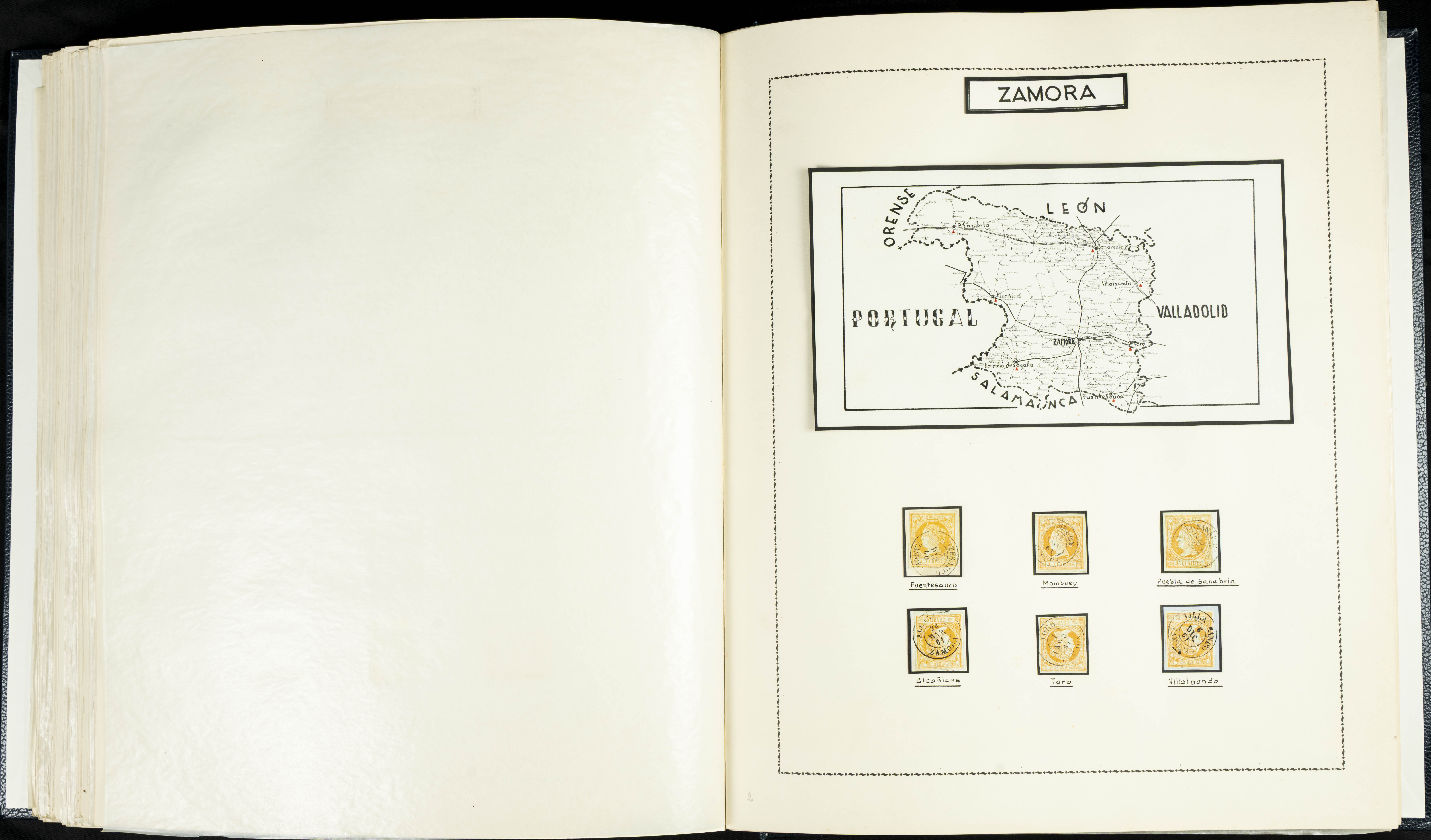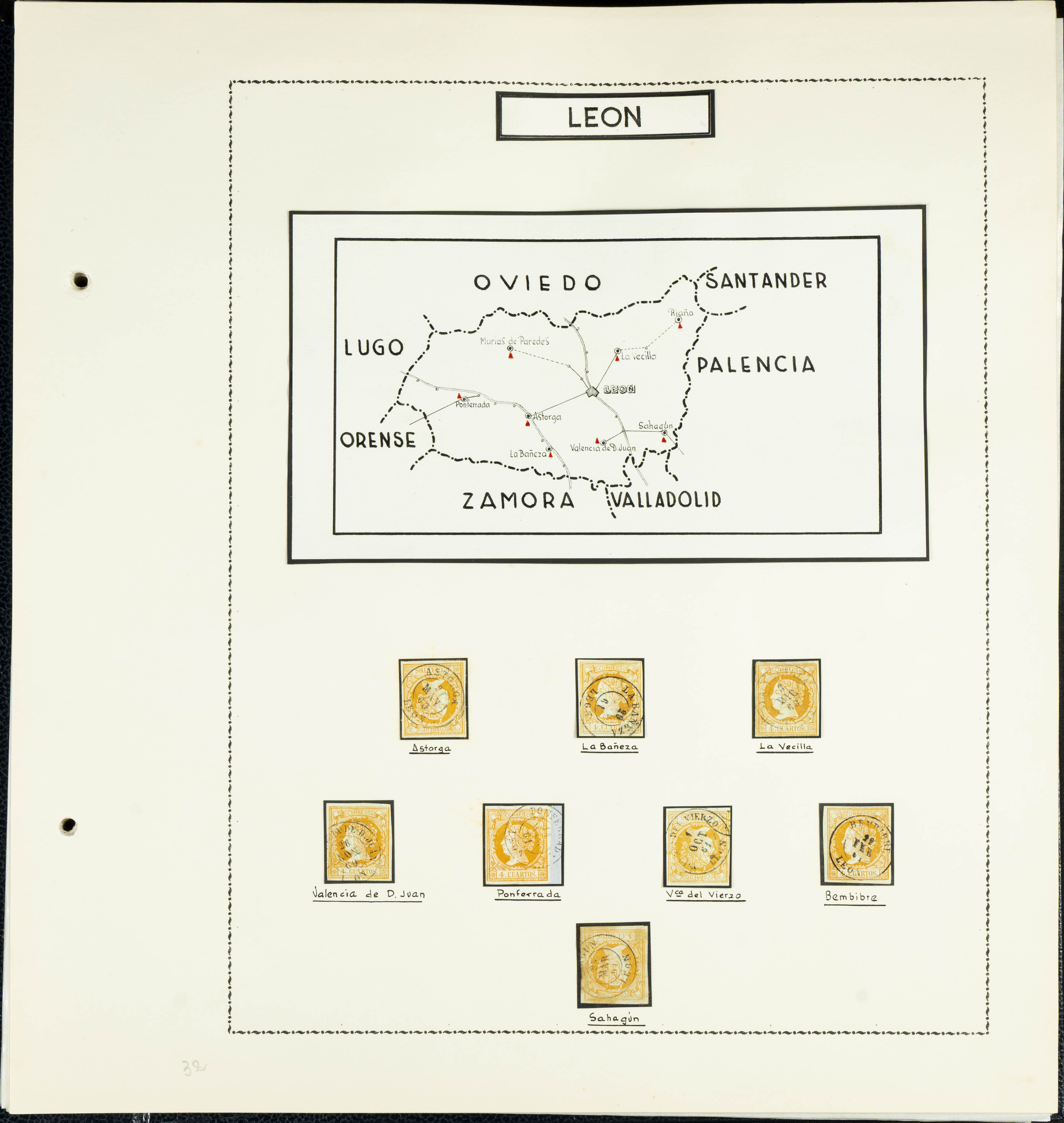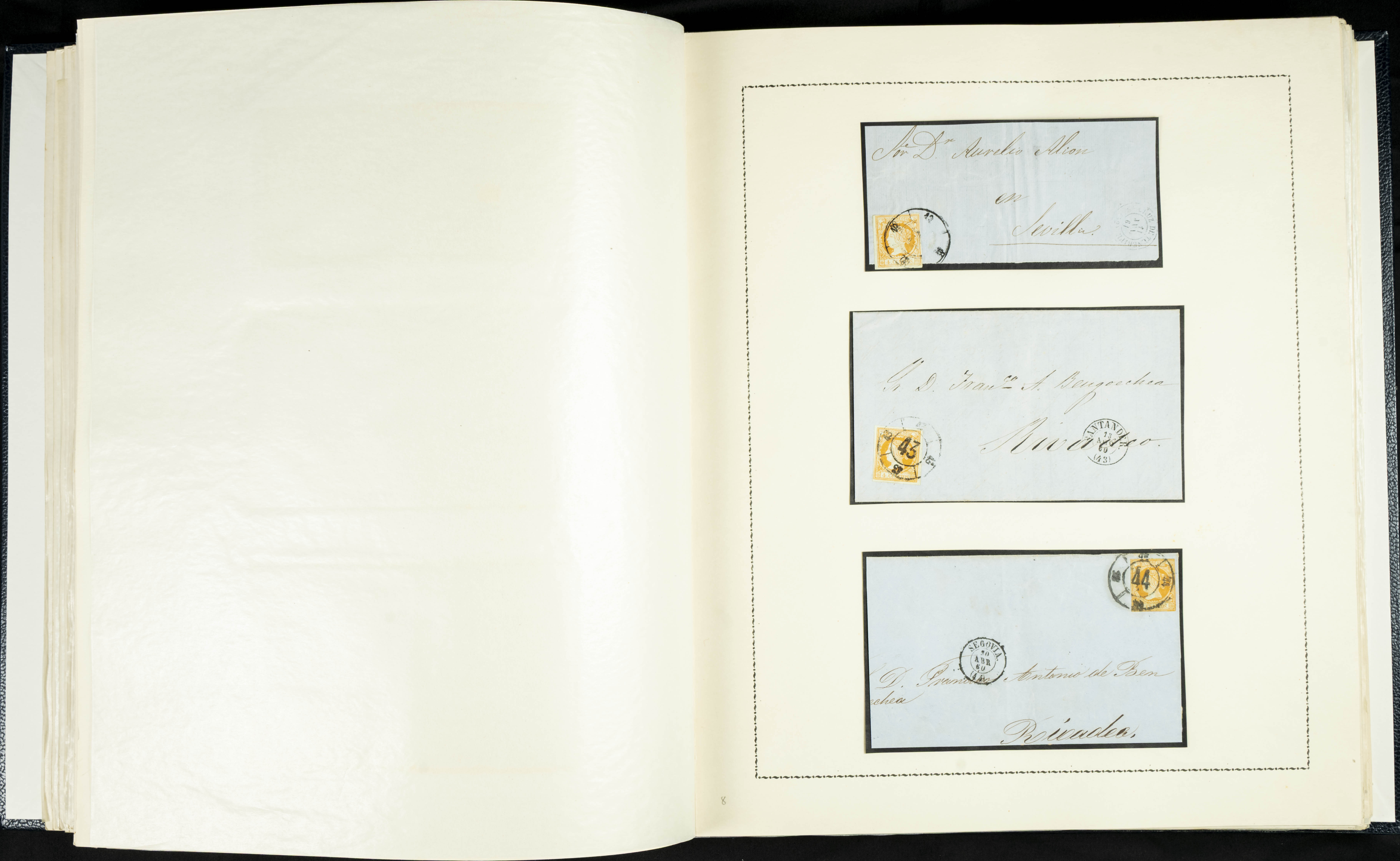 English 52. 1860. Spectacular collection of the yellow 4cuarto stamp, including countless stamps, blocks, fragments, and letters. Part of it is organized by province, especially the Type I and II date stamps. It includes a complete calendar of use, various clichés, a complete set of wagon wheel stamps, and almost a complete set of letter stamps, including the extremely rare No. 42. Individual highlights include a first-day cover stamp and letter, the perforated stamp used in Valencia on a letter (possibly the only one known), stamps and letters with pre-philatelic postmarks, and enormous blocks (spectacularly mounted in antique albums). A MUST-SEE.