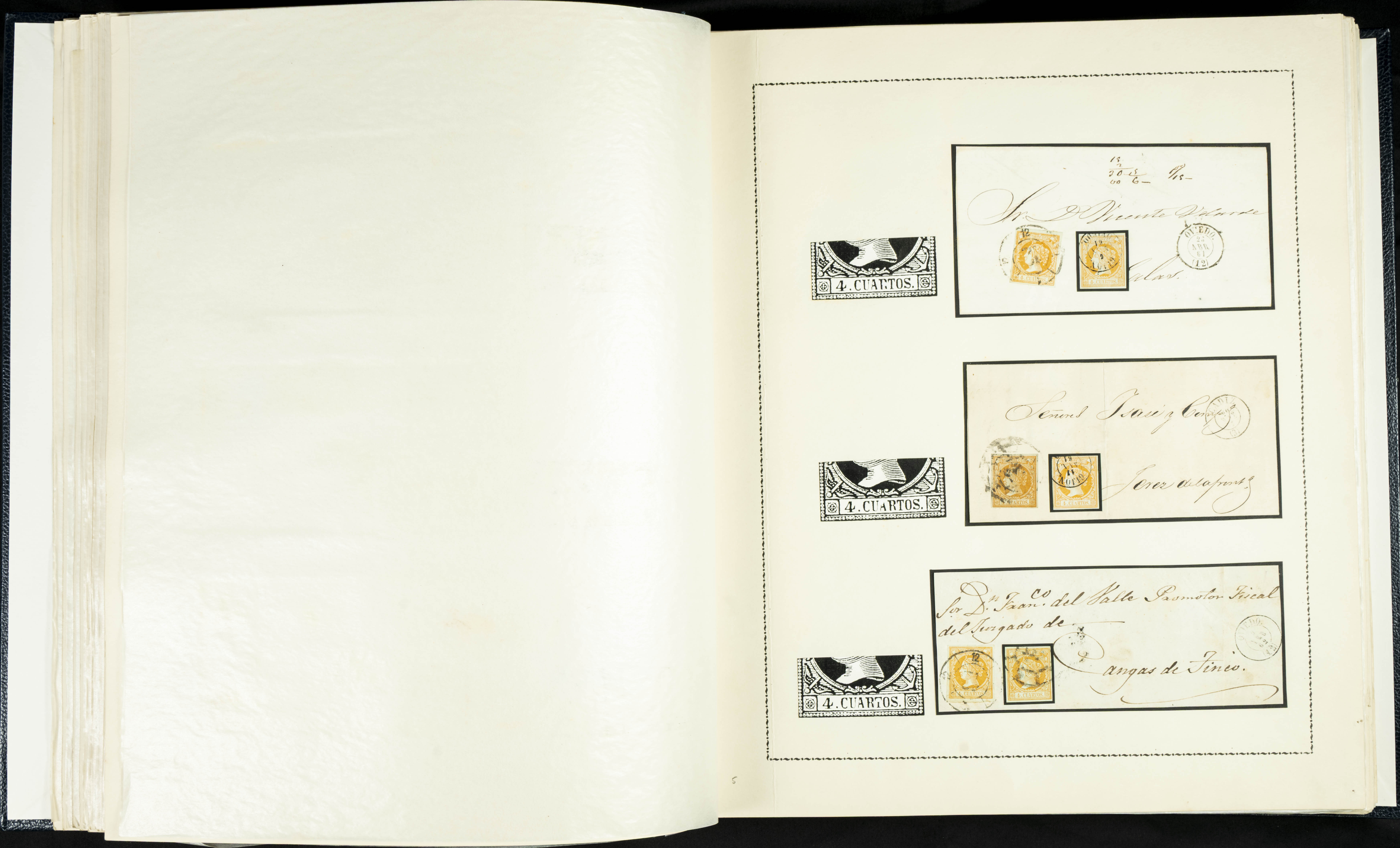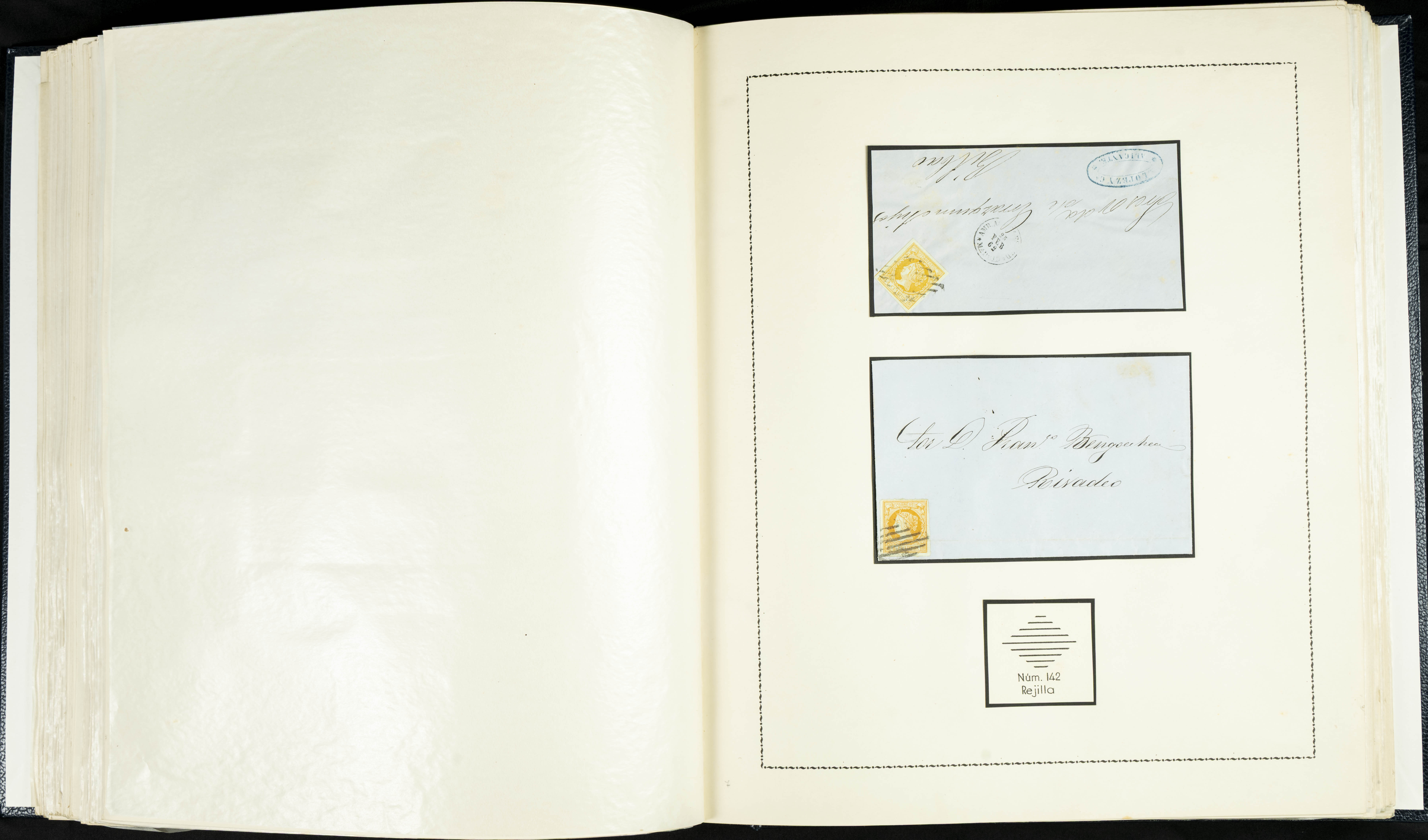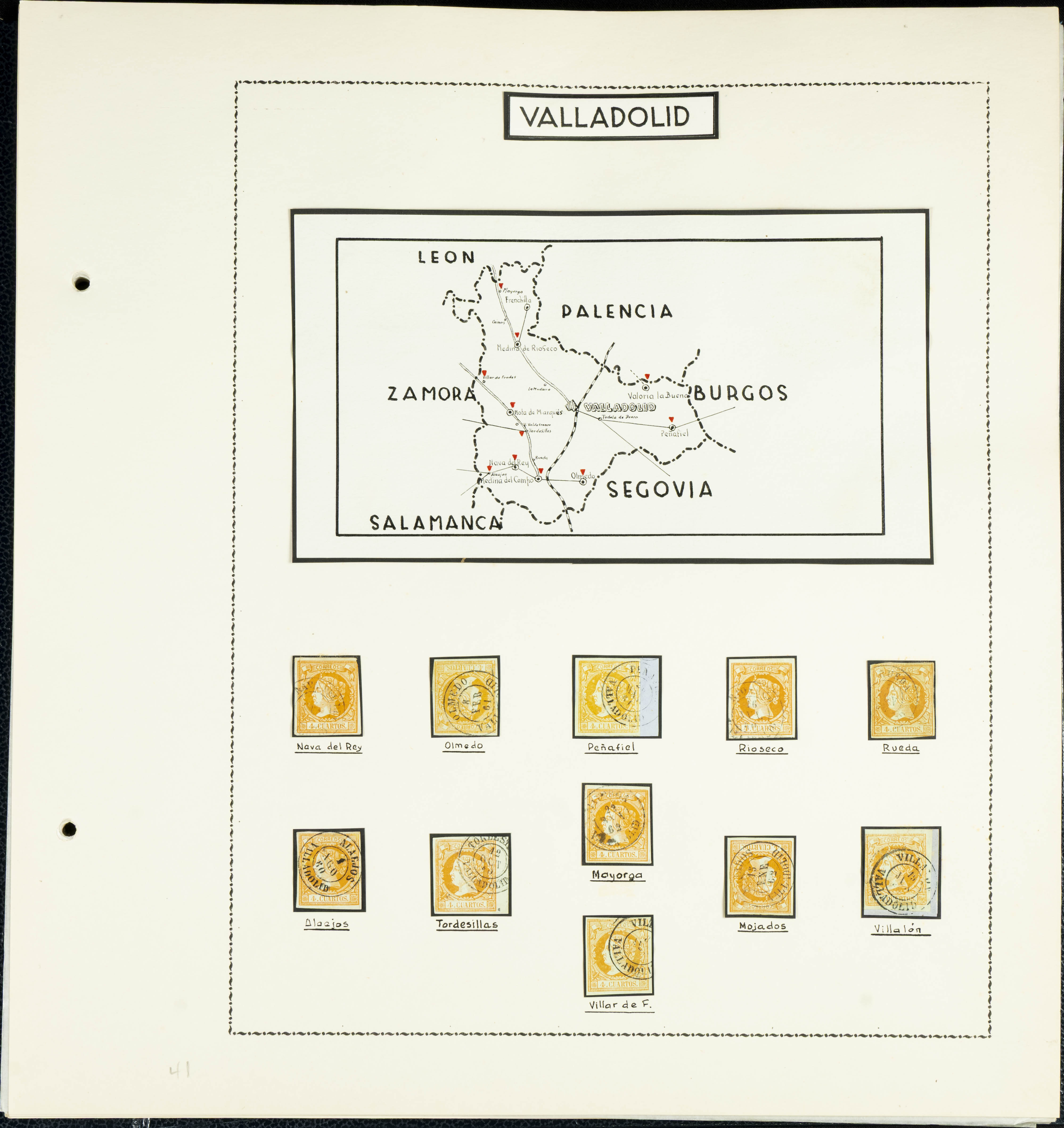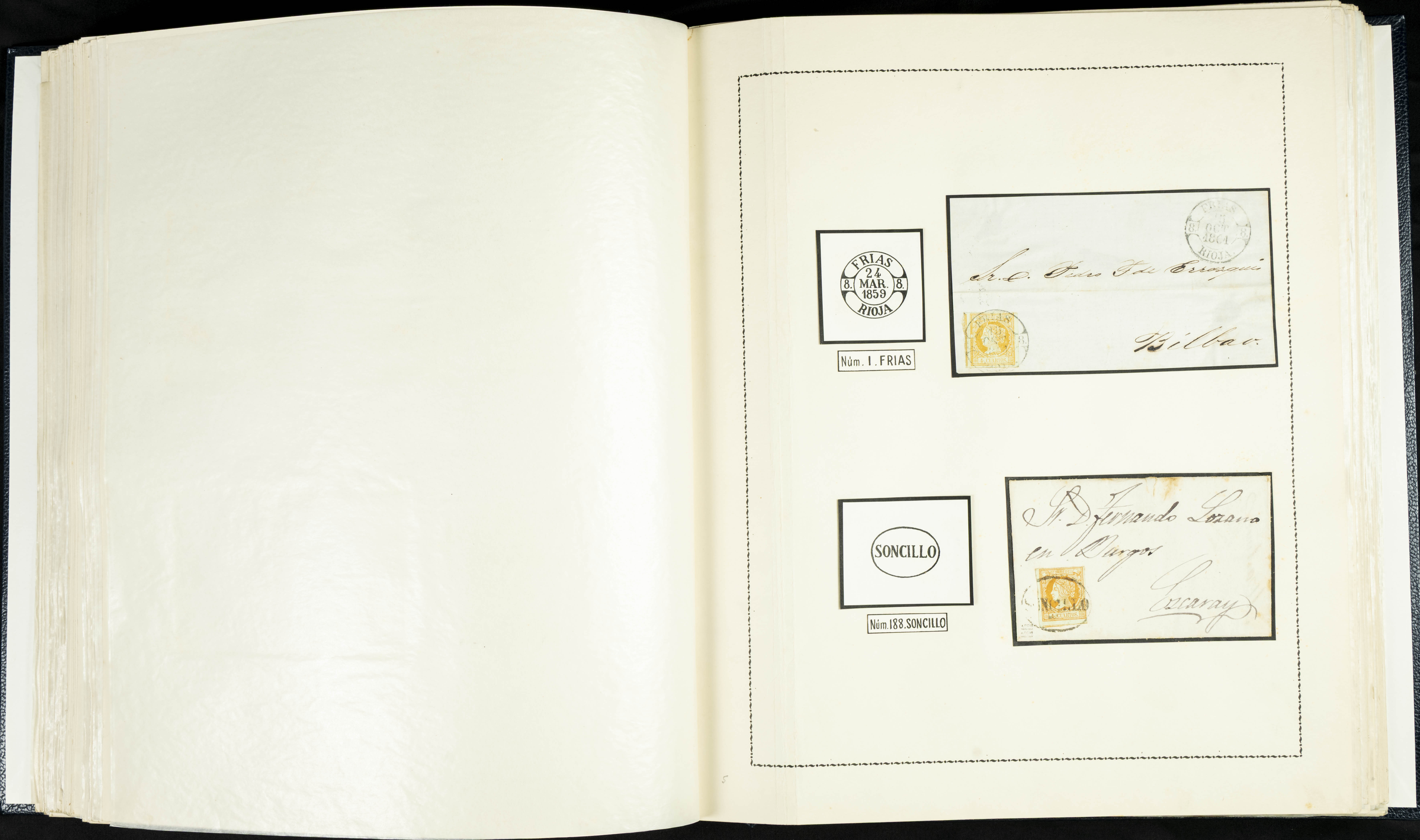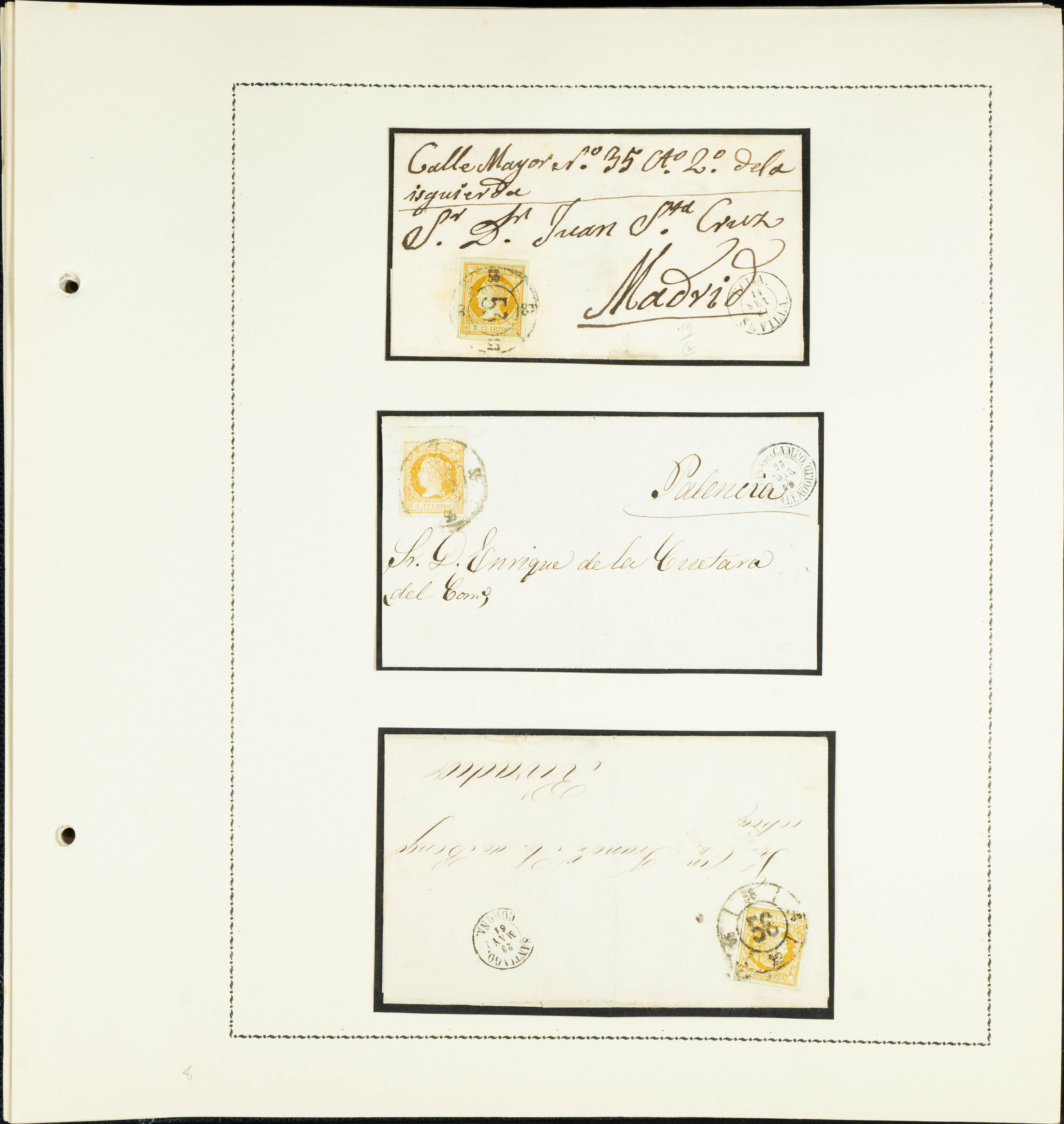 English 52. 1860. Spectacular collection of the yellow 4cuarto stamp, including countless stamps, blocks, fragments, and letters. Part of it is organized by province, especially the Type I and II date stamps. It includes a complete calendar of use, various clichés, a complete set of wagon wheel stamps, and almost a complete set of letter stamps, including the extremely rare No. 42. Individual highlights include a first-day cover stamp and letter, the perforated stamp used in Valencia on a letter (possibly the only one known), stamps and letters with pre-philatelic postmarks, and enormous blocks (spectacularly mounted in antique albums). A MUST-SEE.