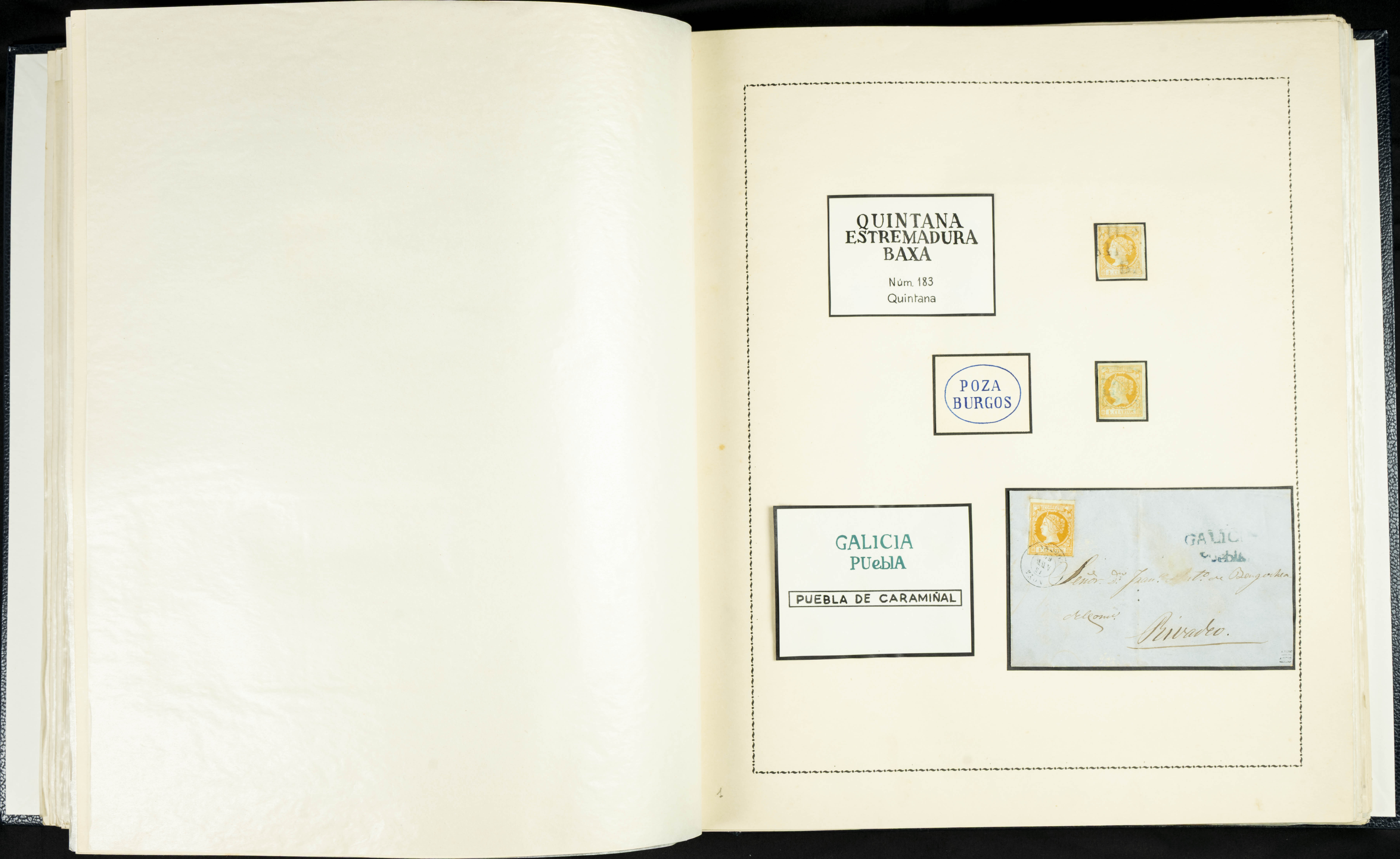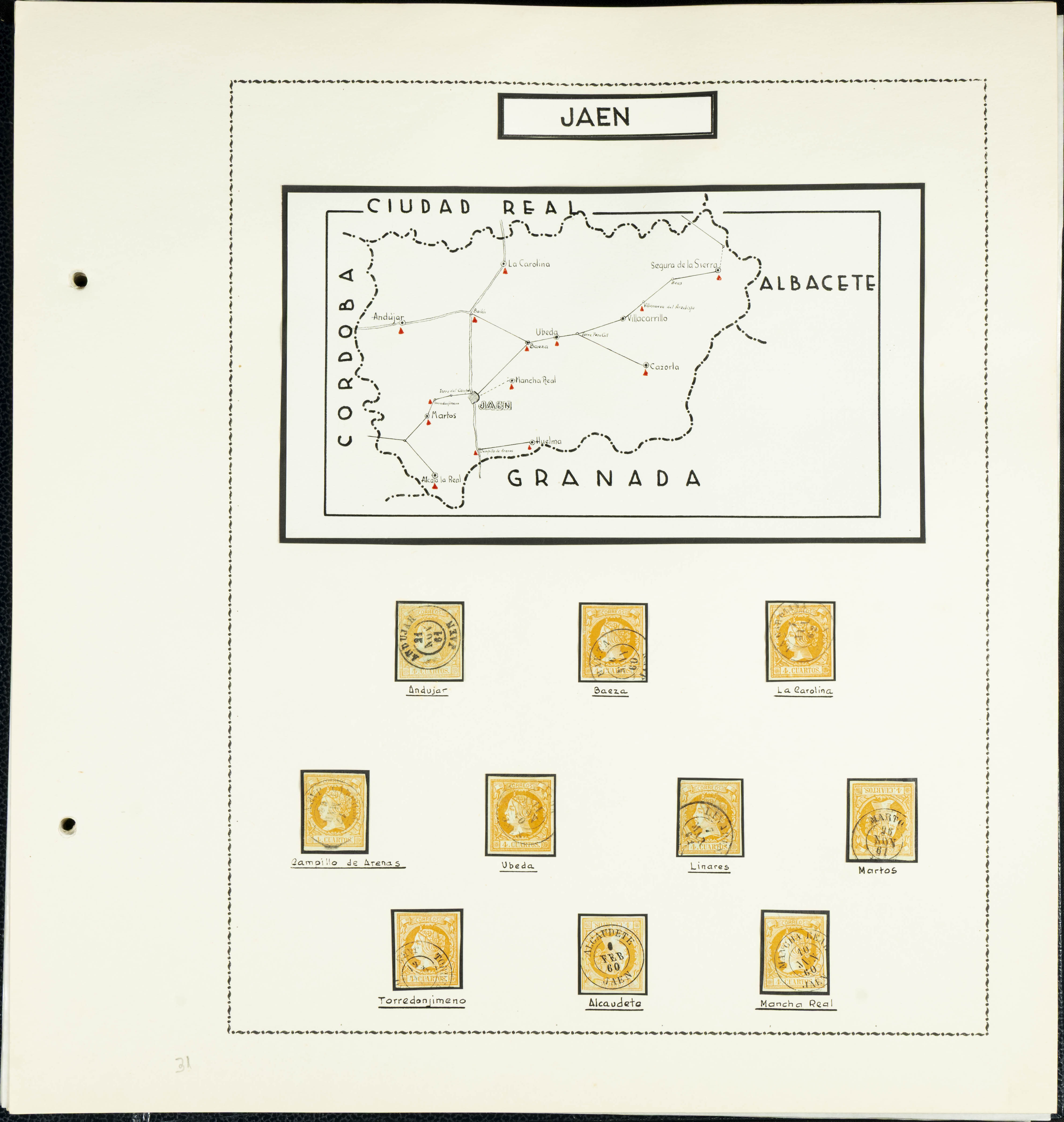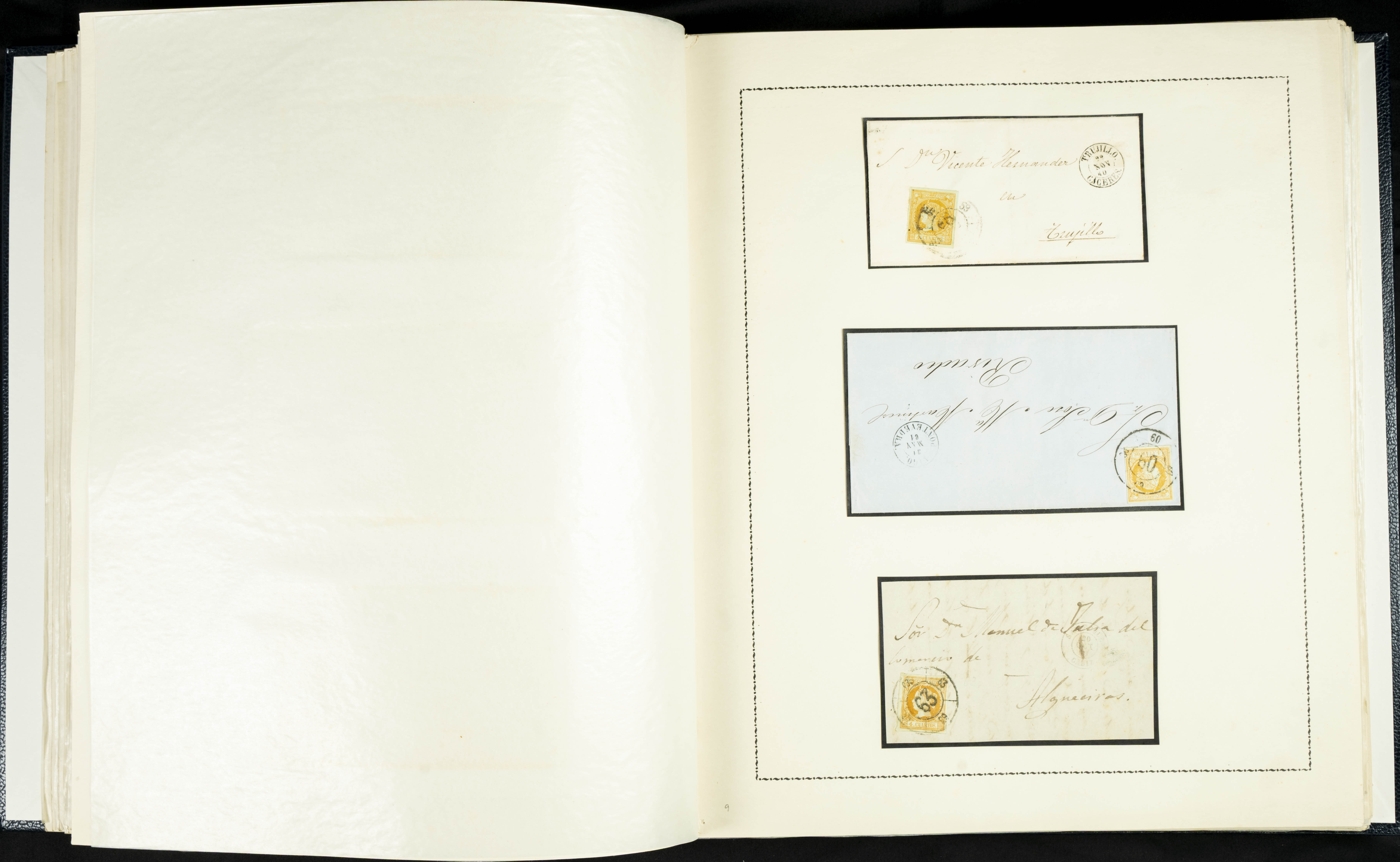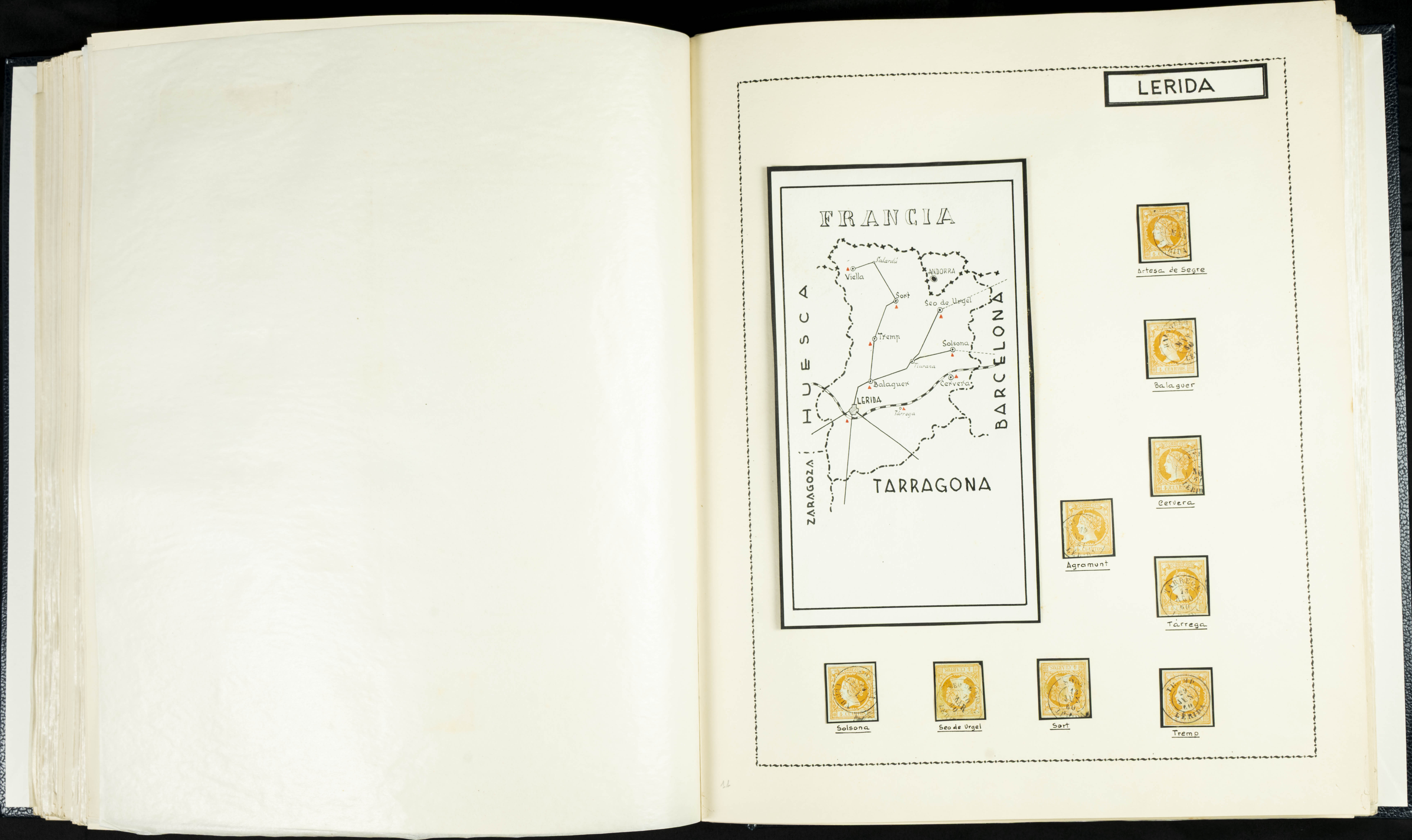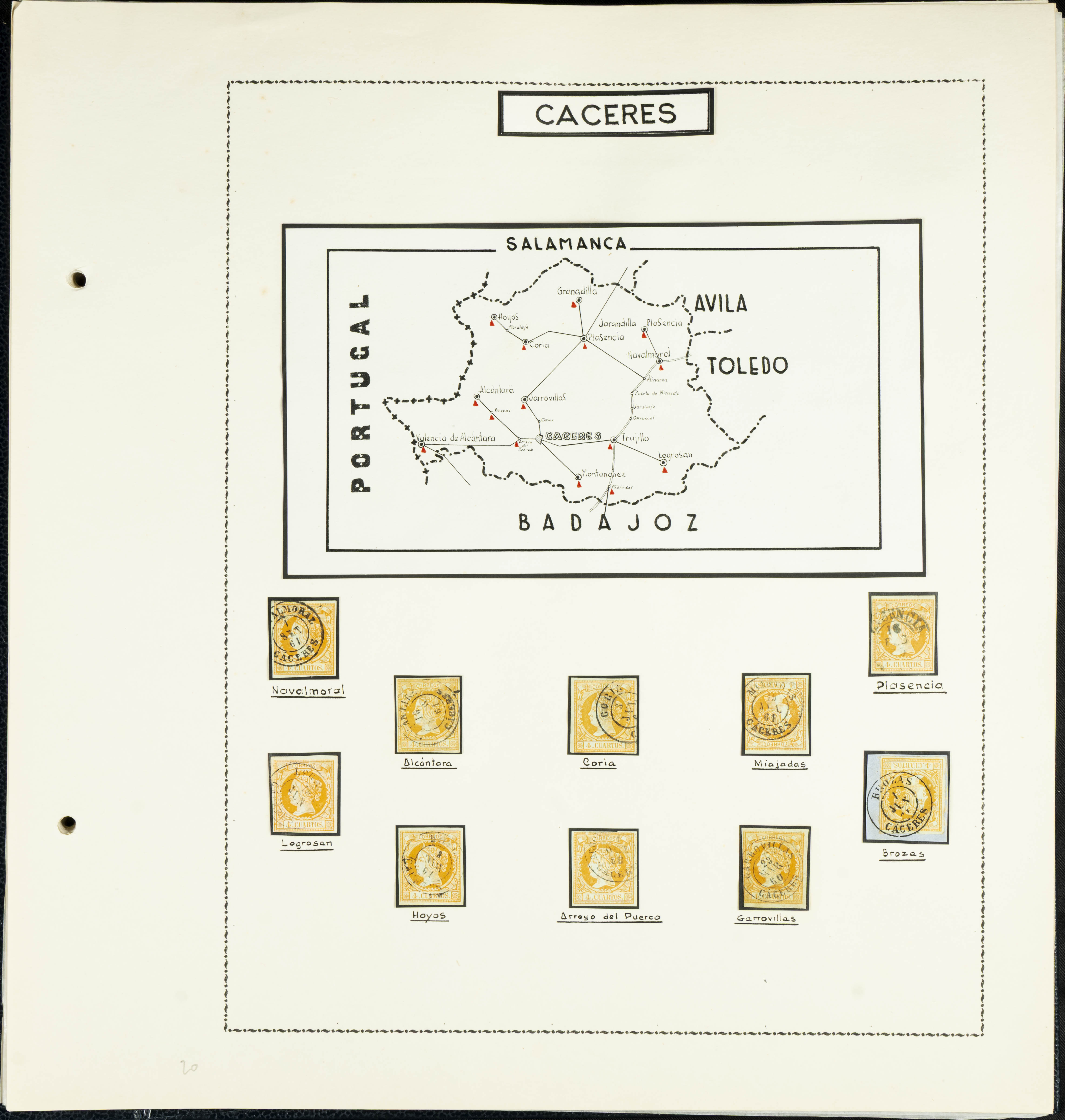 English 52. 1860. Spectacular collection of the yellow 4cuarto stamp, including countless stamps, blocks, fragments, and letters. Part of it is organized by province, especially the Type I and II date stamps. It includes a complete calendar of use, various clichés, a complete set of wagon wheel stamps, and almost a complete set of letter stamps, including the extremely rare No. 42. Individual highlights include a first-day cover stamp and letter, the perforated stamp used in Valencia on a letter (possibly the only one known), stamps and letters with pre-philatelic postmarks, and enormous blocks (spectacularly mounted in antique albums). A MUST-SEE.