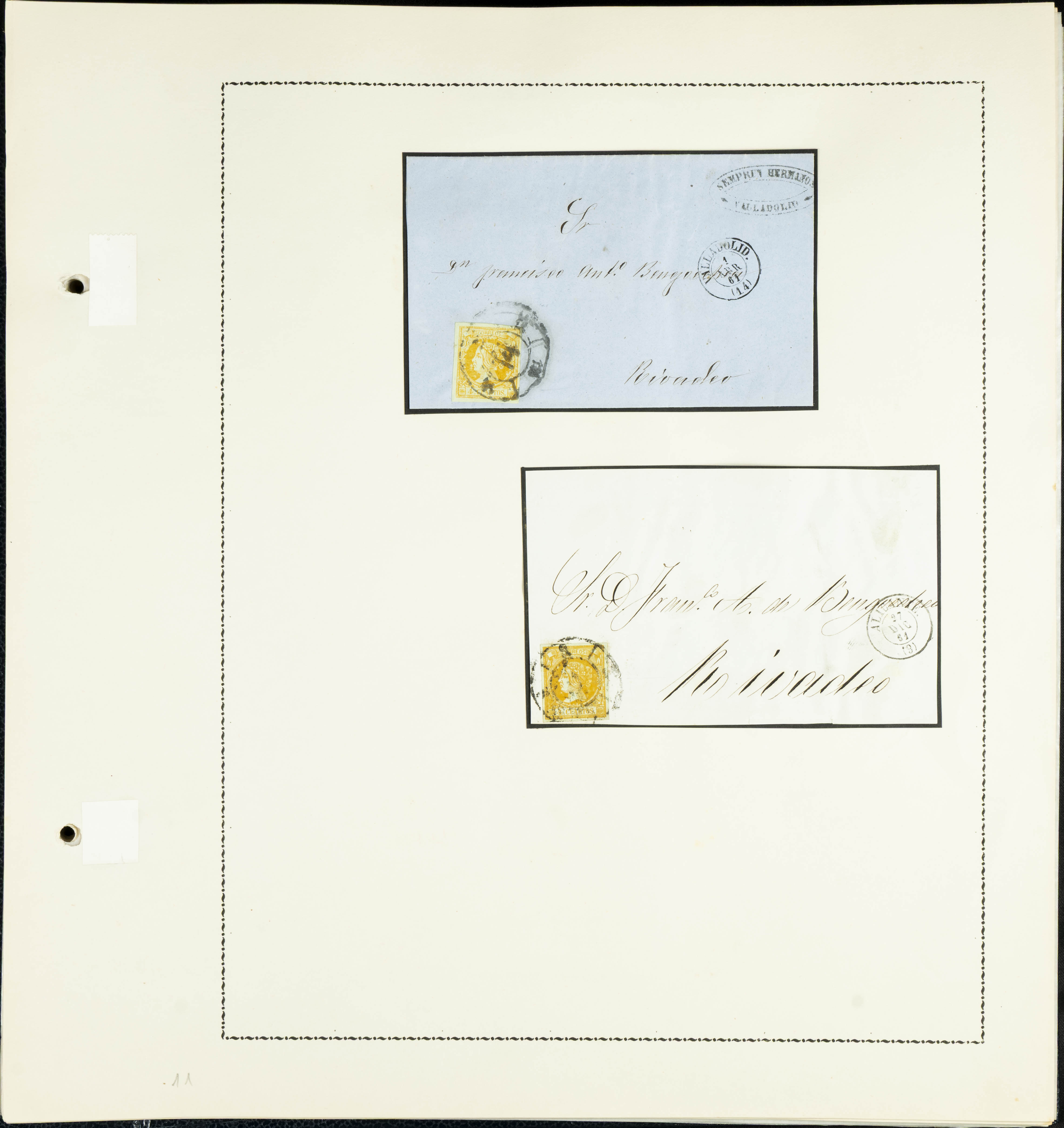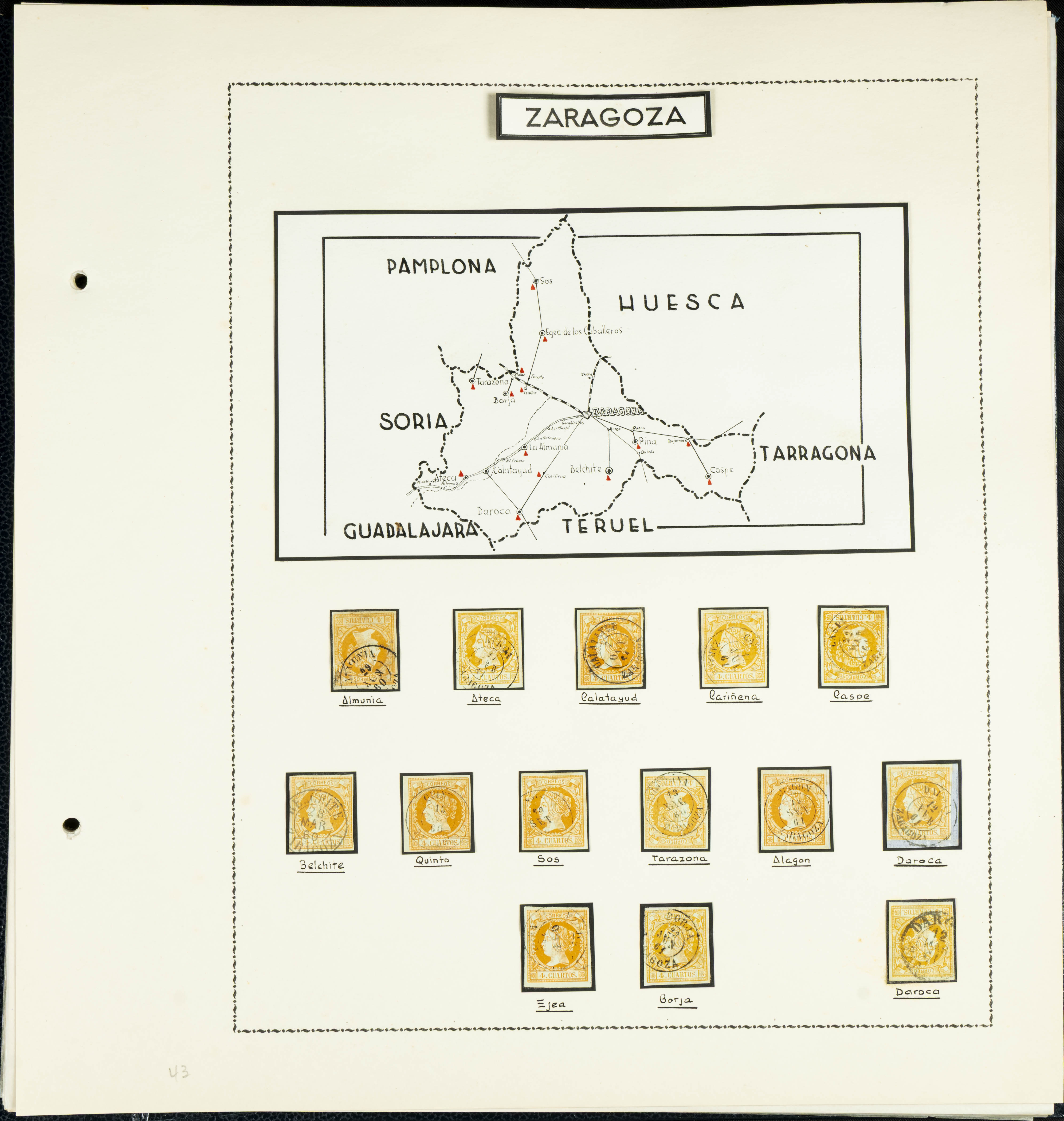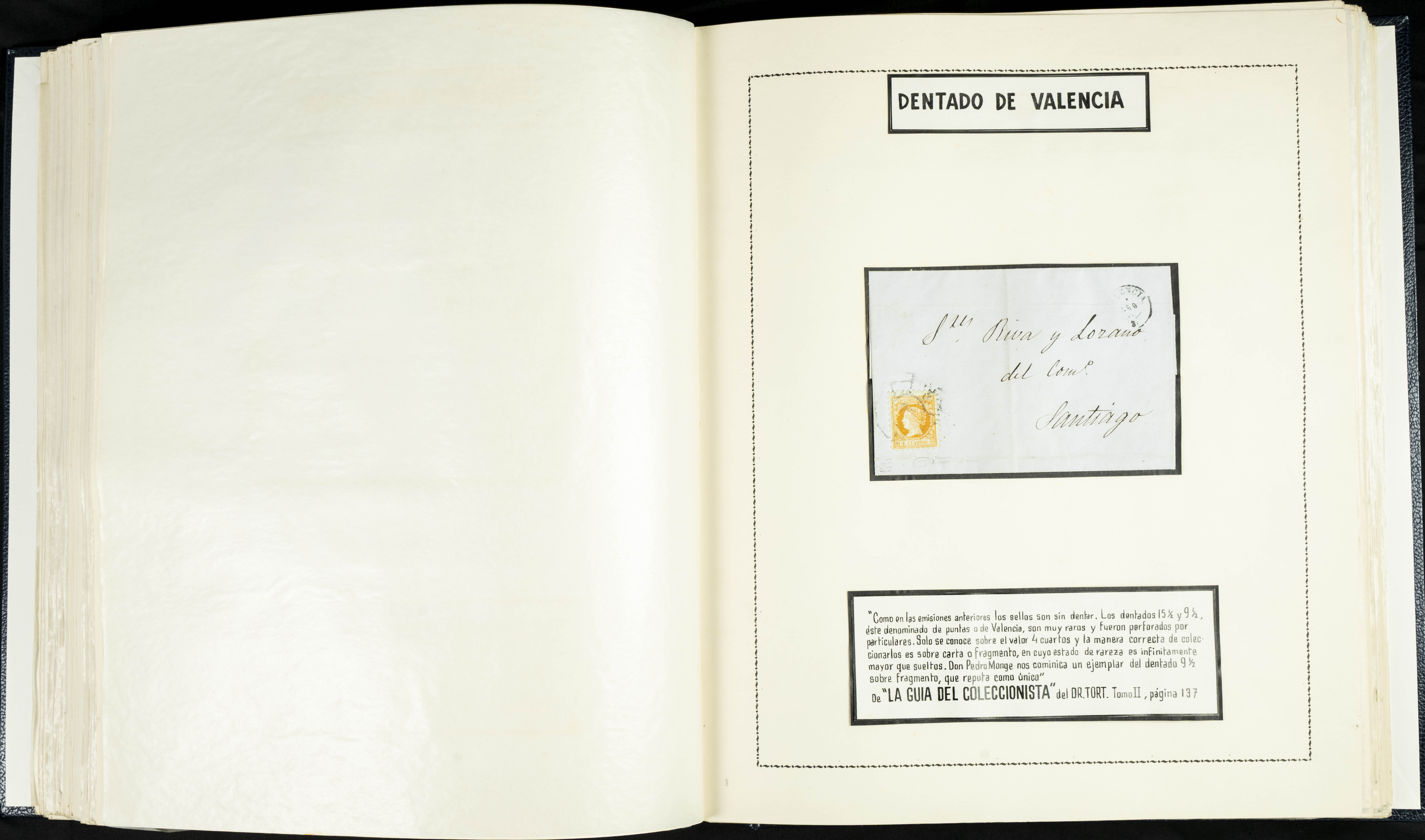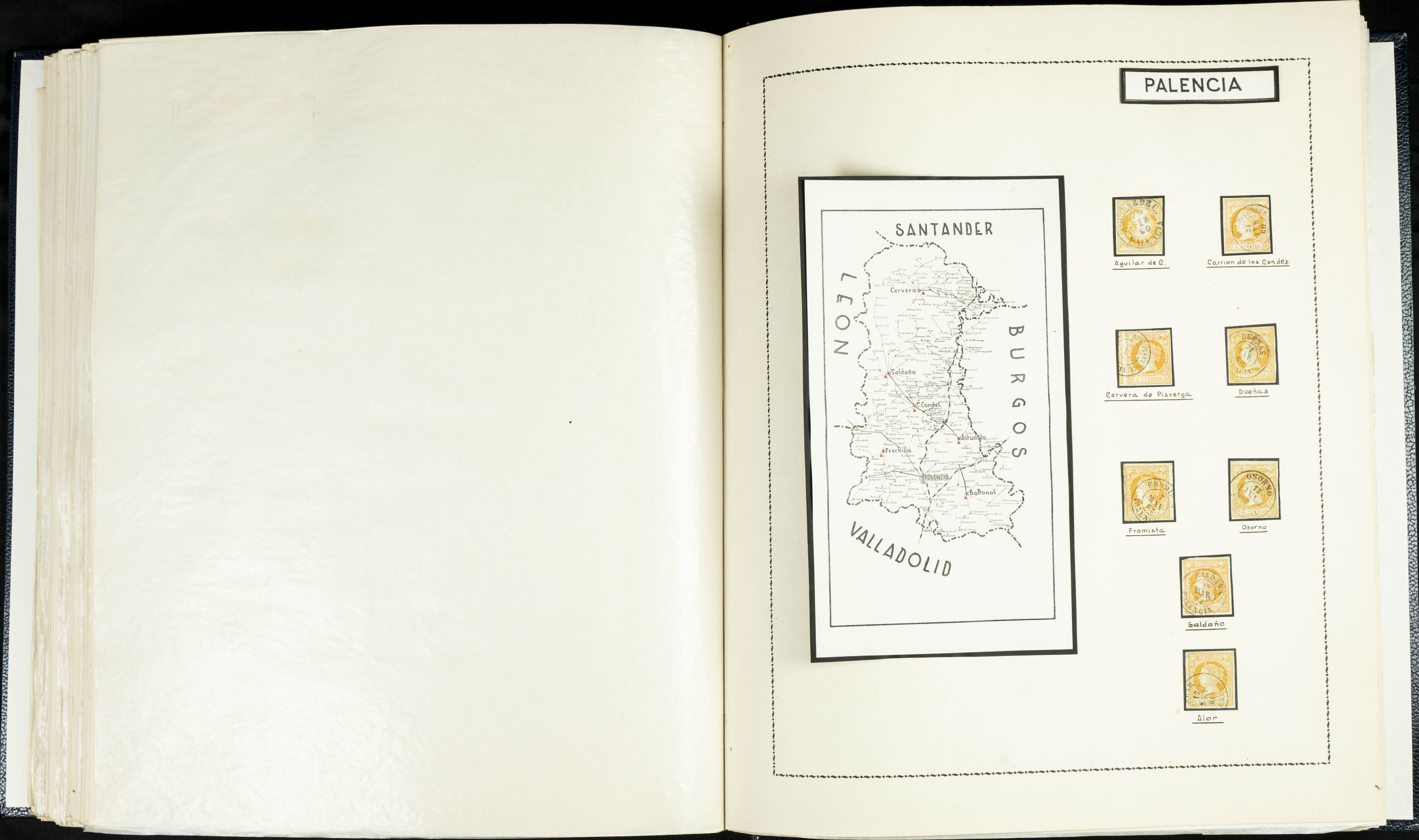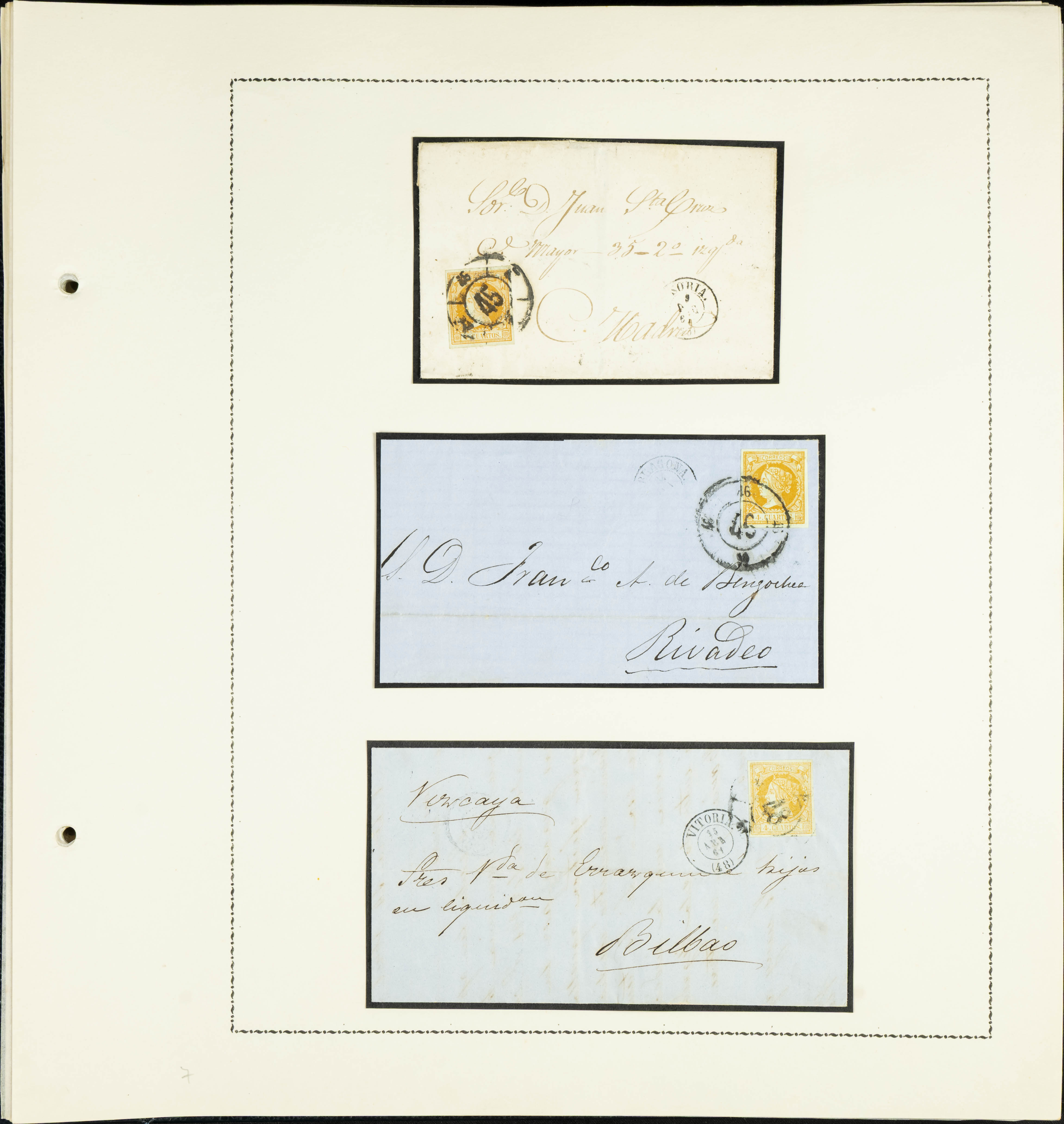 English 52. 1860. Spectacular collection of the yellow 4cuarto stamp, including countless stamps, blocks, fragments, and letters. Part of it is organized by province, especially the Type I and II date stamps. It includes a complete calendar of use, various clichés, a complete set of wagon wheel stamps, and almost a complete set of letter stamps, including the extremely rare No. 42. Individual highlights include a first-day cover stamp and letter, the perforated stamp used in Valencia on a letter (possibly the only one known), stamps and letters with pre-philatelic postmarks, and enormous blocks (spectacularly mounted in antique albums). A MUST-SEE.