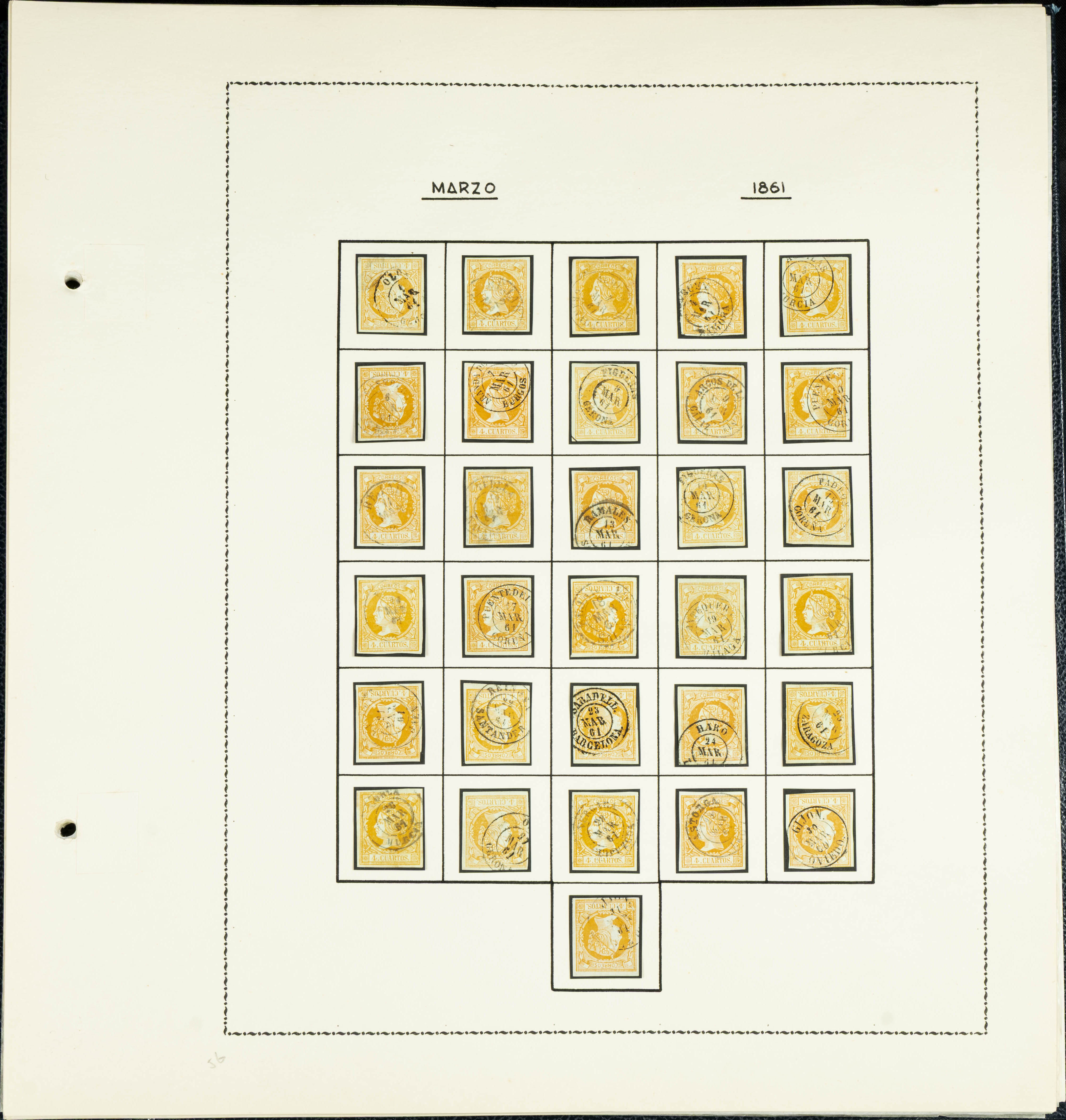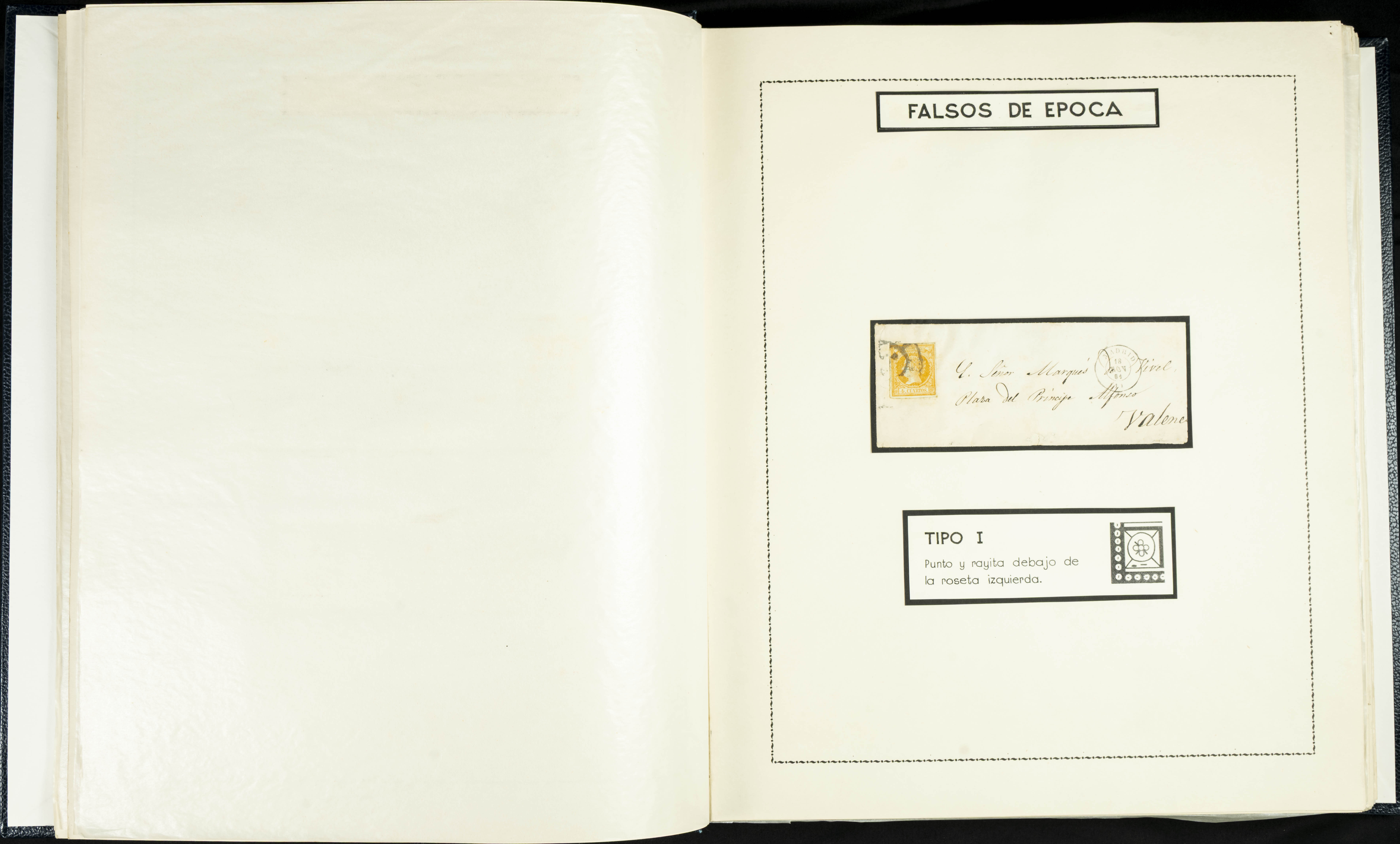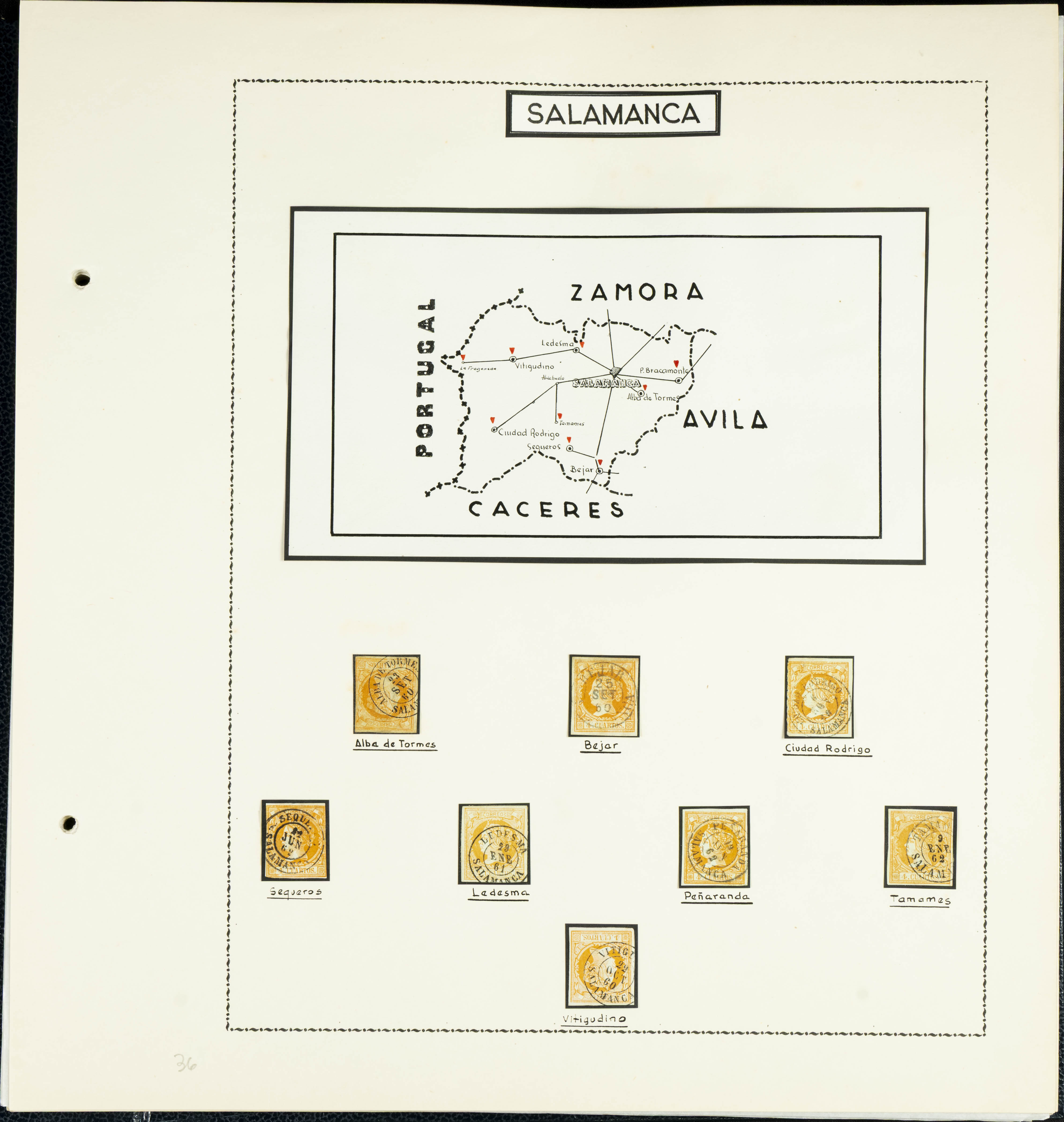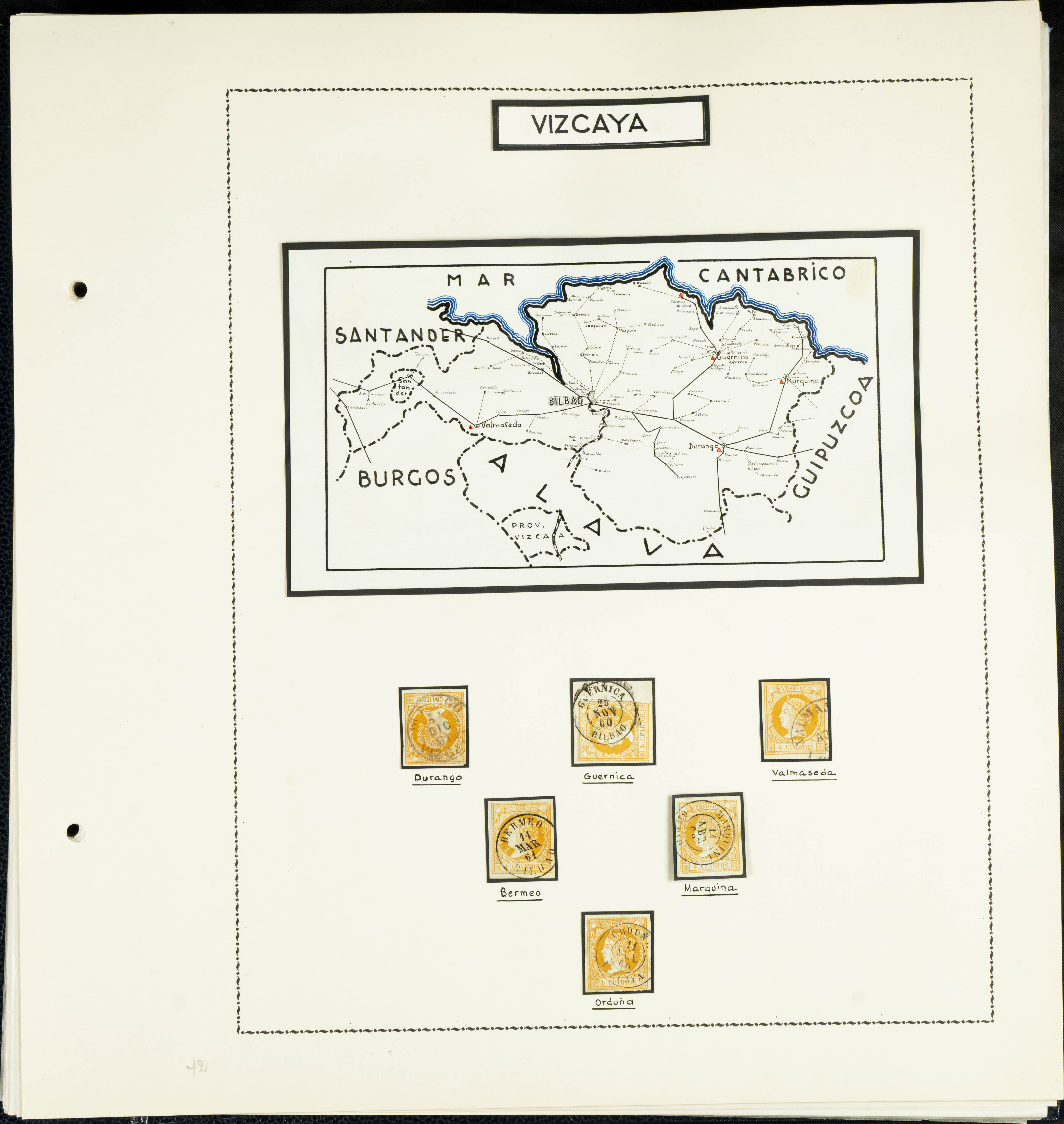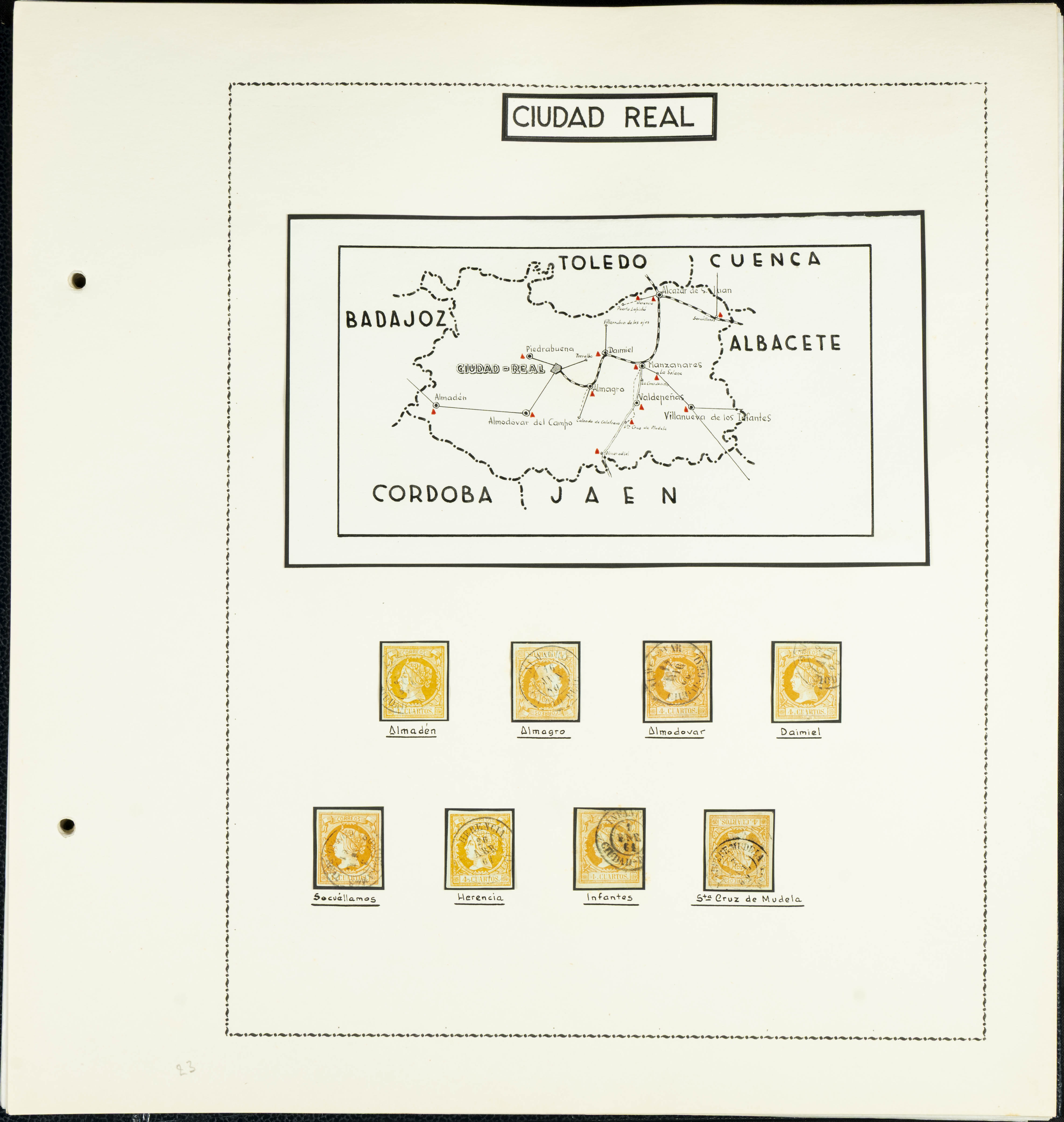 English 52. 1860. Spectacular collection of the yellow 4cuarto stamp, including countless stamps, blocks, fragments, and letters. Part of it is organized by province, especially the Type I and II date stamps. It includes a complete calendar of use, various clichés, a complete set of wagon wheel stamps, and almost a complete set of letter stamps, including the extremely rare No. 42. Individual highlights include a first-day cover stamp and letter, the perforated stamp used in Valencia on a letter (possibly the only one known), stamps and letters with pre-philatelic postmarks, and enormous blocks (spectacularly mounted in antique albums). A MUST-SEE.
