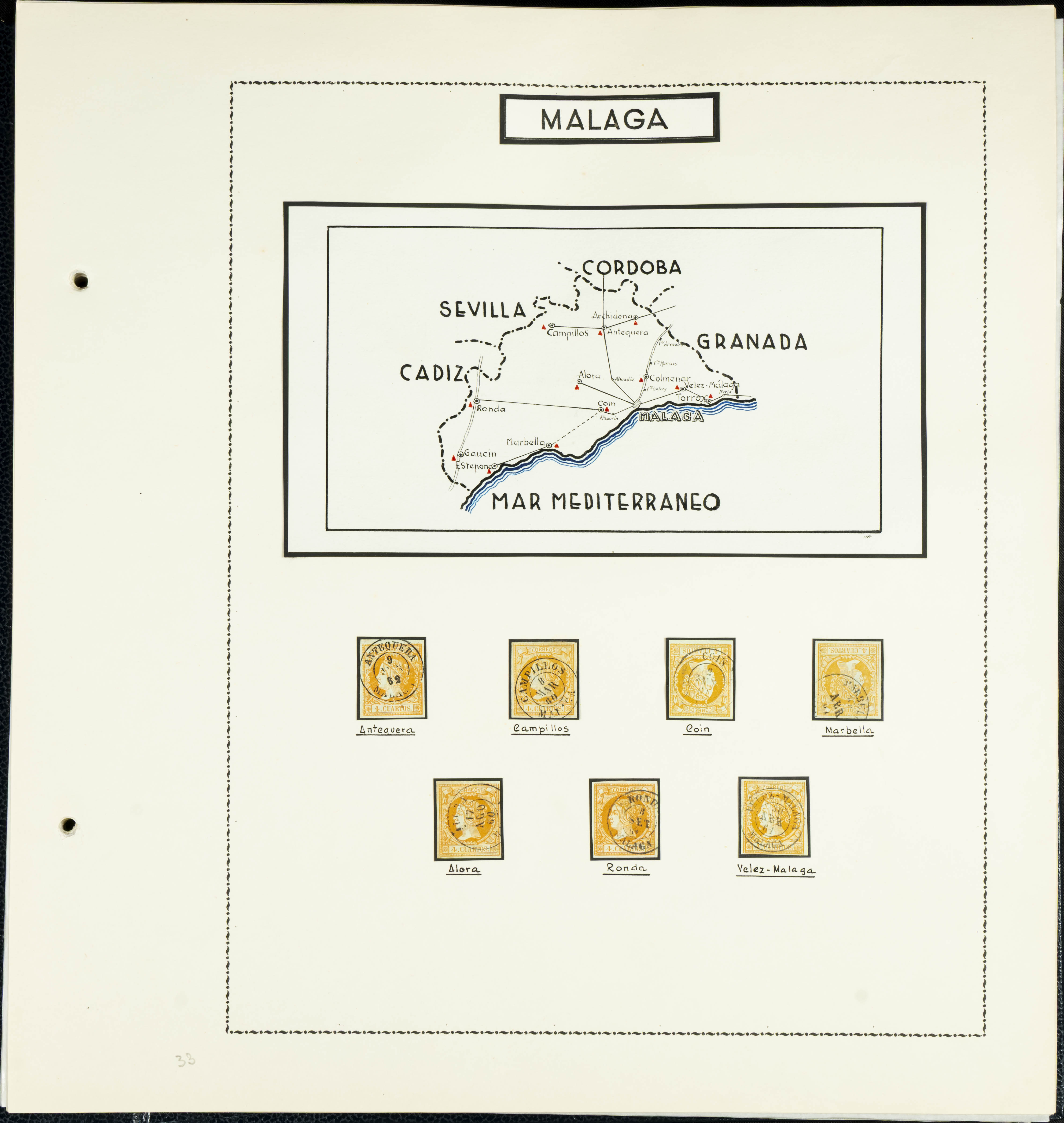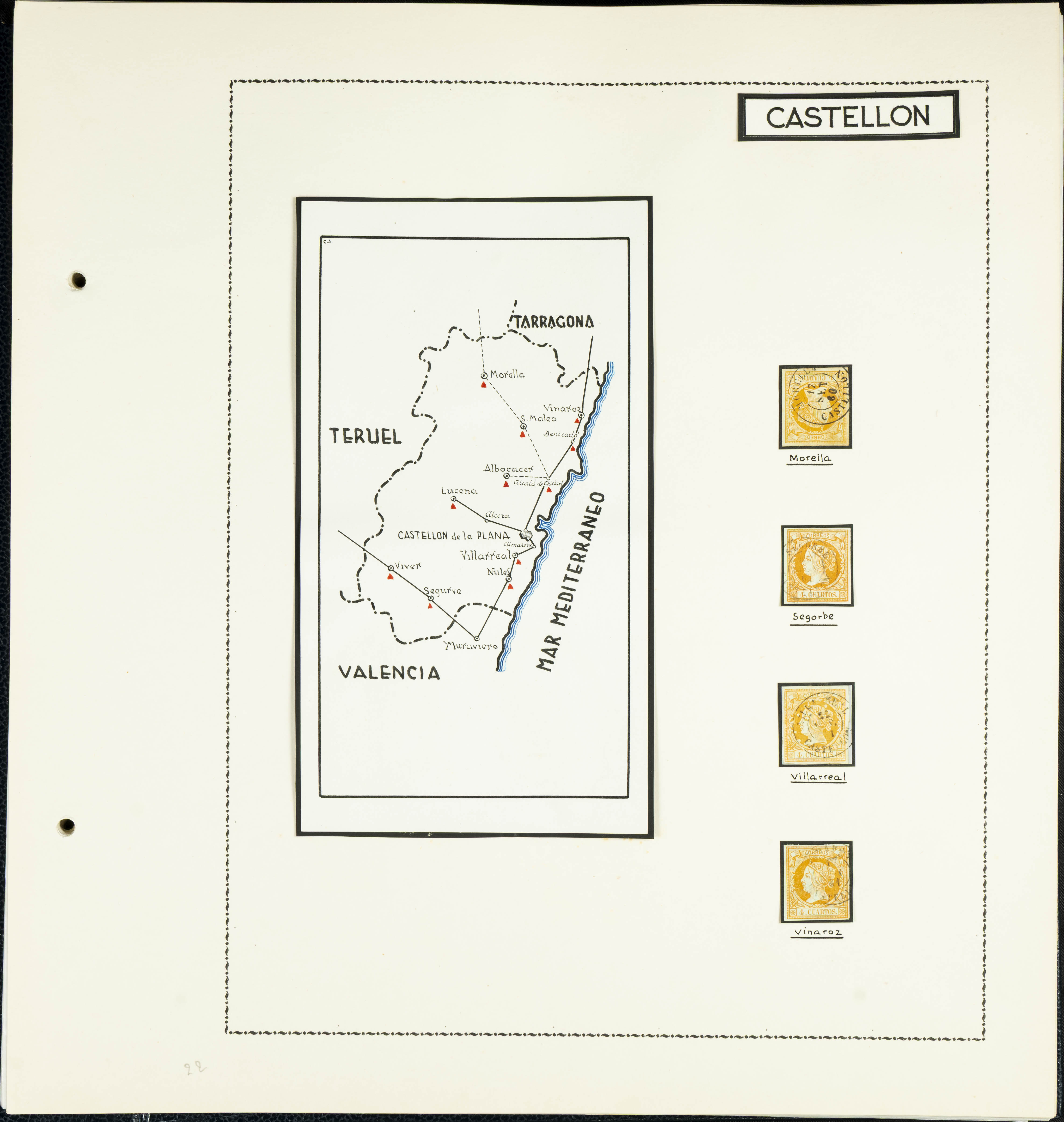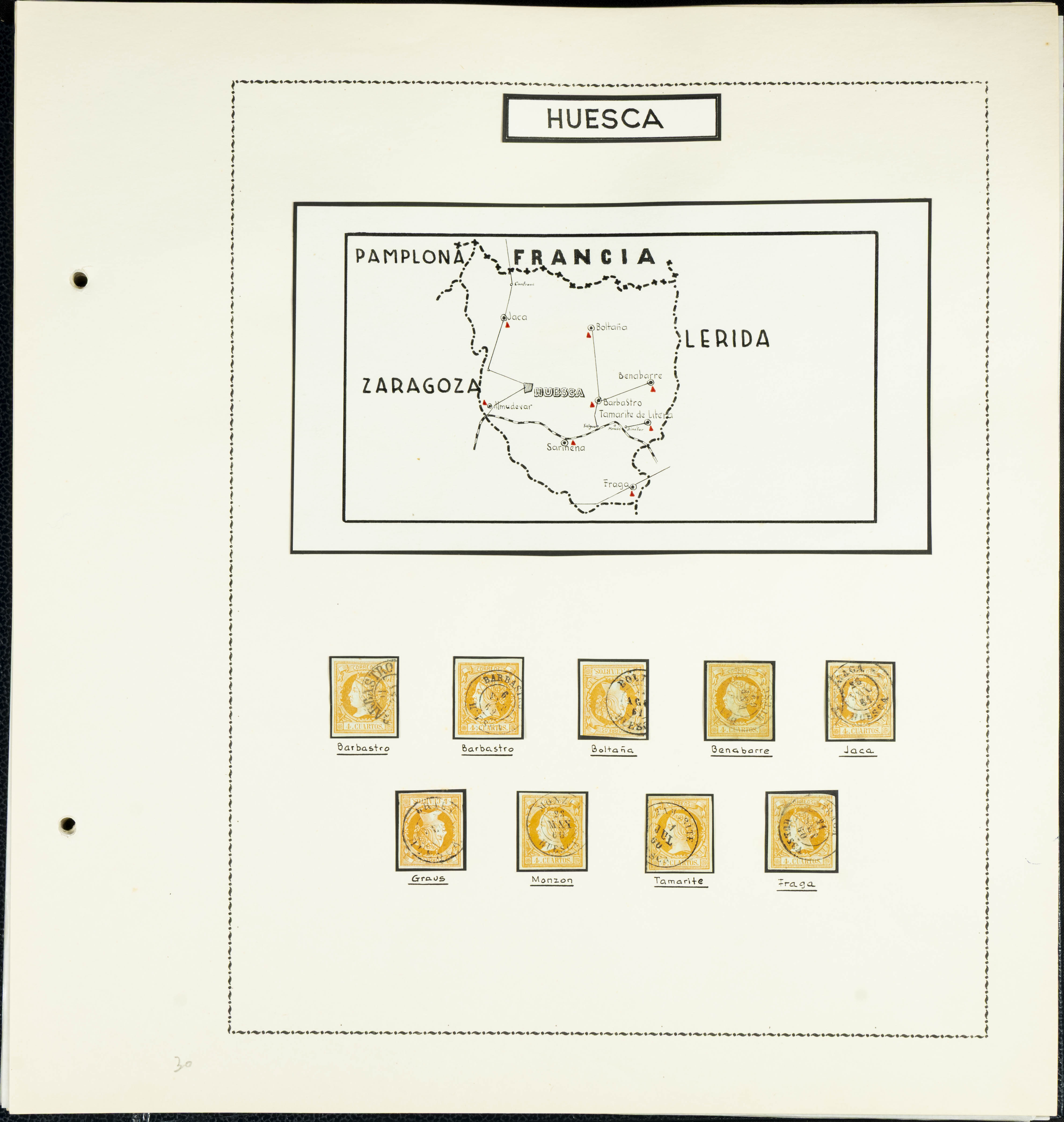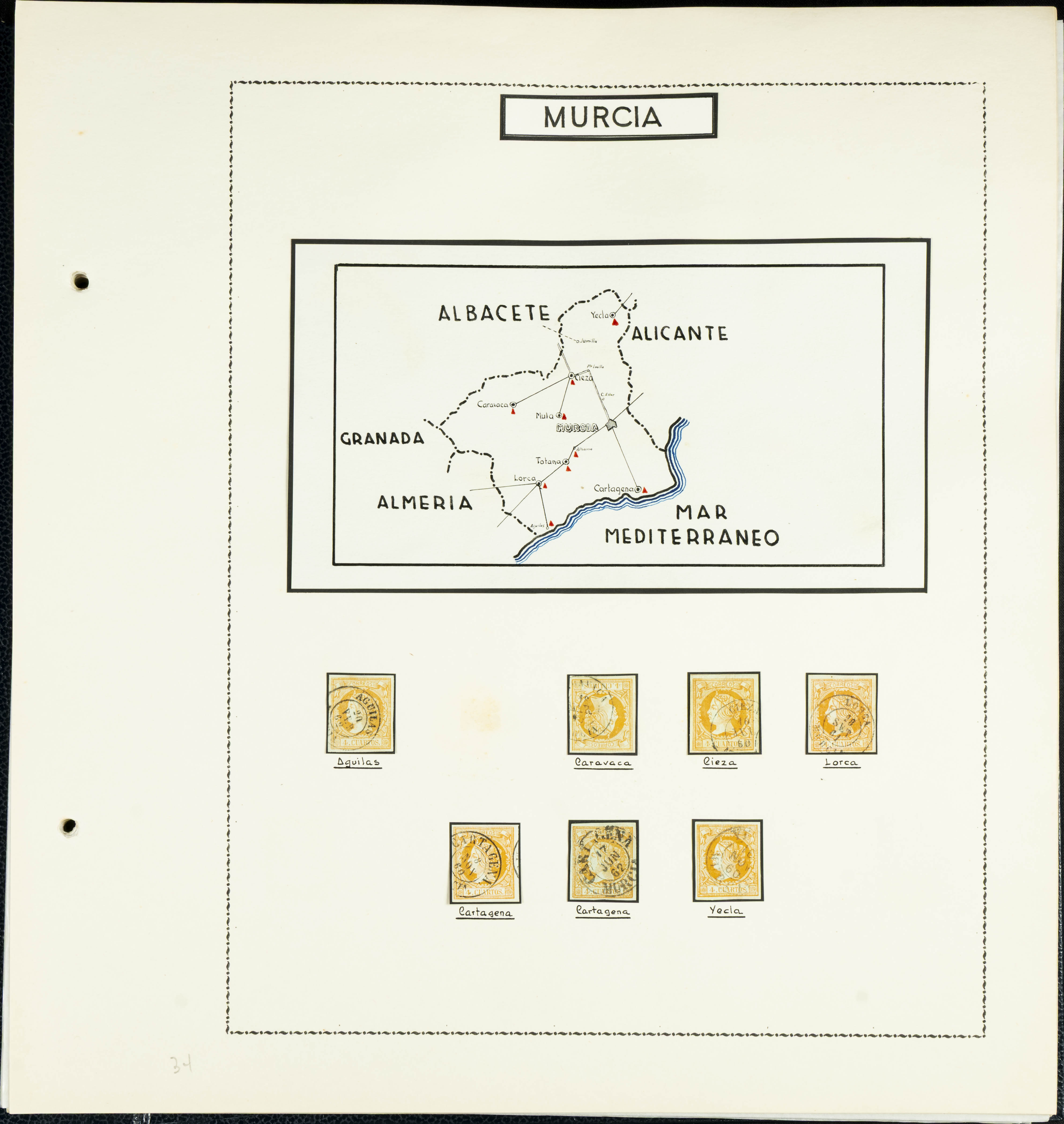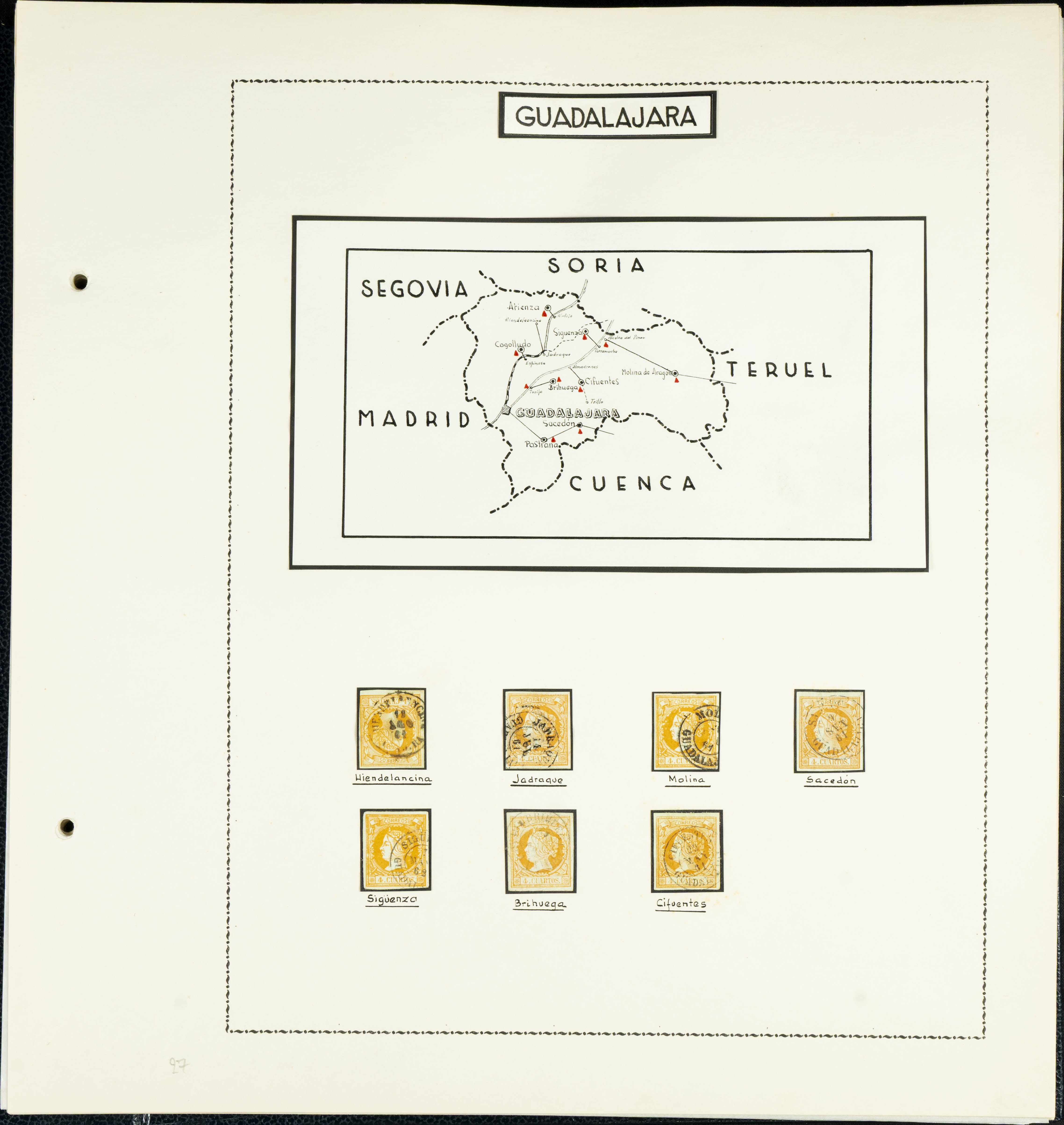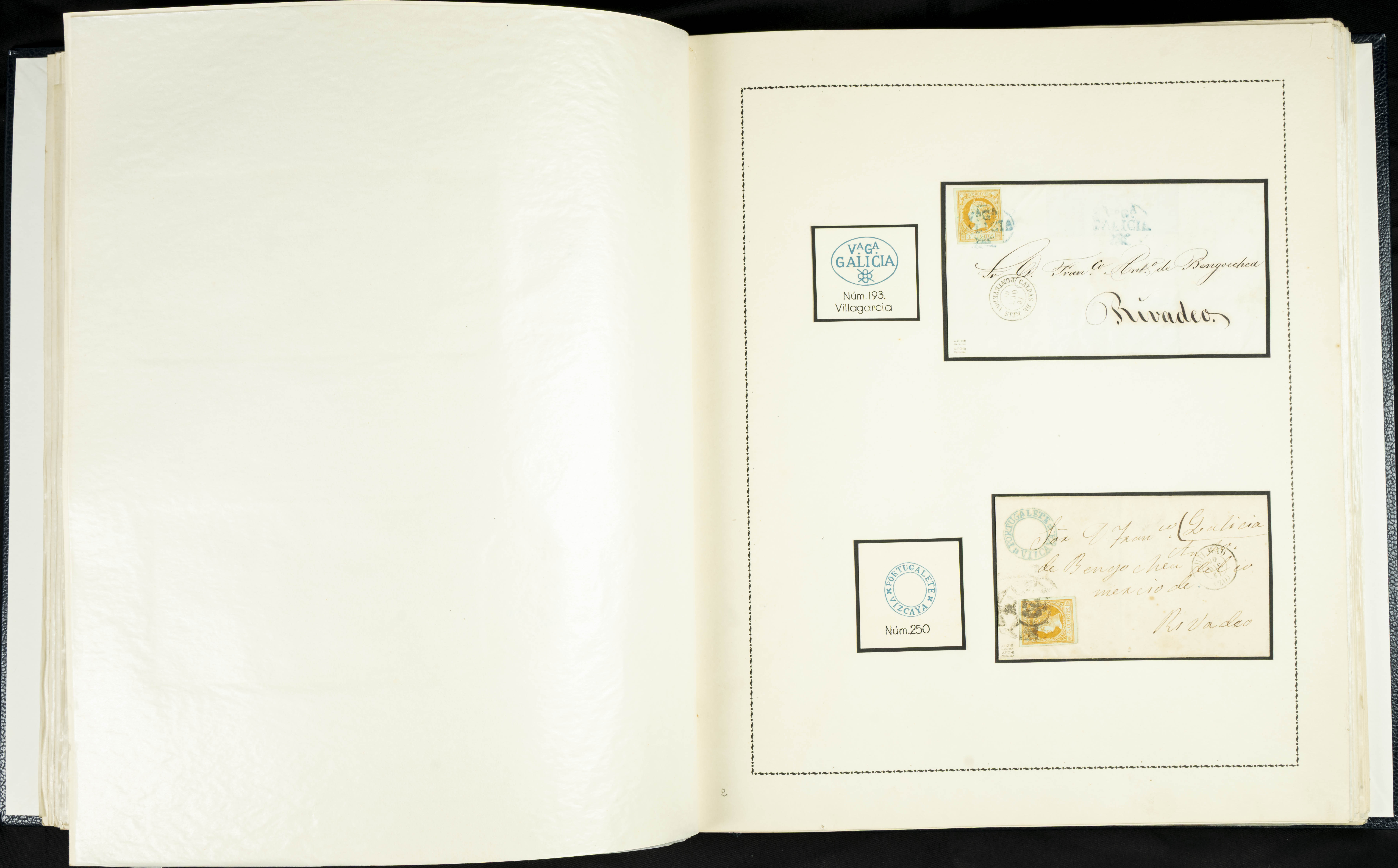 English 52. 1860. Spectacular collection of the yellow 4cuarto stamp, including countless stamps, blocks, fragments, and letters. Part of it is organized by province, especially the Type I and II date stamps. It includes a complete calendar of use, various clichés, a complete set of wagon wheel stamps, and almost a complete set of letter stamps, including the extremely rare No. 42. Individual highlights include a first-day cover stamp and letter, the perforated stamp used in Valencia on a letter (possibly the only one known), stamps and letters with pre-philatelic postmarks, and enormous blocks (spectacularly mounted in antique albums). A MUST-SEE.