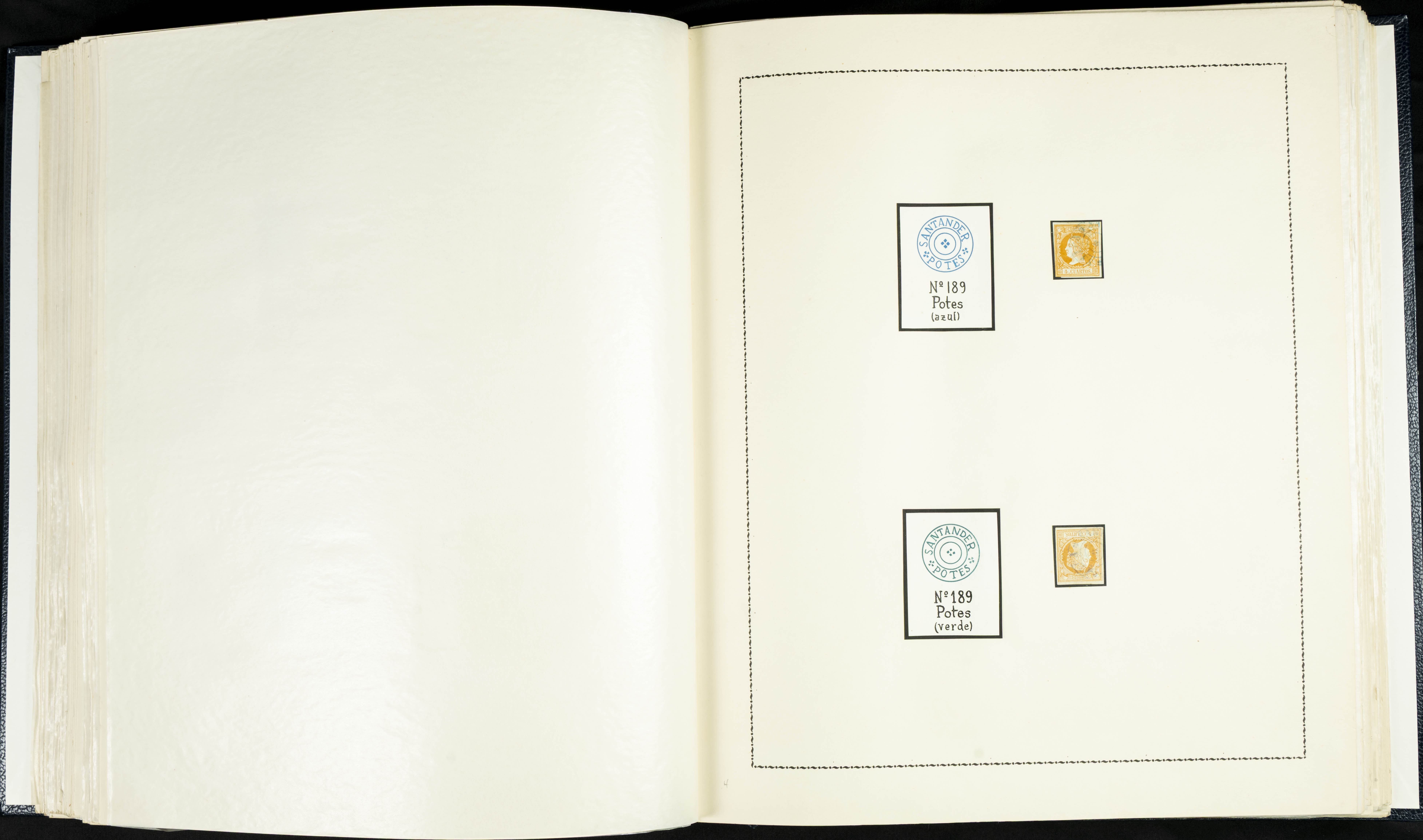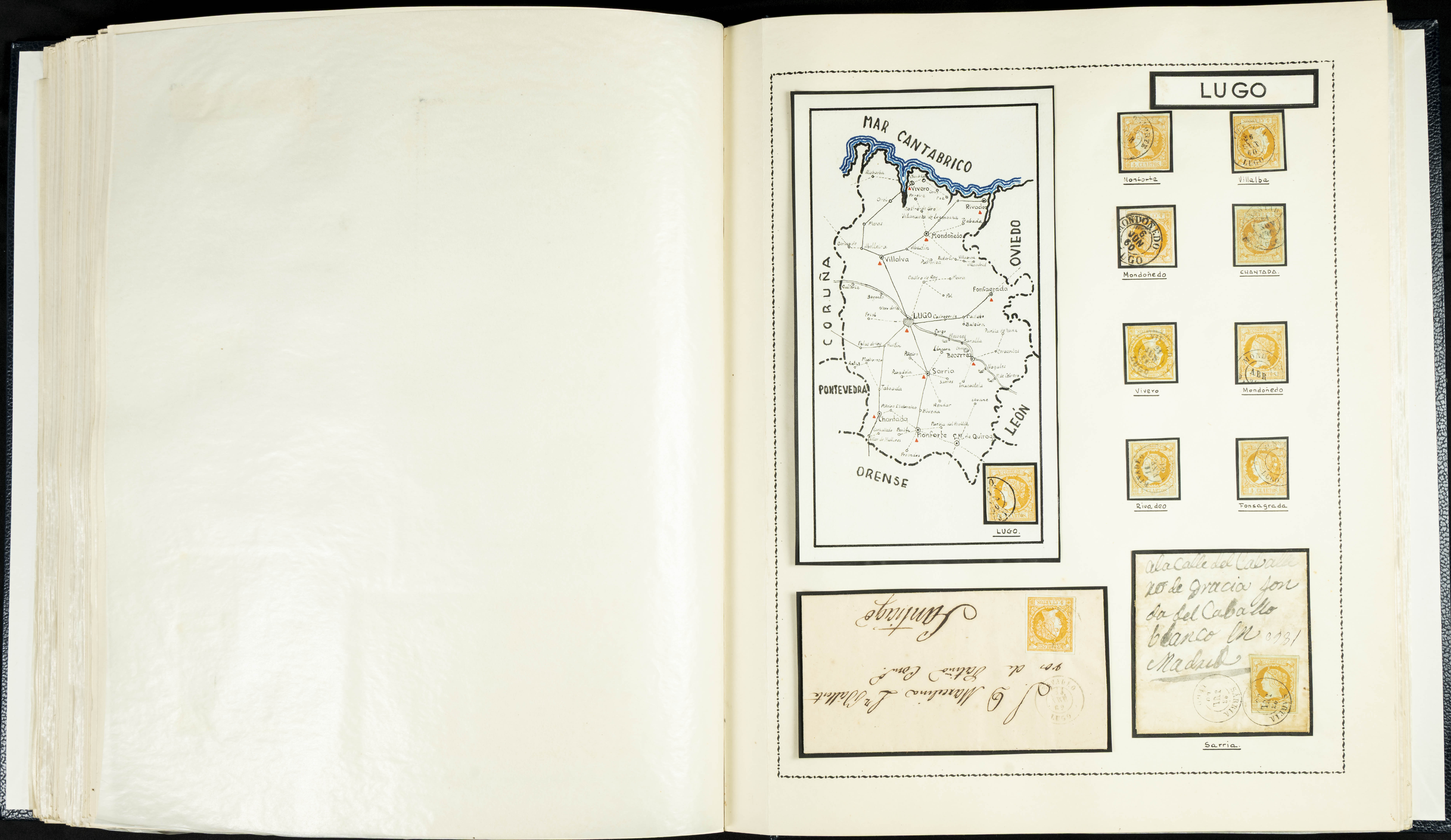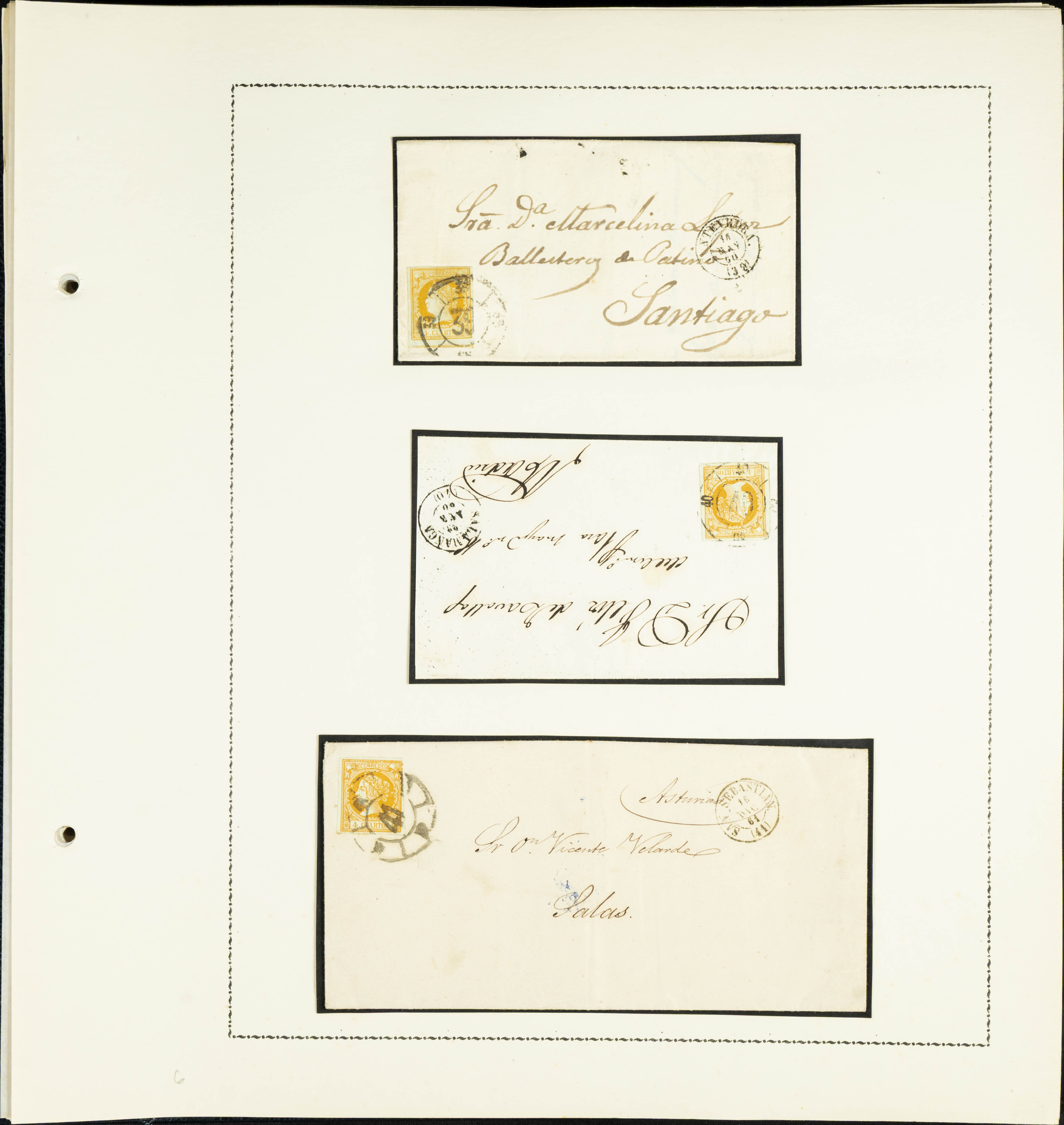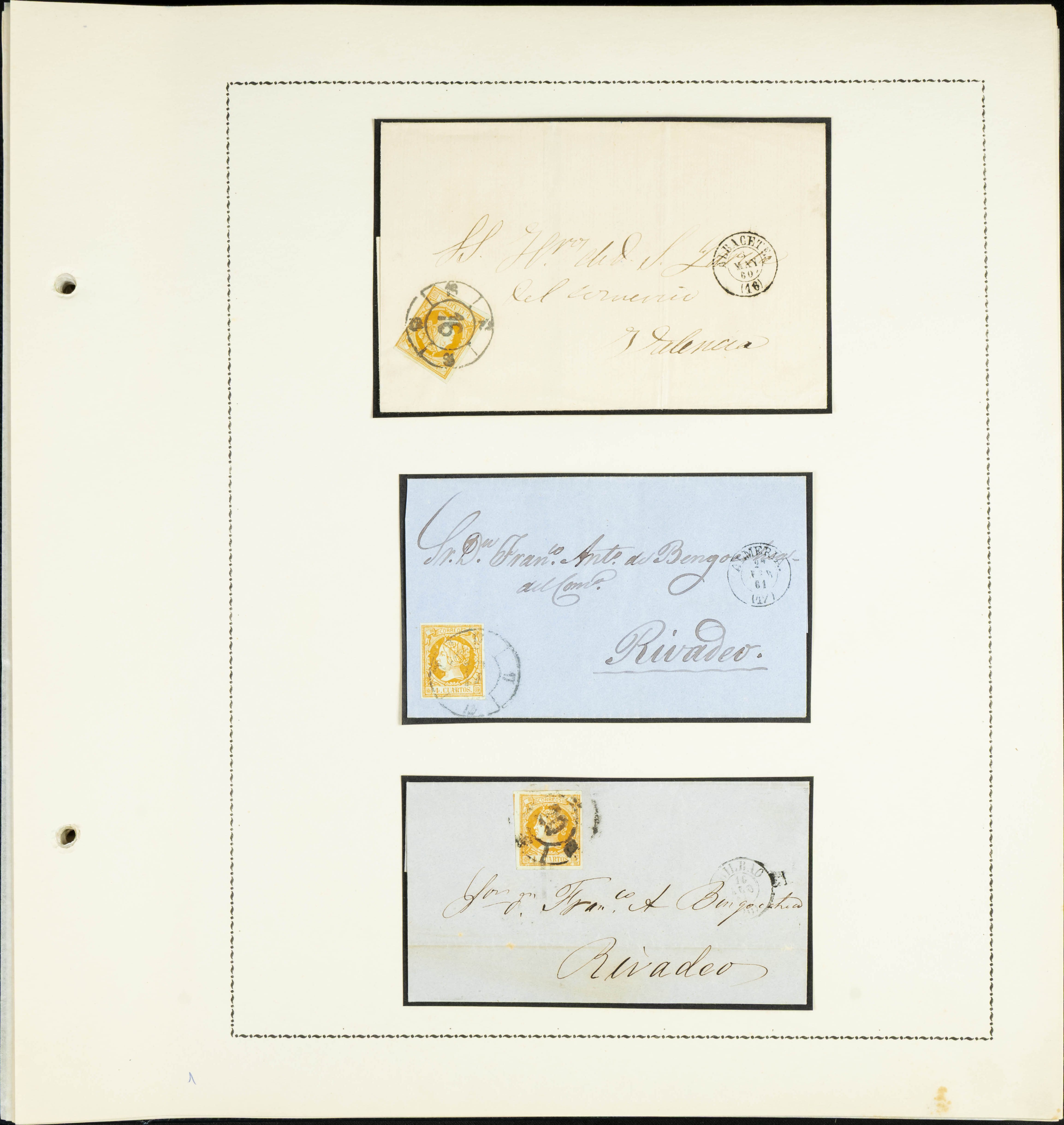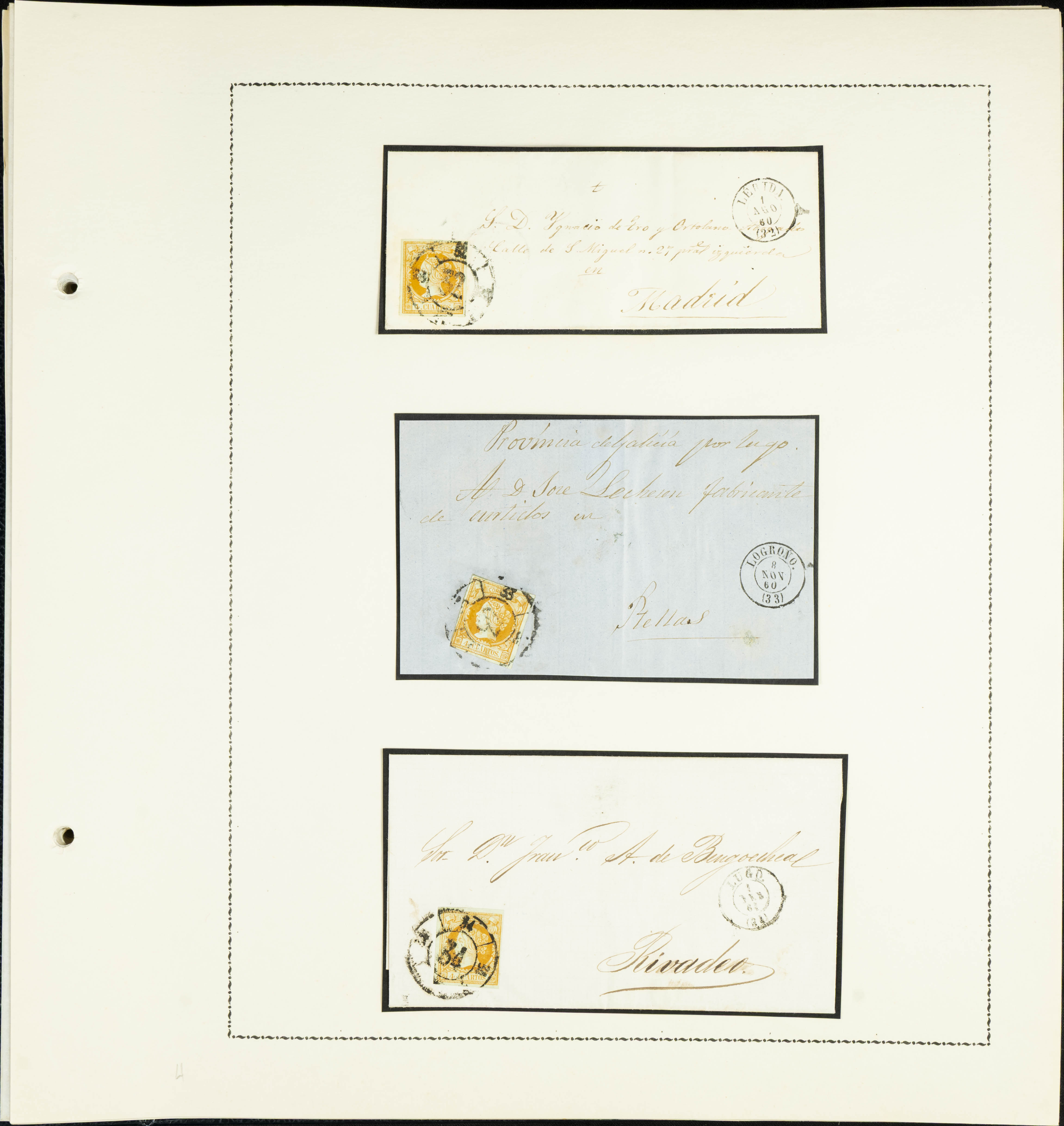 English 52. 1860. Spectacular collection of the yellow 4cuarto stamp, including countless stamps, blocks, fragments, and letters. Part of it is organized by province, especially the Type I and II date stamps. It includes a complete calendar of use, various clichés, a complete set of wagon wheel stamps, and almost a complete set of letter stamps, including the extremely rare No. 42. Individual highlights include a first-day cover stamp and letter, the perforated stamp used in Valencia on a letter (possibly the only one known), stamps and letters with pre-philatelic postmarks, and enormous blocks (spectacularly mounted in antique albums). A MUST-SEE.