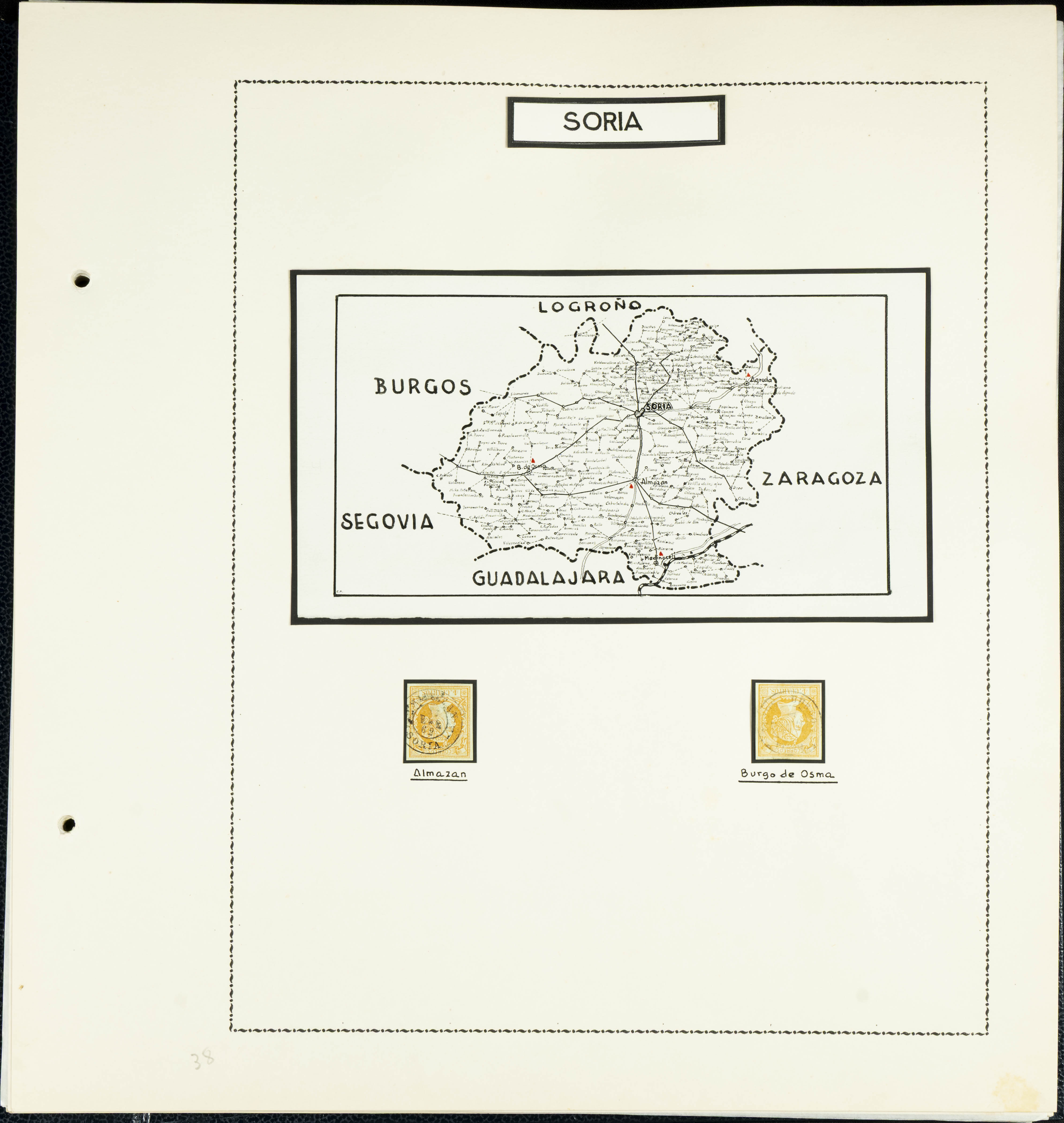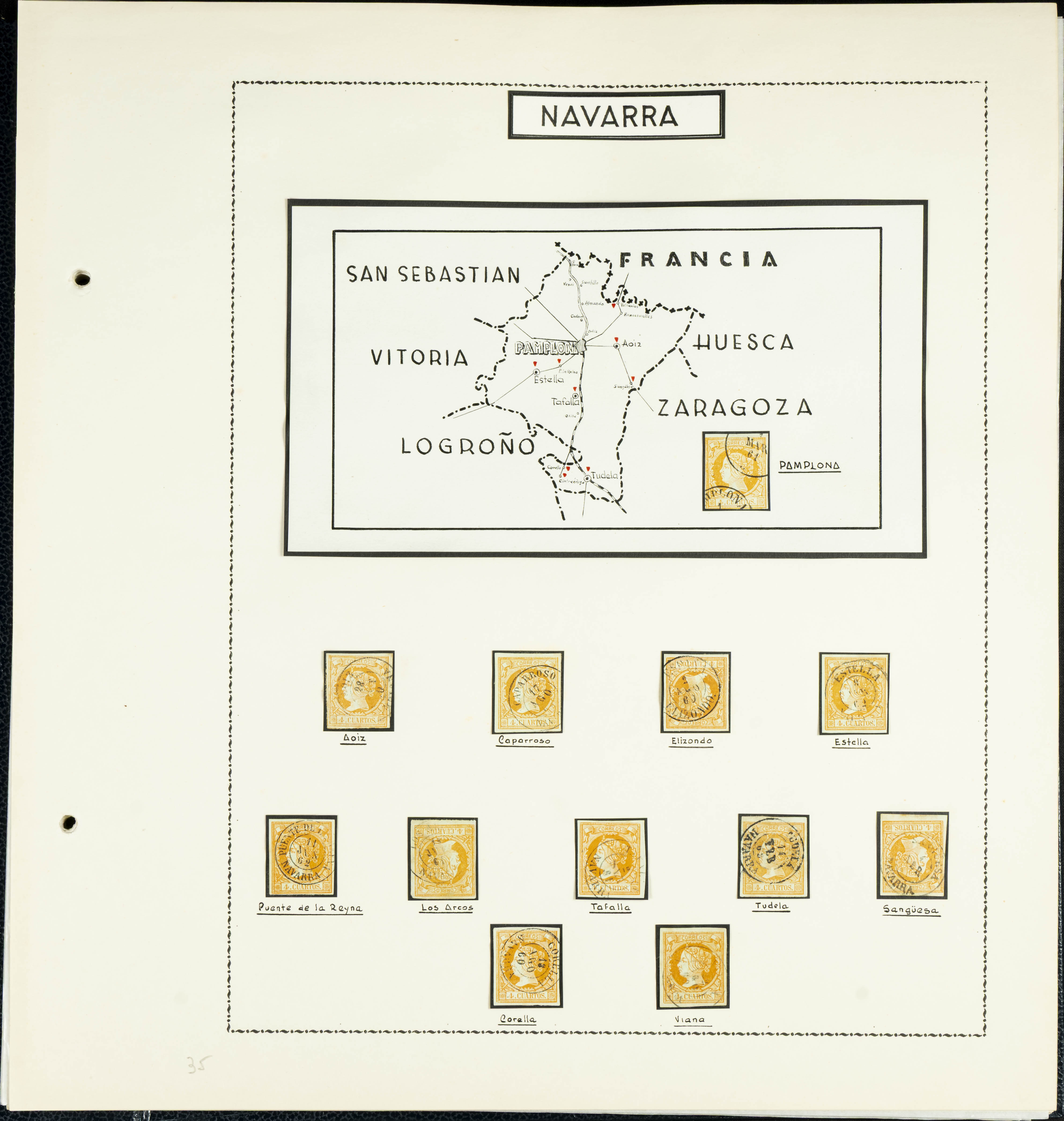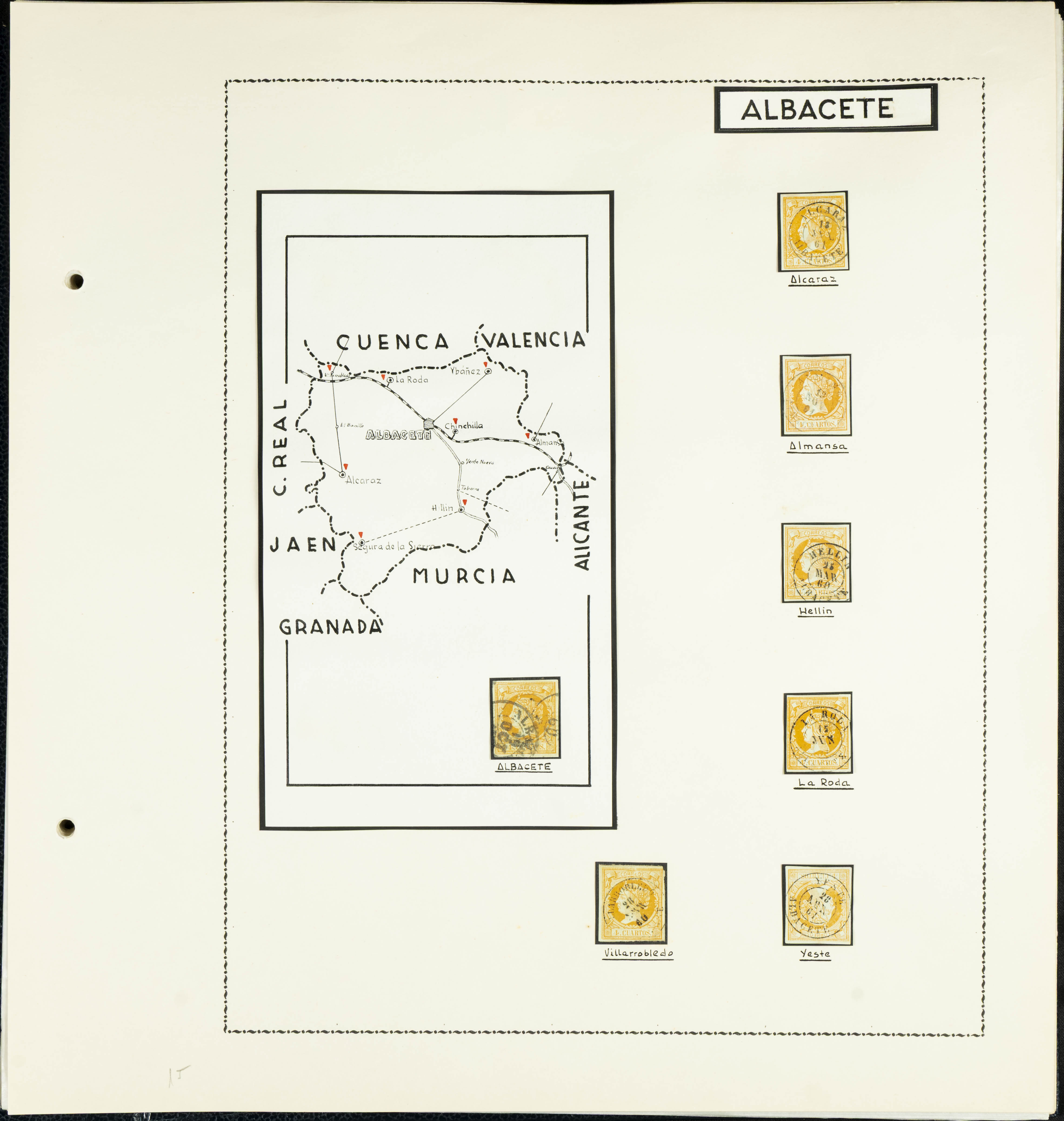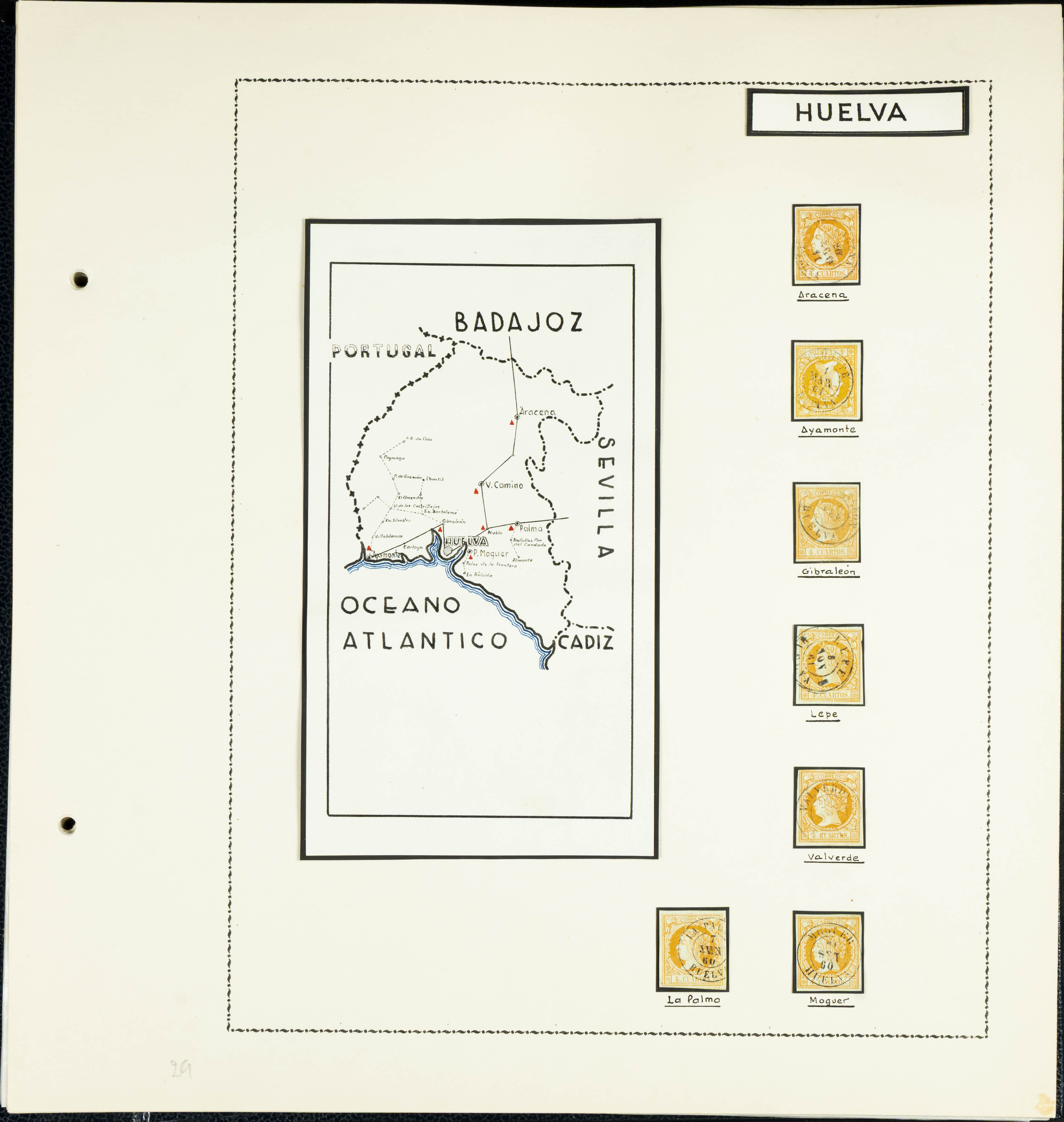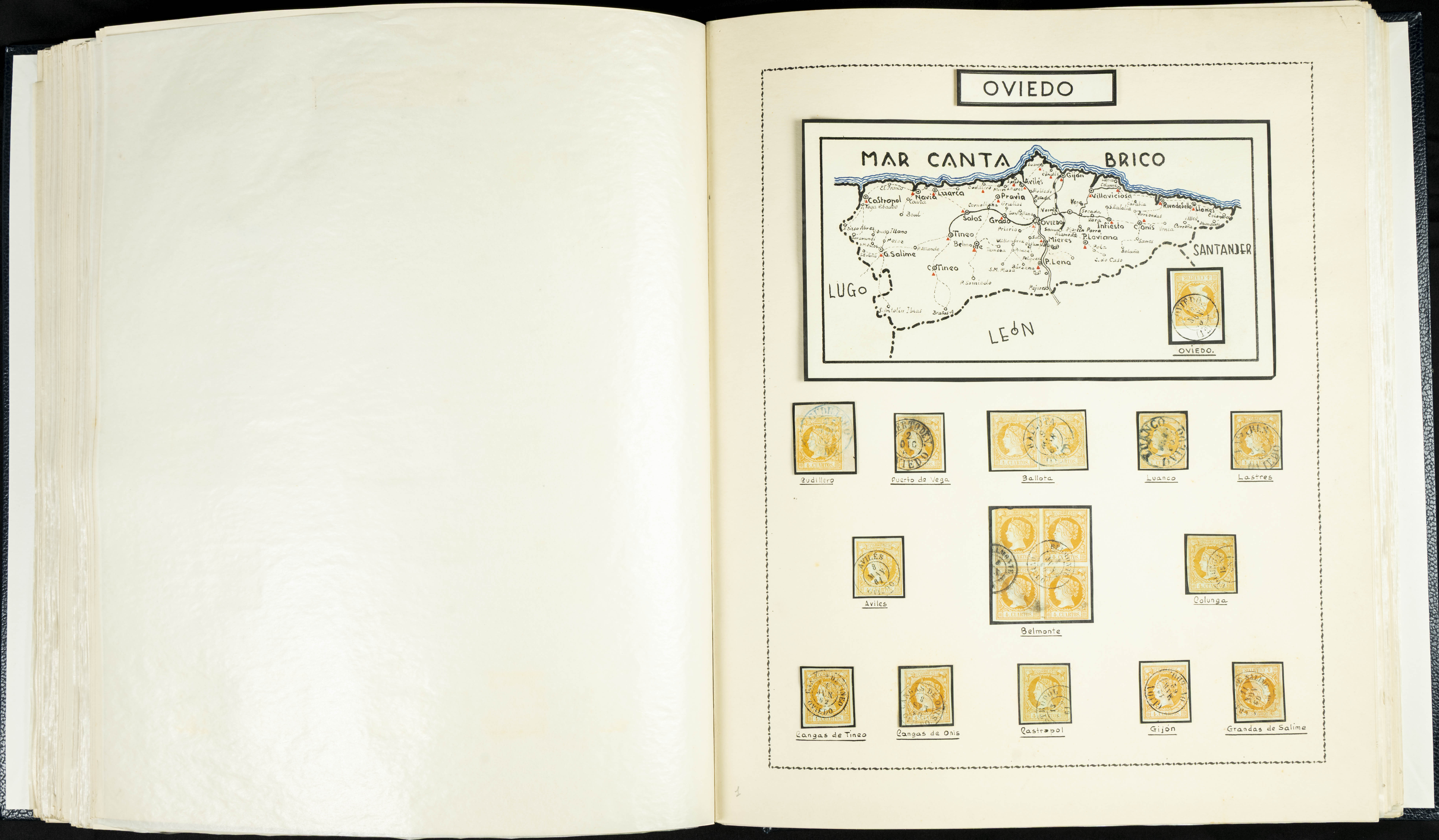 English 52. 1860. Spectacular collection of the yellow 4cuarto stamp, including countless stamps, blocks, fragments, and letters. Part of it is organized by province, especially the Type I and II date stamps. It includes a complete calendar of use, various clichés, a complete set of wagon wheel stamps, and almost a complete set of letter stamps, including the extremely rare No. 42. Individual highlights include a first-day cover stamp and letter, the perforated stamp used in Valencia on a letter (possibly the only one known), stamps and letters with pre-philatelic postmarks, and enormous blocks (spectacularly mounted in antique albums). A MUST-SEE.