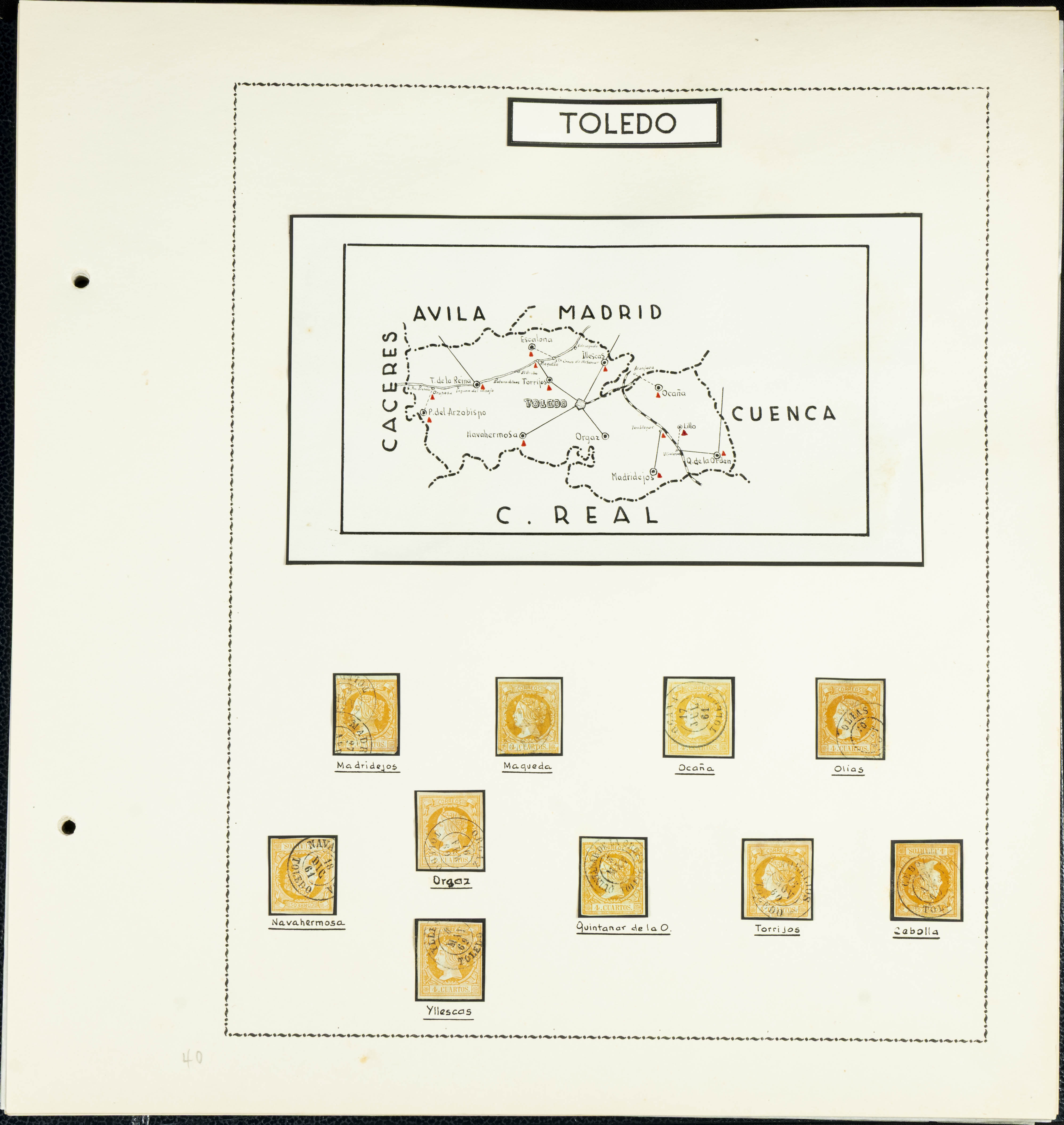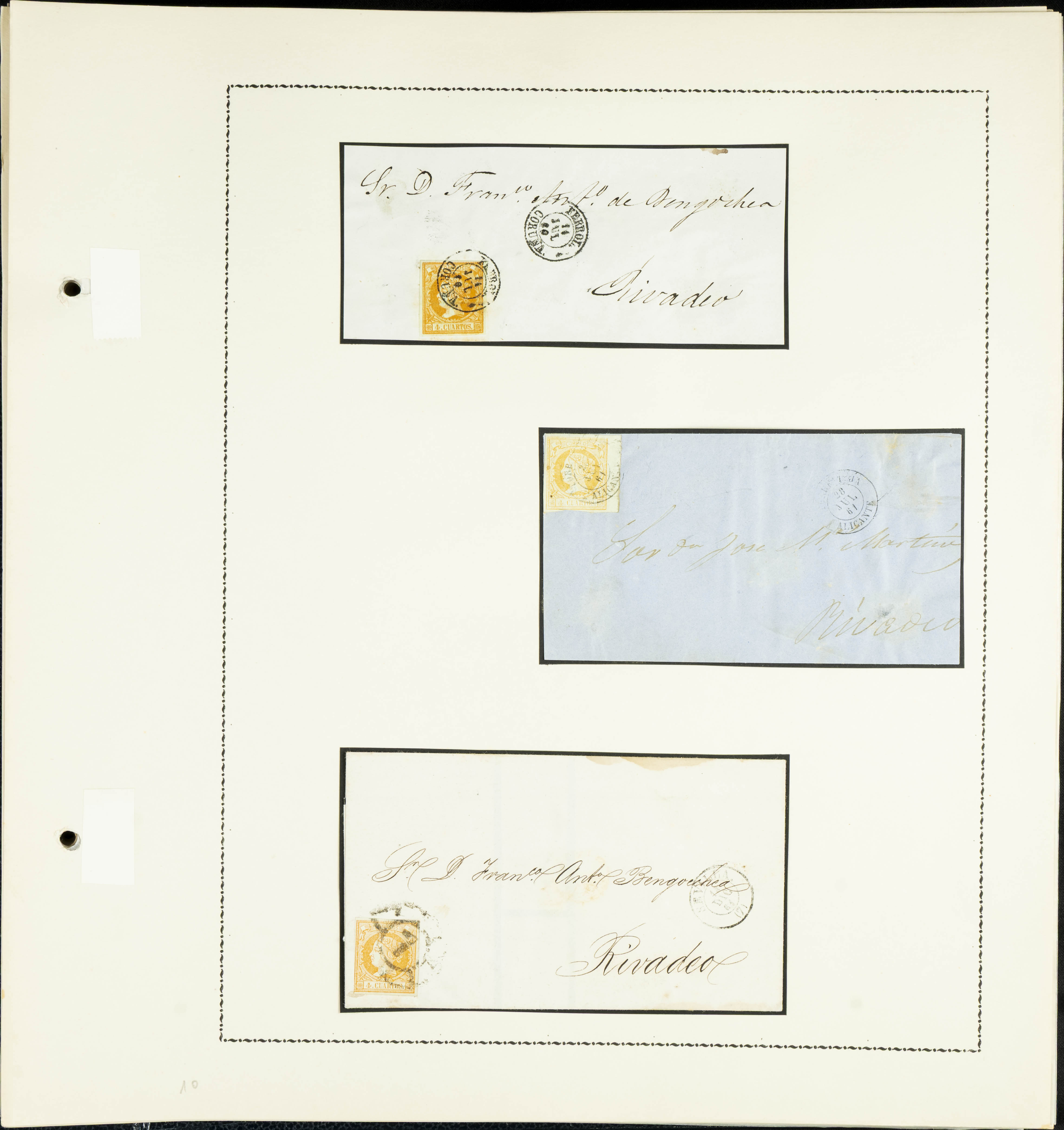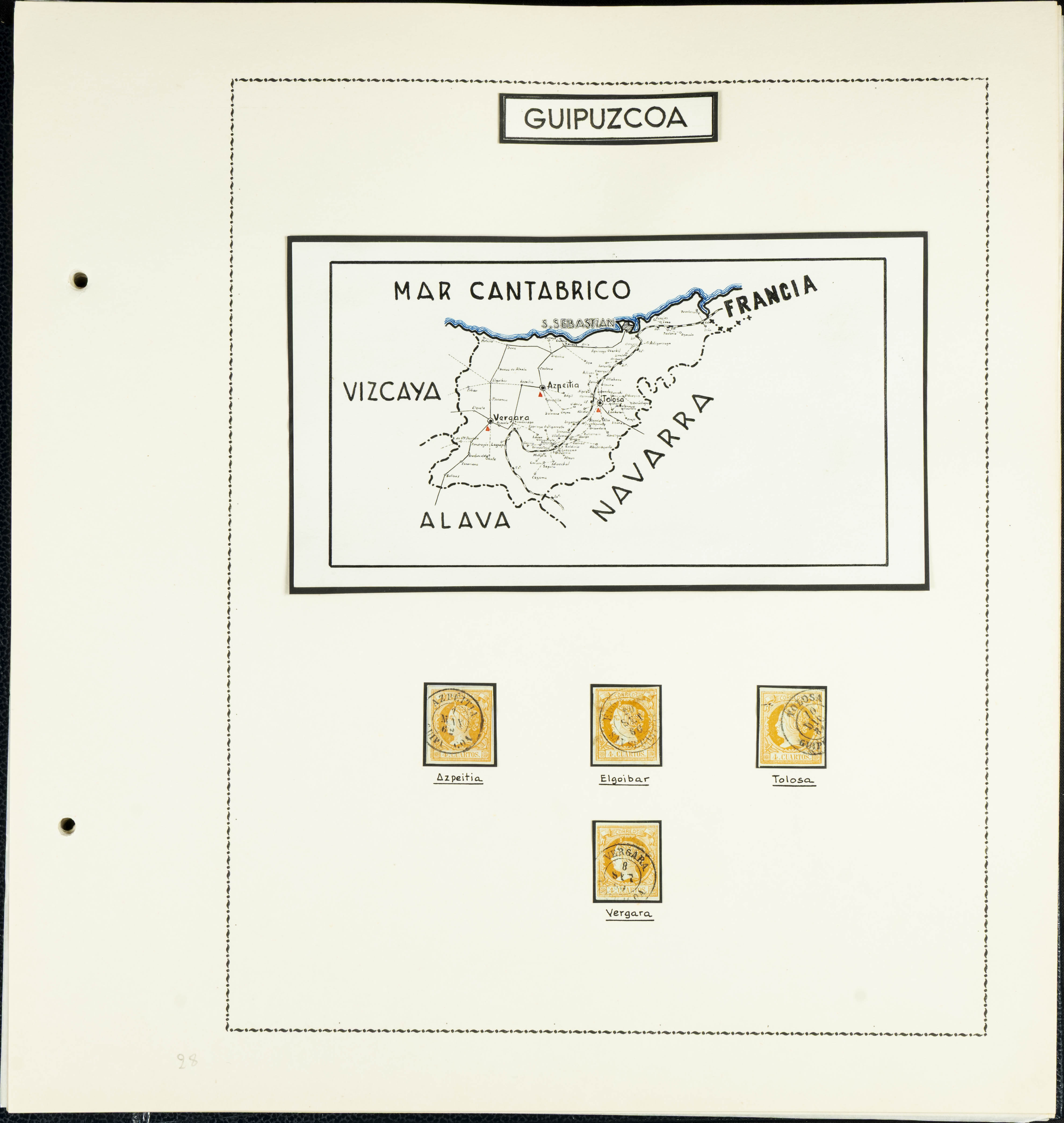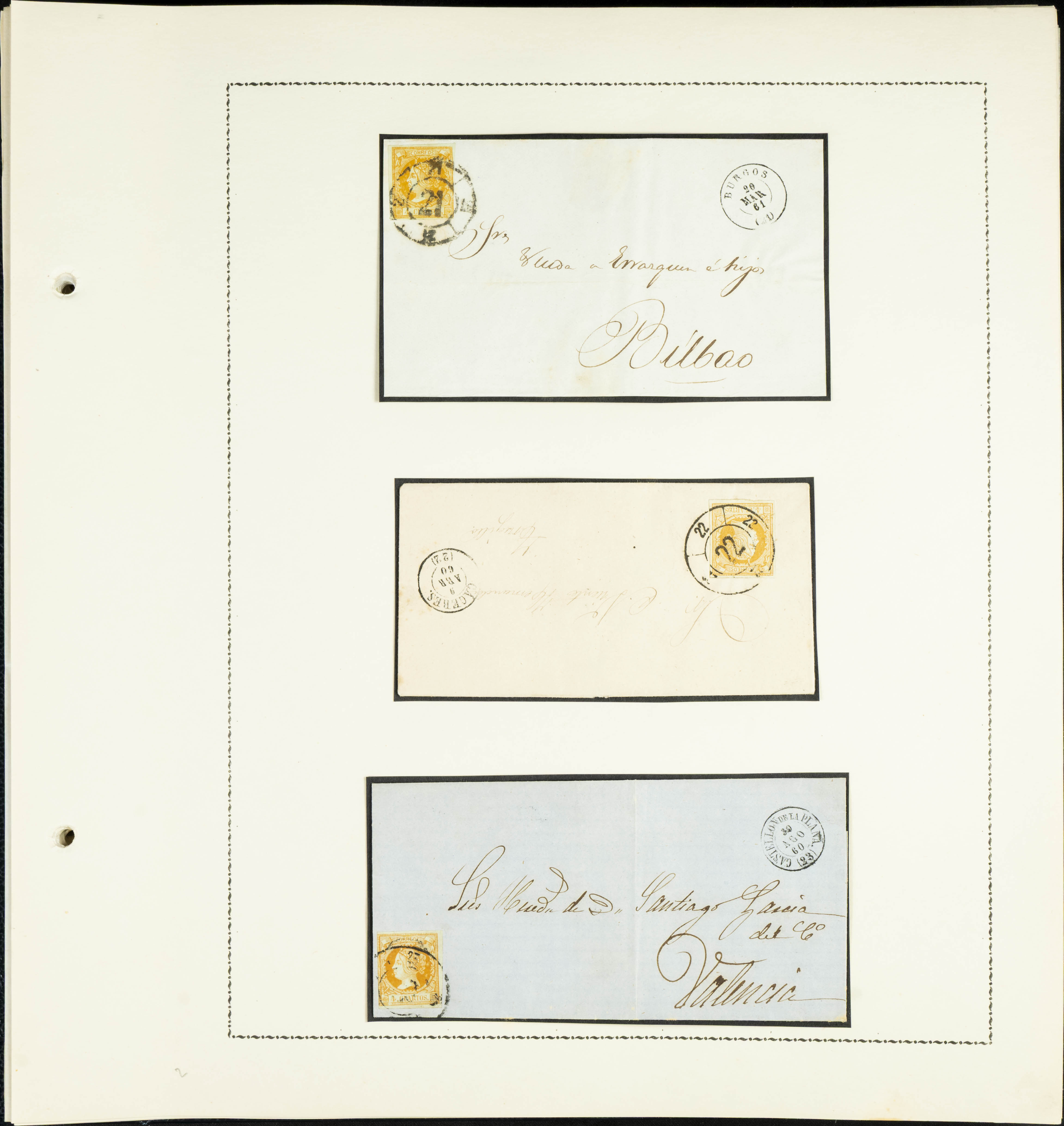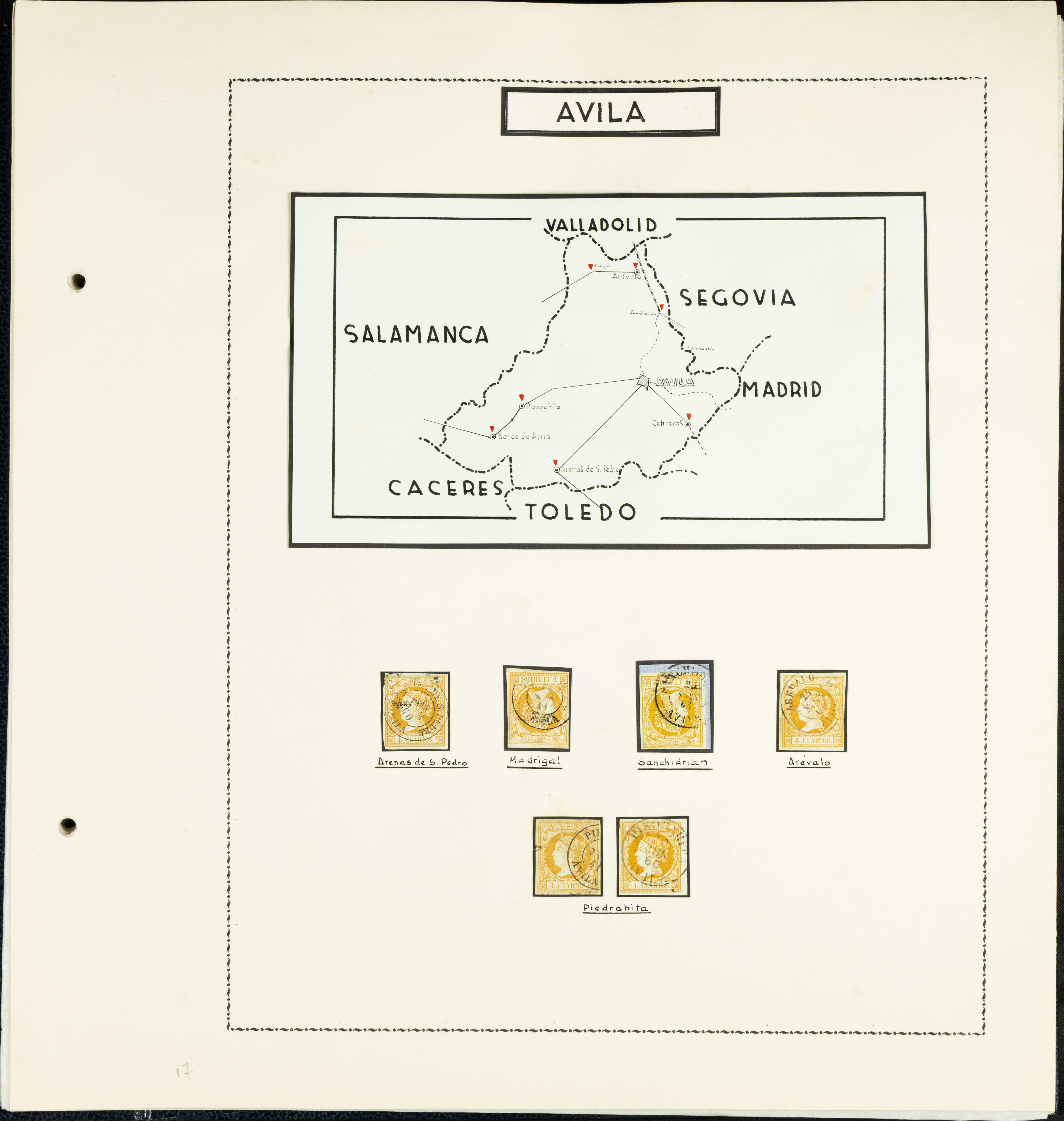 English 52. 1860. Spectacular collection of the yellow 4cuarto stamp, including countless stamps, blocks, fragments, and letters. Part of it is organized by province, especially the Type I and II date stamps. It includes a complete calendar of use, various clichés, a complete set of wagon wheel stamps, and almost a complete set of letter stamps, including the extremely rare No. 42. Individual highlights include a first-day cover stamp and letter, the perforated stamp used in Valencia on a letter (possibly the only one known), stamps and letters with pre-philatelic postmarks, and enormous blocks (spectacularly mounted in antique albums). A MUST-SEE.