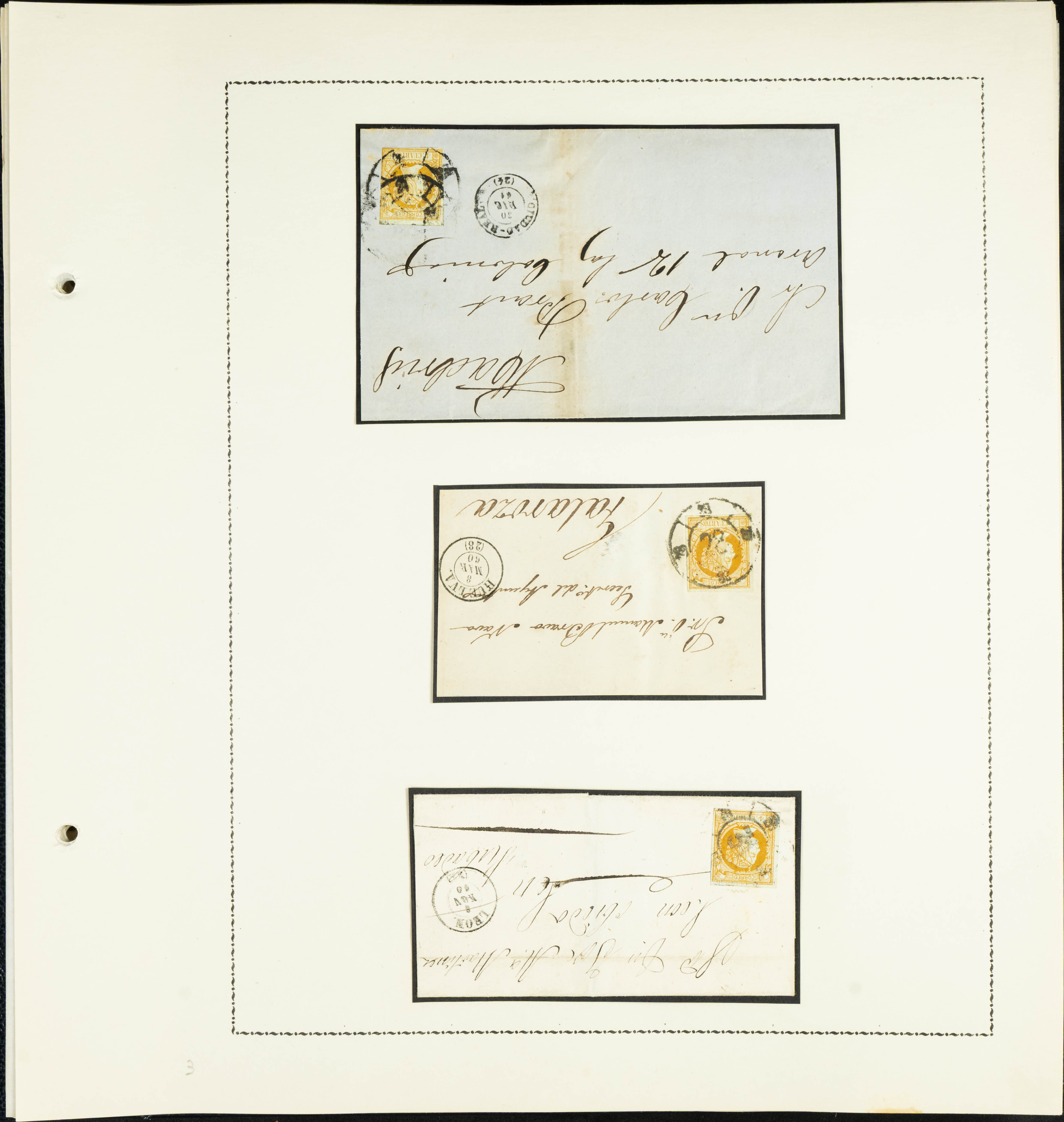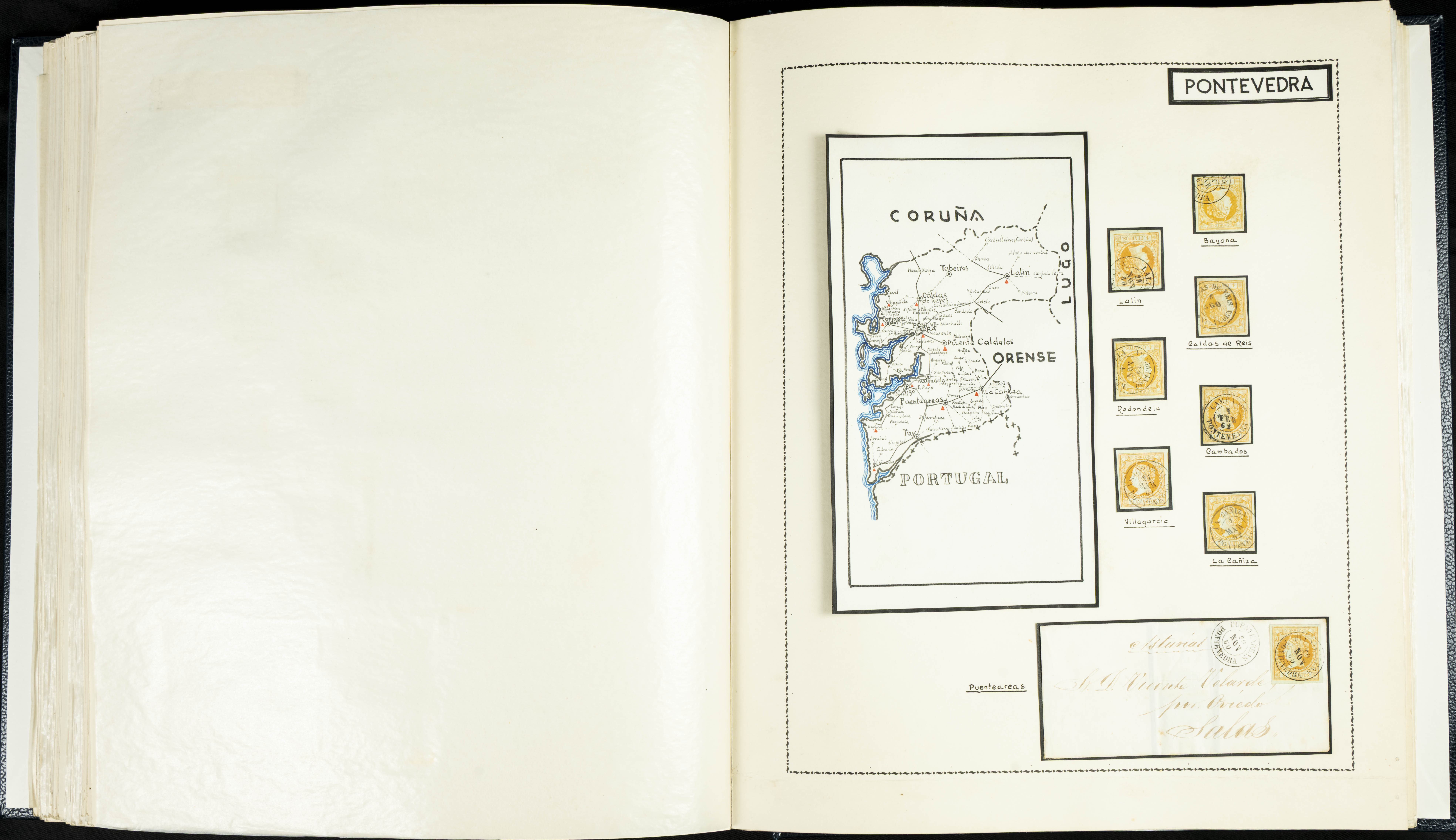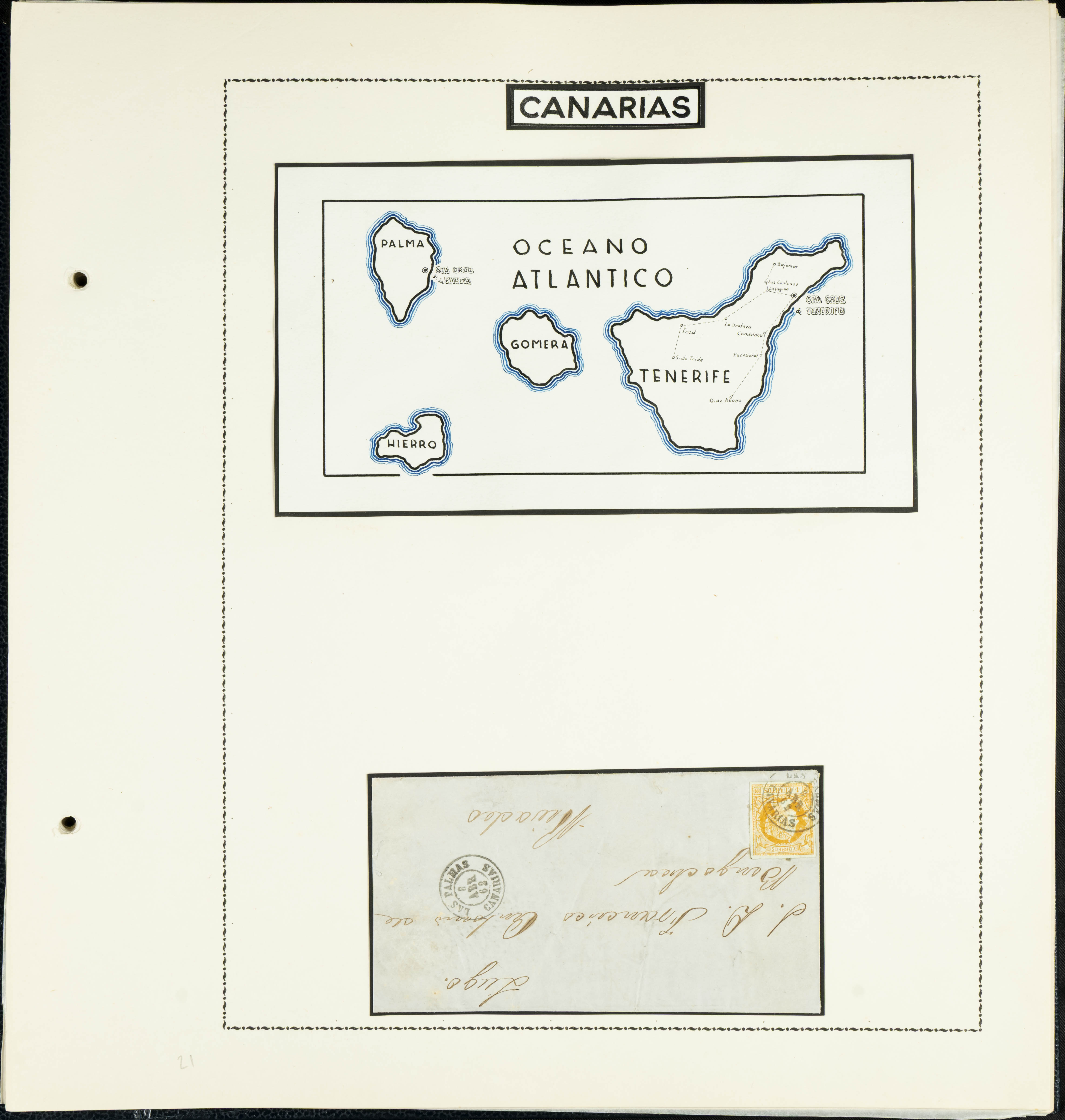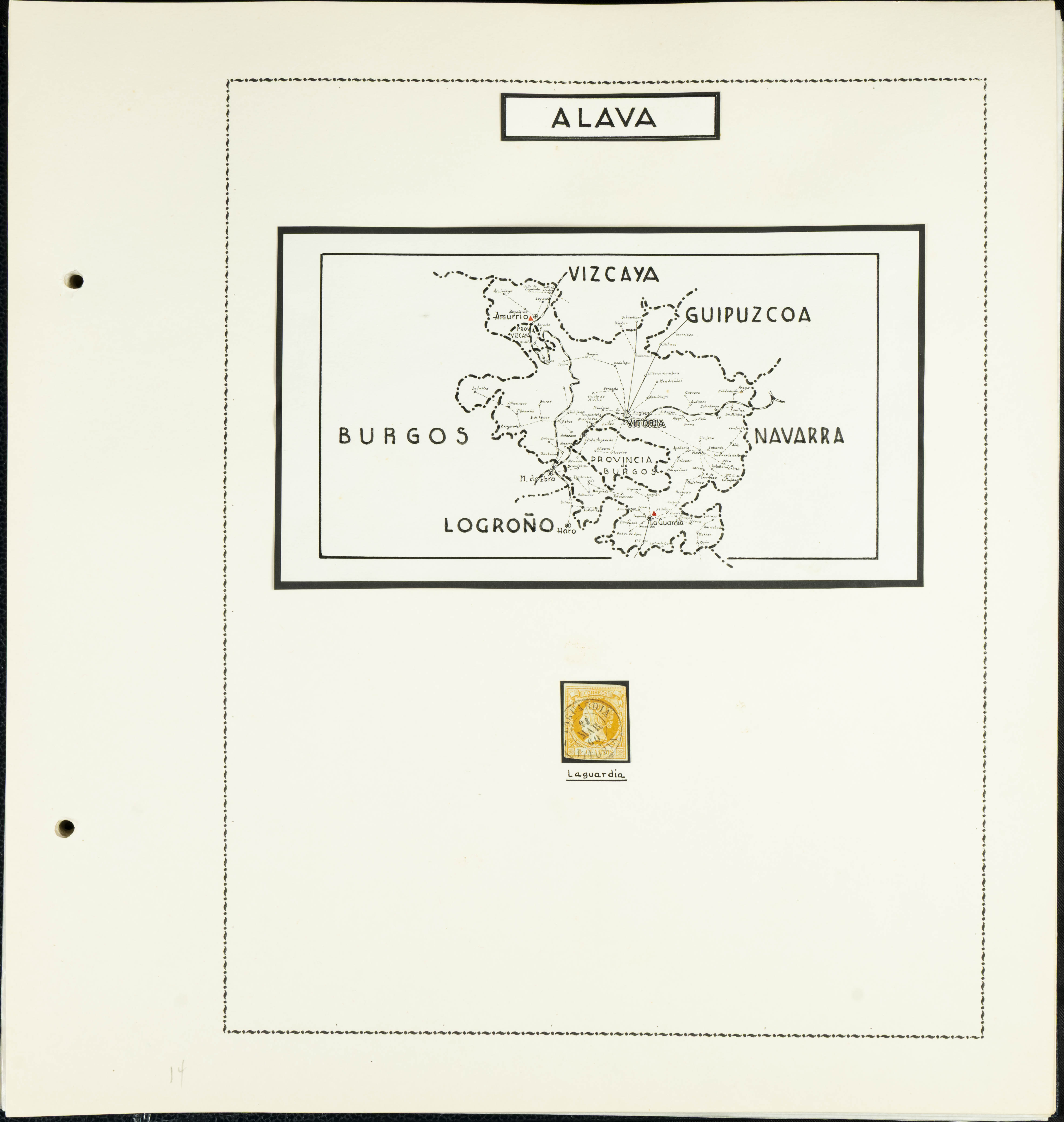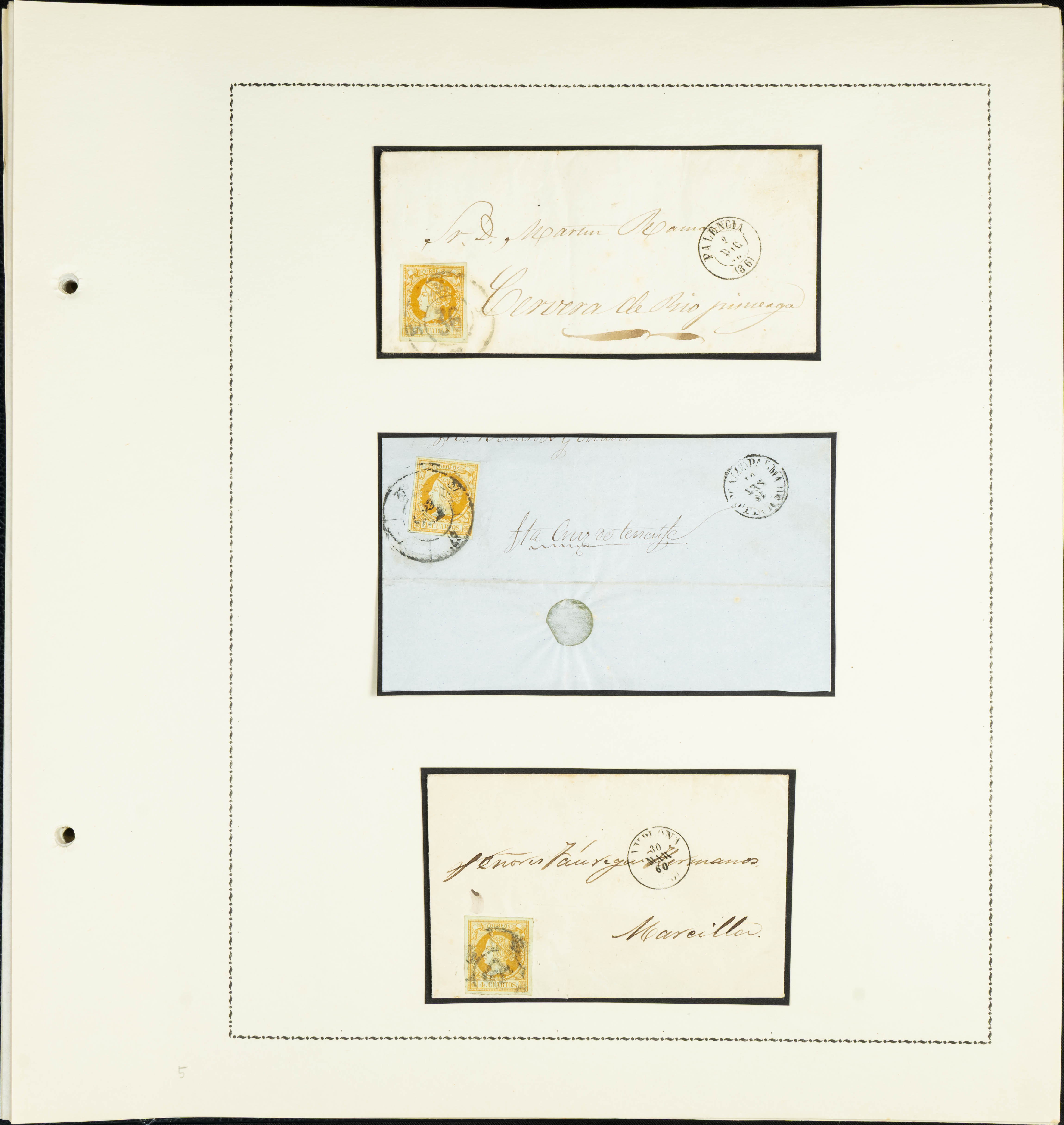 English 52. 1860. Spectacular collection of the yellow 4cuarto stamp, including countless stamps, blocks, fragments, and letters. Part of it is organized by province, especially the Type I and II date stamps. It includes a complete calendar of use, various clichés, a complete set of wagon wheel stamps, and almost a complete set of letter stamps, including the extremely rare No. 42. Individual highlights include a first-day cover stamp and letter, the perforated stamp used in Valencia on a letter (possibly the only one known), stamps and letters with pre-philatelic postmarks, and enormous blocks (spectacularly mounted in antique albums). A MUST-SEE.