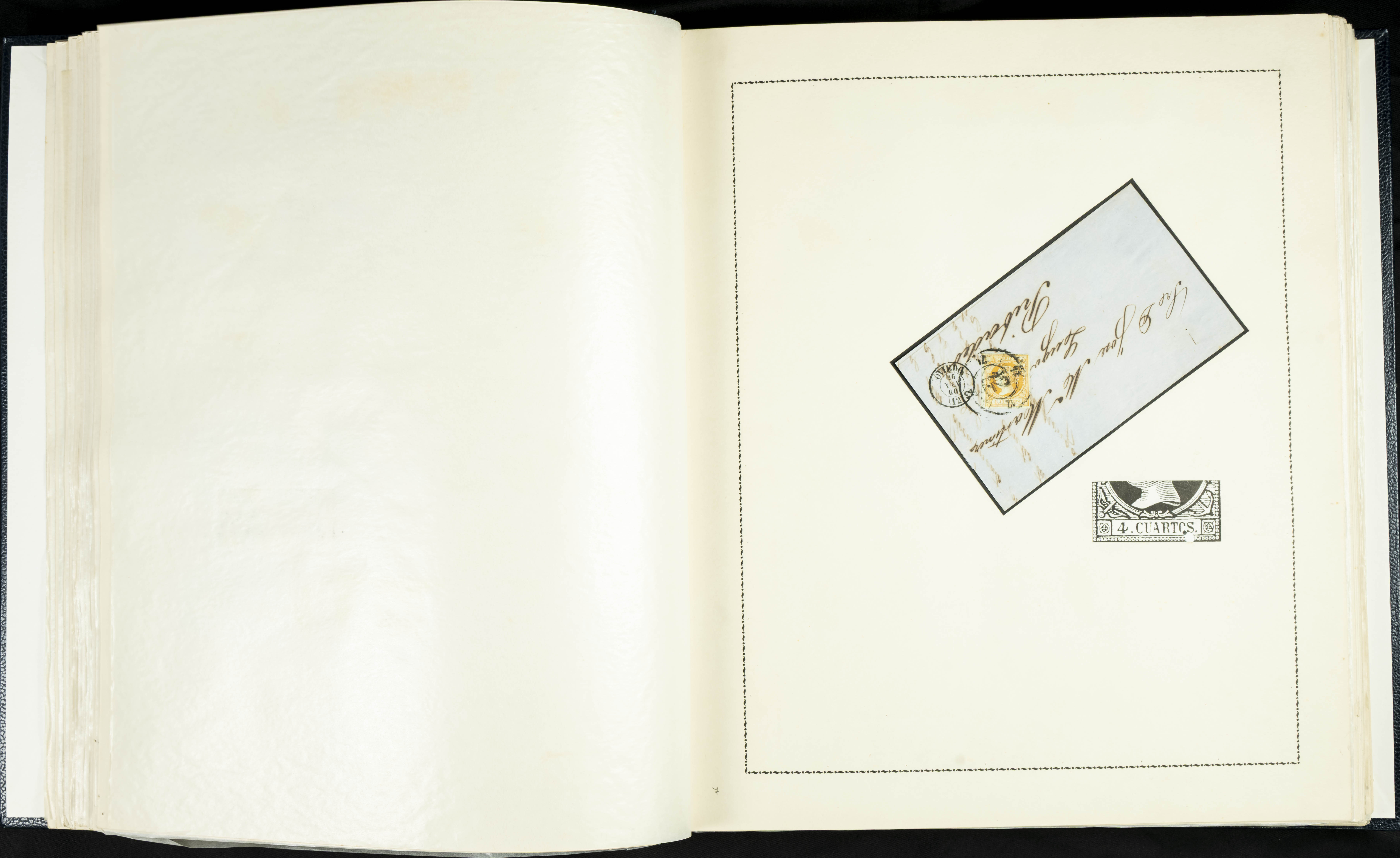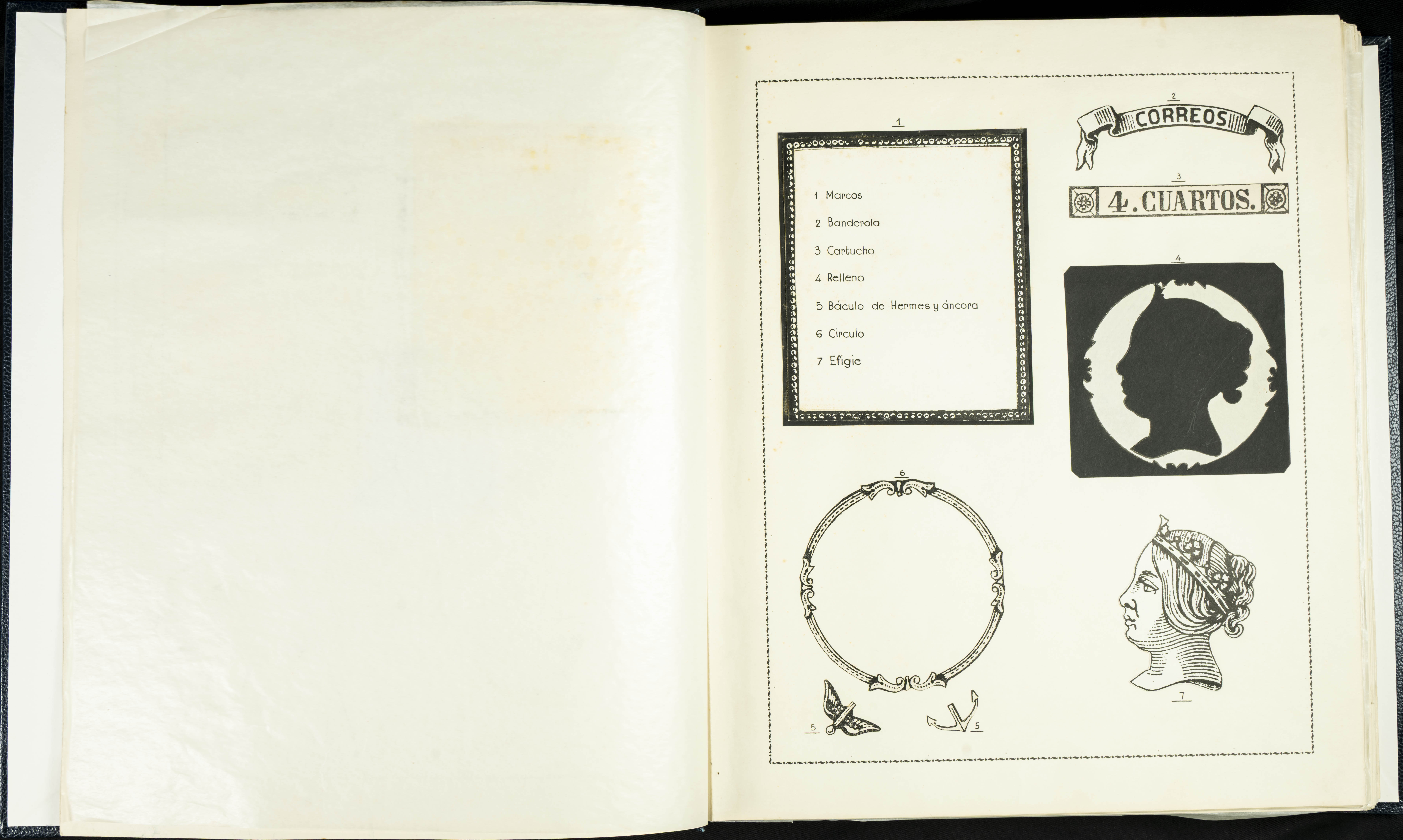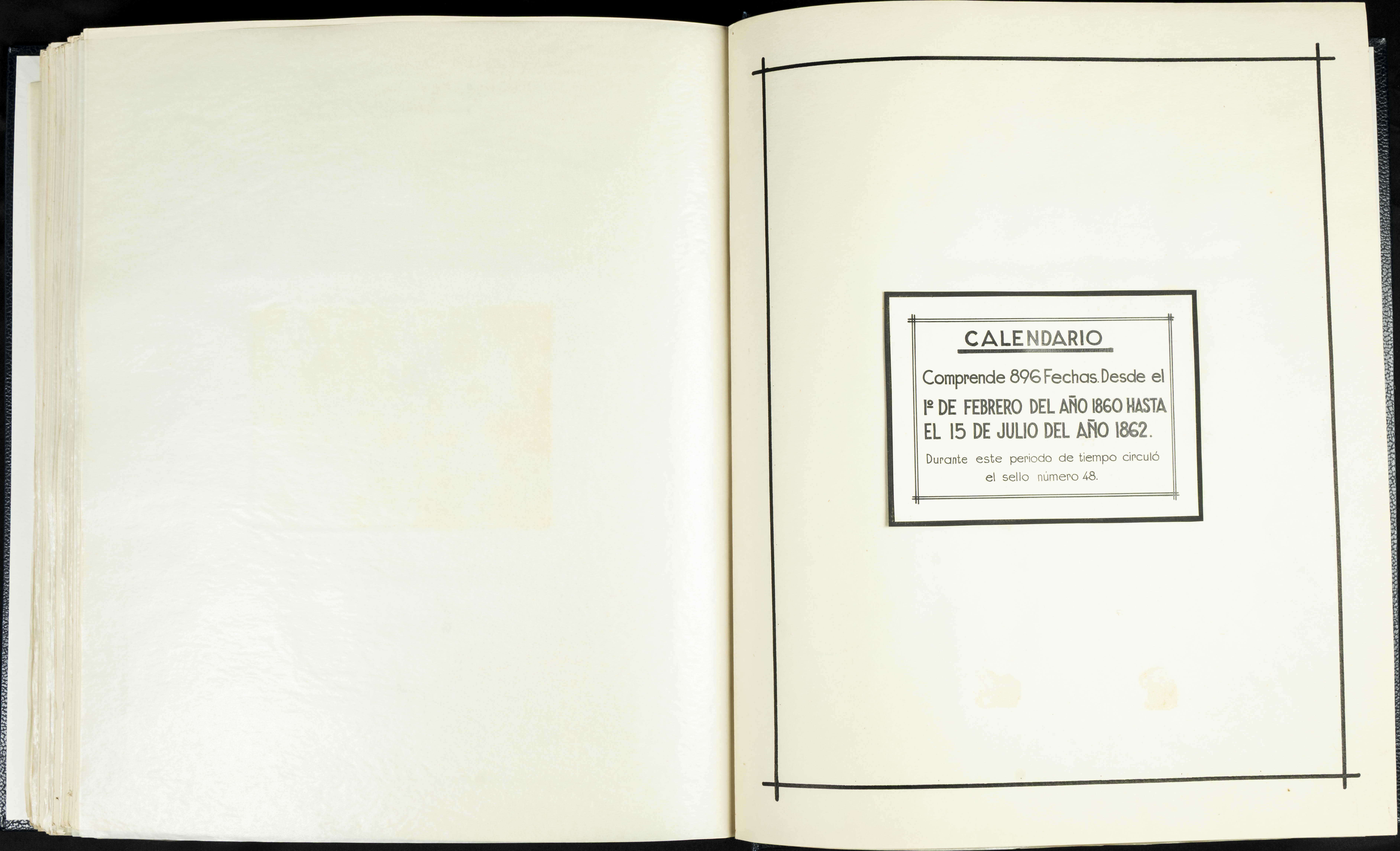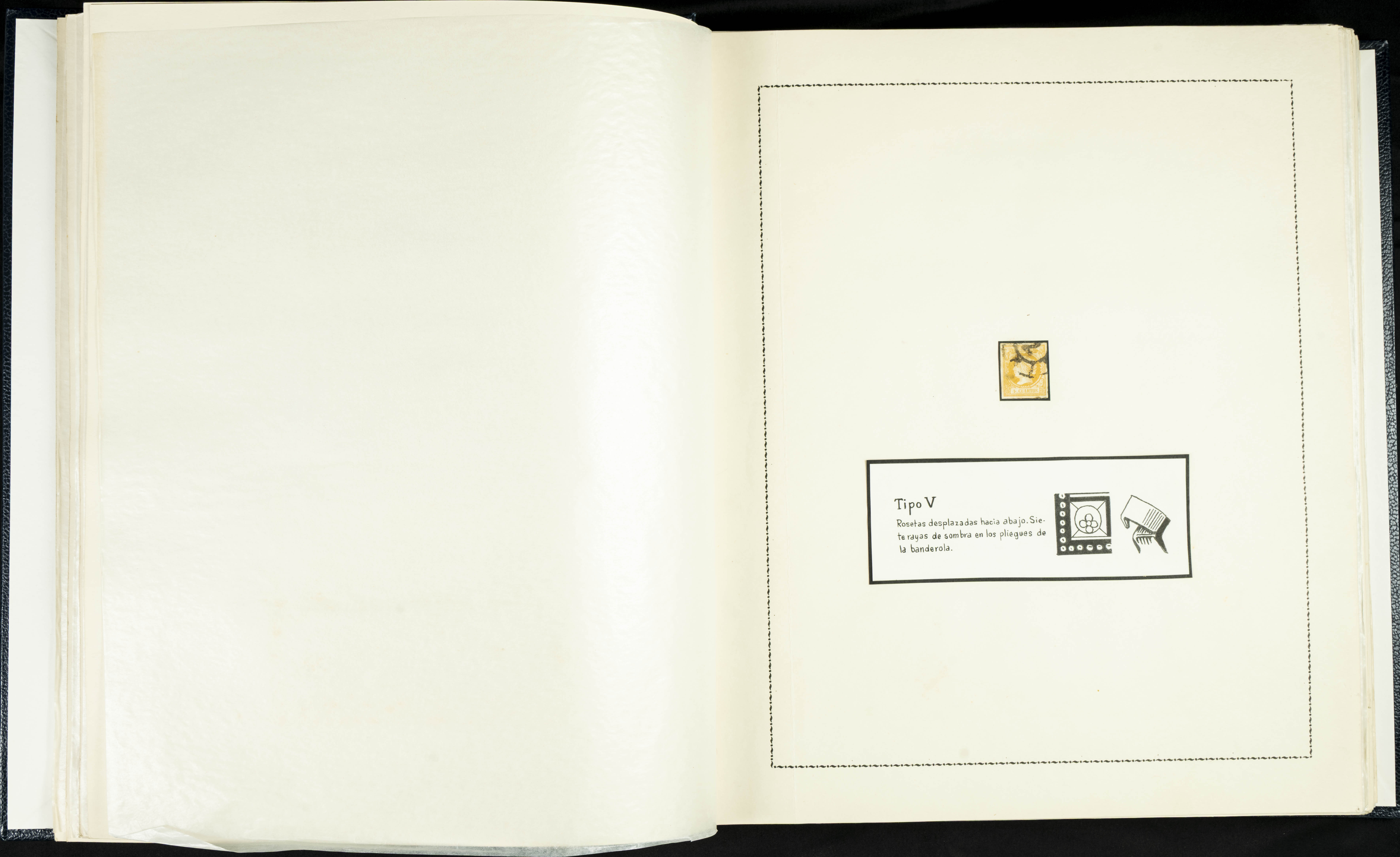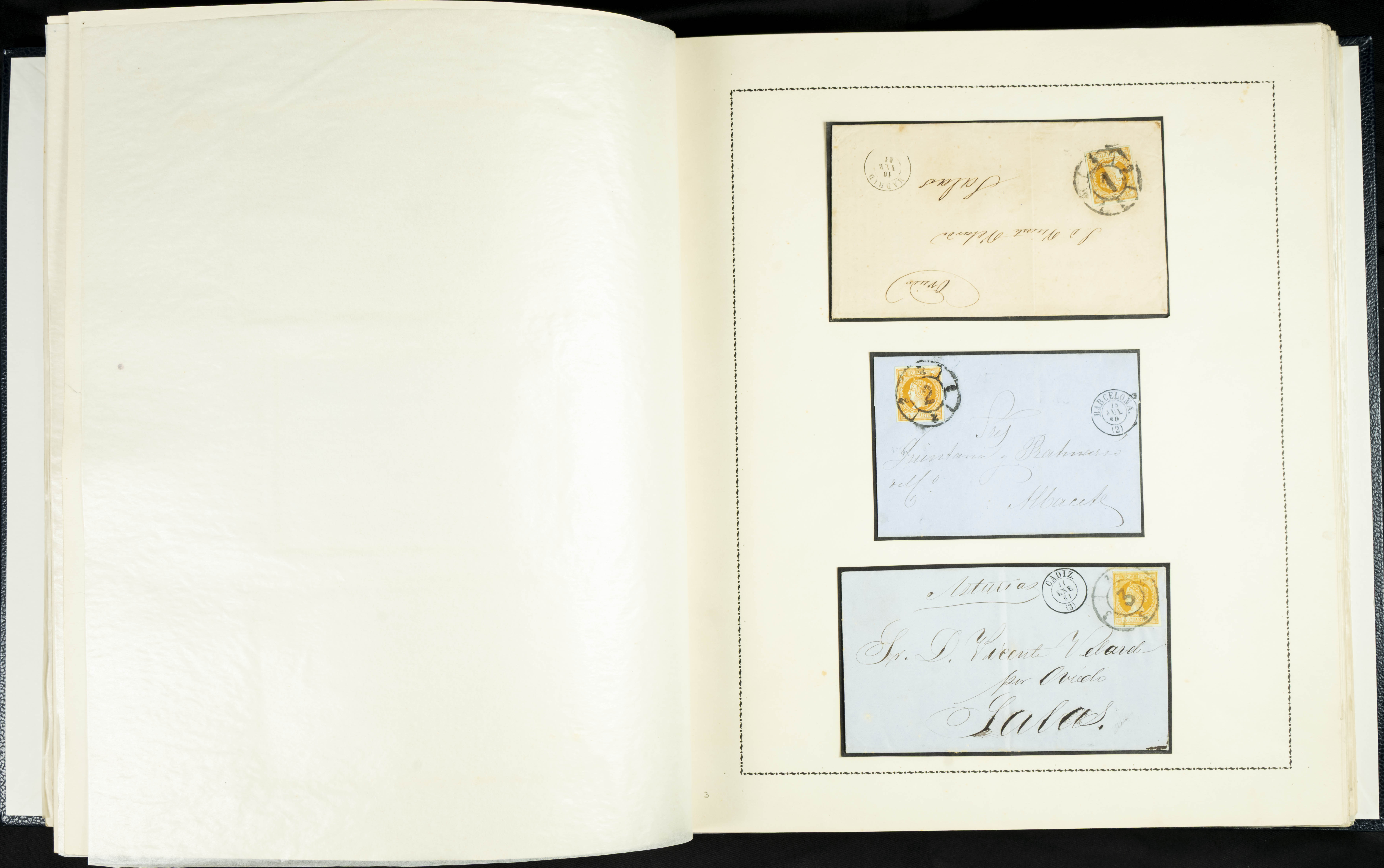 English 52. 1860. Spectacular collection of the yellow 4cuarto stamp, including countless stamps, blocks, fragments, and letters. Part of it is organized by province, especially the Type I and II date stamps. It includes a complete calendar of use, various clichés, a complete set of wagon wheel stamps, and almost a complete set of letter stamps, including the extremely rare No. 42. Individual highlights include a first-day cover stamp and letter, the perforated stamp used in Valencia on a letter (possibly the only one known), stamps and letters with pre-philatelic postmarks, and enormous blocks (spectacularly mounted in antique albums). A MUST-SEE.
