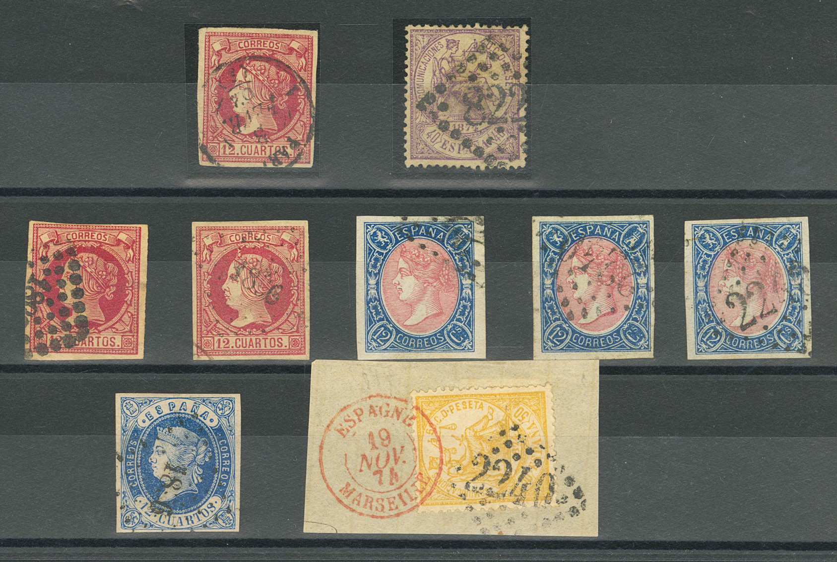 English 53(3), 59, 70(3), 148, 149. (circa 1860). Set of seven 12-quart stamps (three from 1860, one from 1862, and three from 1865) and two stamps of the Allegory of Justice (40 cents violet and 50 cents yellow) with French postmarks (some very rare). TO BE EXAMINED.