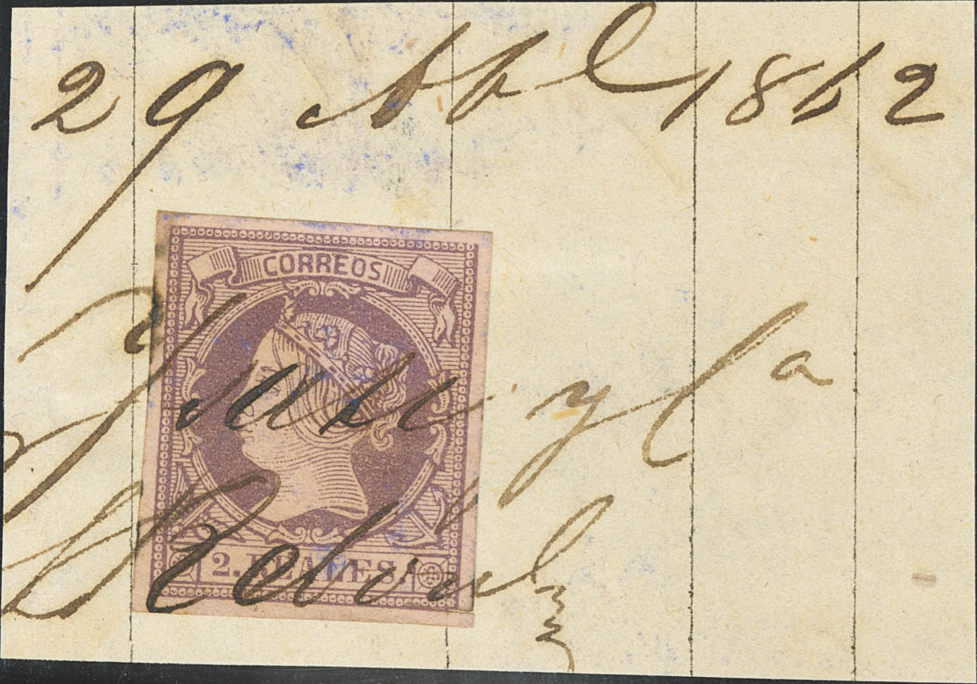 △ 56. 1860. 2 reales lilac, on fragment. Defaced with a pen. MAGNIFICENT AND RARE FIUncirculatedAL USE.