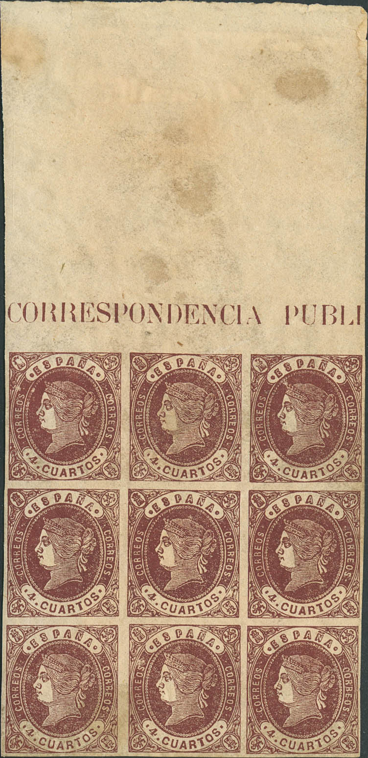 ★★ 58p(9). 1862. 4 quartos chestnut, block of nine (with the header of the sheet). WHITE PAPER. MAGNIFICENT AND RARE.