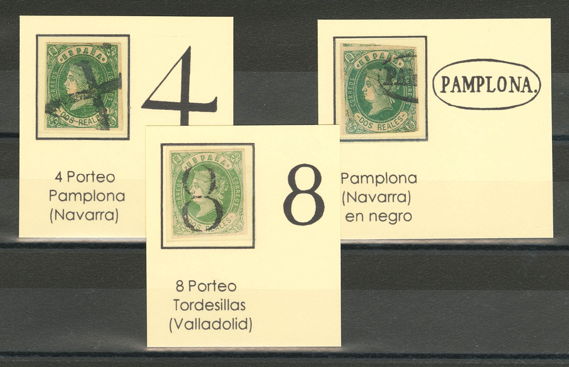 62(3). 1862. 2 reales green, three stamps, with pre-philatelic postmarks PAMPLONA, "4" from Pamplona and "8" (postage attributed to Tordesillas). MAGNIFICENT.