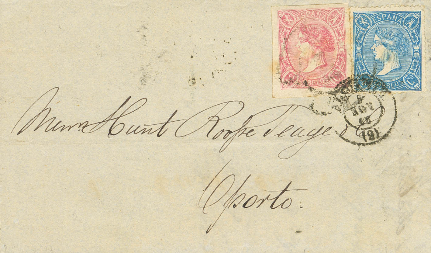 69, 75. 1865. 2 pink quarts and 4 blue quarts. ALICANTE to OPORTO (PORTUGAL). MAGNIFICENT AND UNUSUAL.