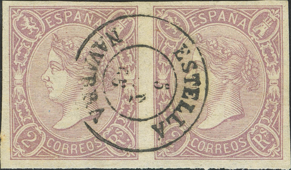 73(2). 1865. 2 reales grey, pair. Postmark ESTELLA / NAVARRA. MAGNIFICENT.