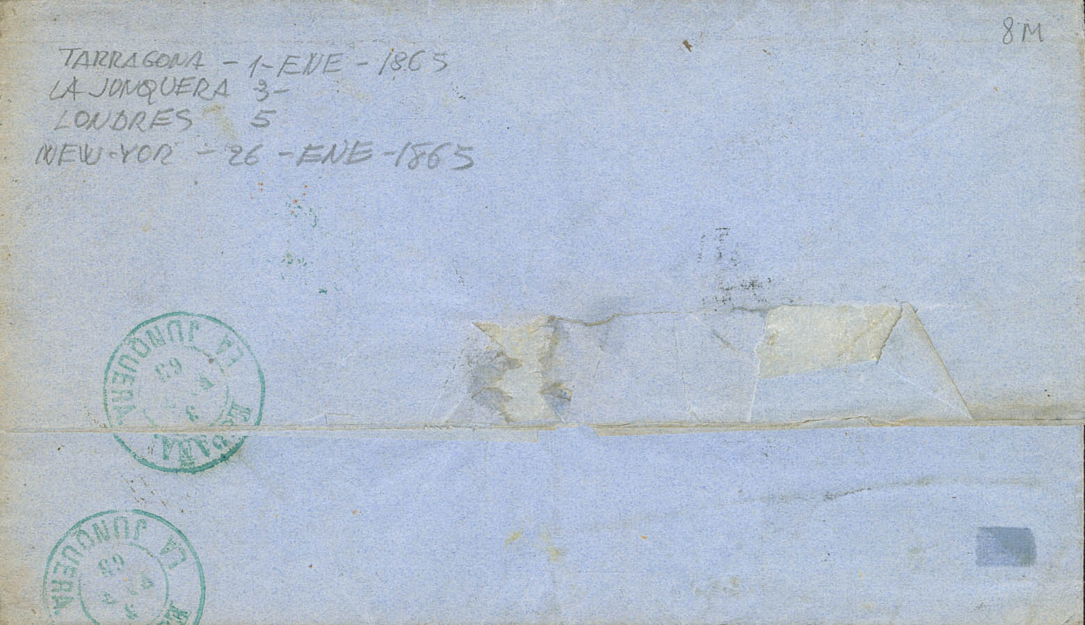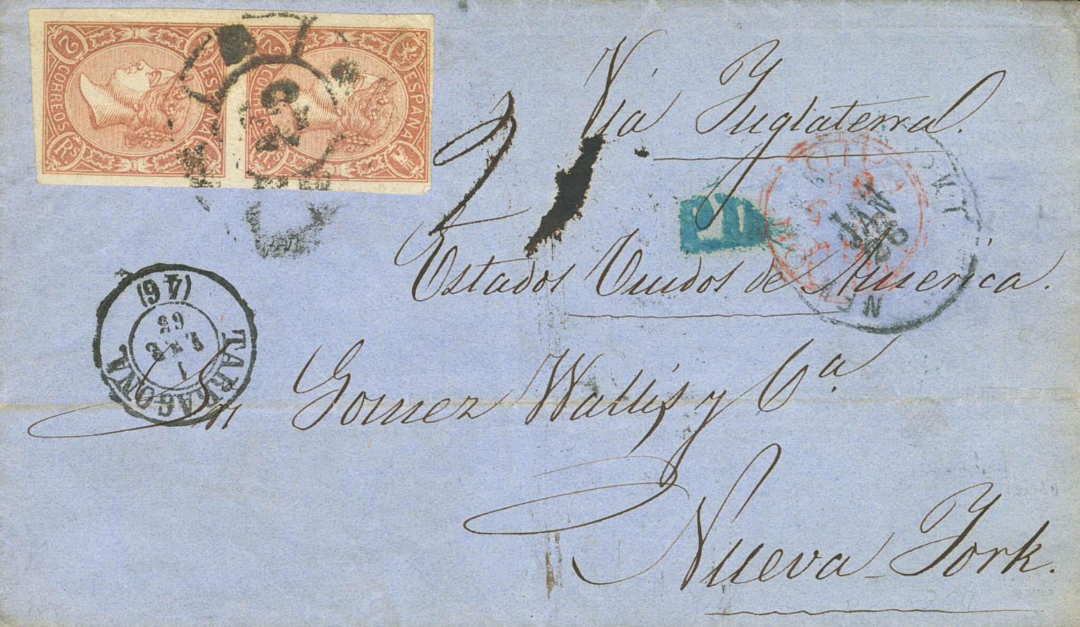 73A(2). 1865. 2 reales, brownish-yellow, pair. TARRAGONA to NEW YORK (USA). MAGNIFICENT AND EXTREMELY RARE, CIGoodULATED ON THE FIRST DAY OF ISSUE, ESPECIALLY ABROAD. Cert. GRAUS.