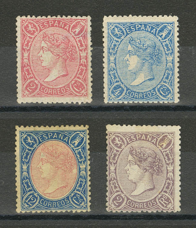 ★/(★) 74, 75, 76, 79. 1865. 2 cuartos, 4 cuartos, 12 cuartos, 2 reales lilac (various defects). TO BE EXAMINED.