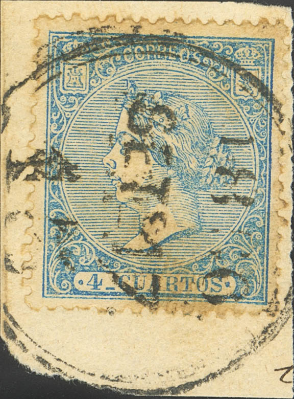 81. 1866. 4 cuartos blue, on fragment. Postmark CARRIL Nº15. MAGNIFICENT AND EXTREMELY RARE, ESPECIALLY IN THIS EXCEPTIONAL QUALITY. GRAUS appraisal.