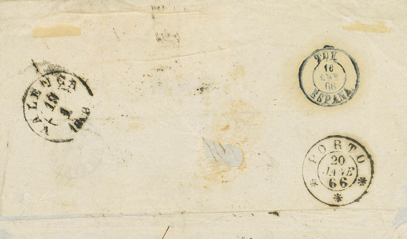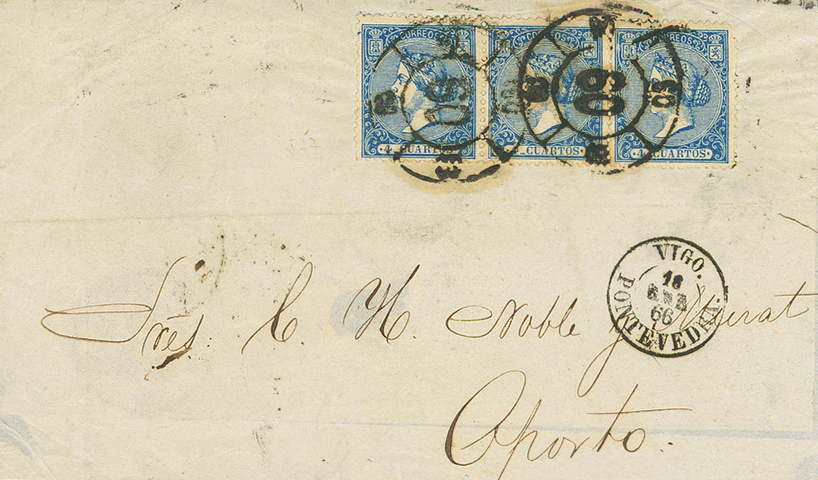 81(3). 1866. 4 cuartos blue, three stamps. VIGO to OPORTO (PORTUGAL). Postmark R.CARRETA Nº60. MAGNIFICENT AND VERY RARE DOUBLE POSTAGE TO PORTUGAL.
