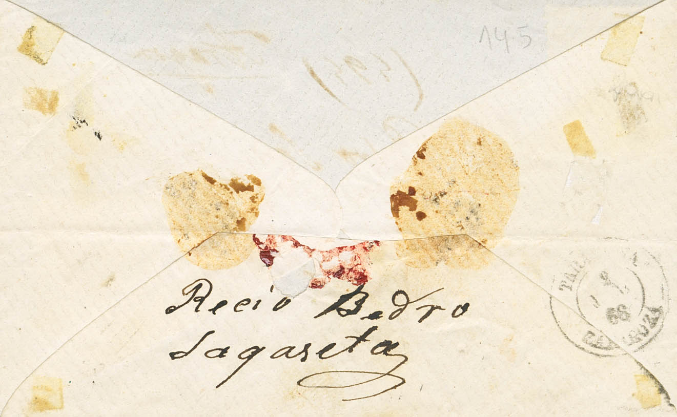 81, 86. 1866. 4 cuartos and 20 cts violet. Certified from TUDELA (NAVARRA) to TARAZONA (ZARGOZA). On the front, Certificate No. and on the back, "received as usual in certified mail." MAGNIFICENT AND EXTREMELY RARE.