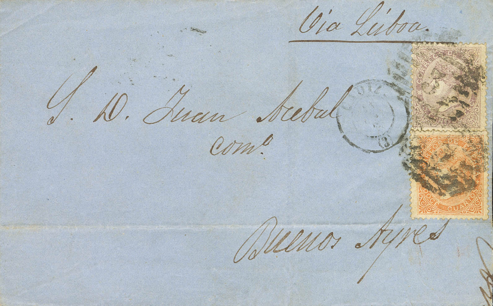 89A, 92. 1868. 12 orange cuartos and 20 lilac cents. CADIZ to BUENOS AIRES (ARGENTINA). Postage of 29 cuartos or 350 mils overseas via Portugal. MAGNIFICENT.