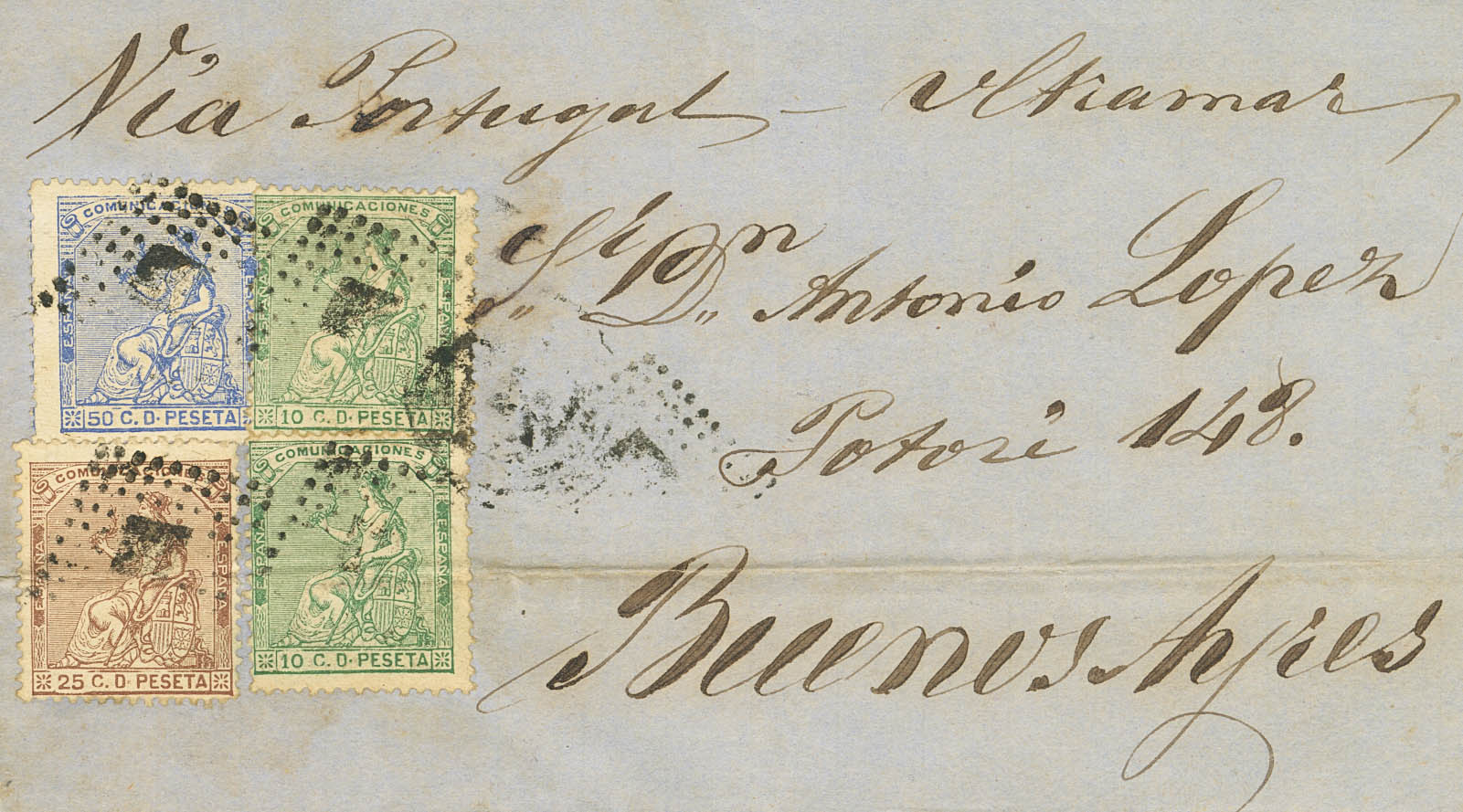 133(2), 135, 137. 1874. 10 cts green, two stamps, 25 cts brown and 50 cts overseas. RIBADEO to BUENOS AIRES (ARGENTINA) (archive fold). MAGNIFICENT AND RARE POSTAGE COMBINATION (WITH EXCESS OF 8 CTS) TO COMPLETE THE RATE OF 87 CTS VIA PORTUGAL.