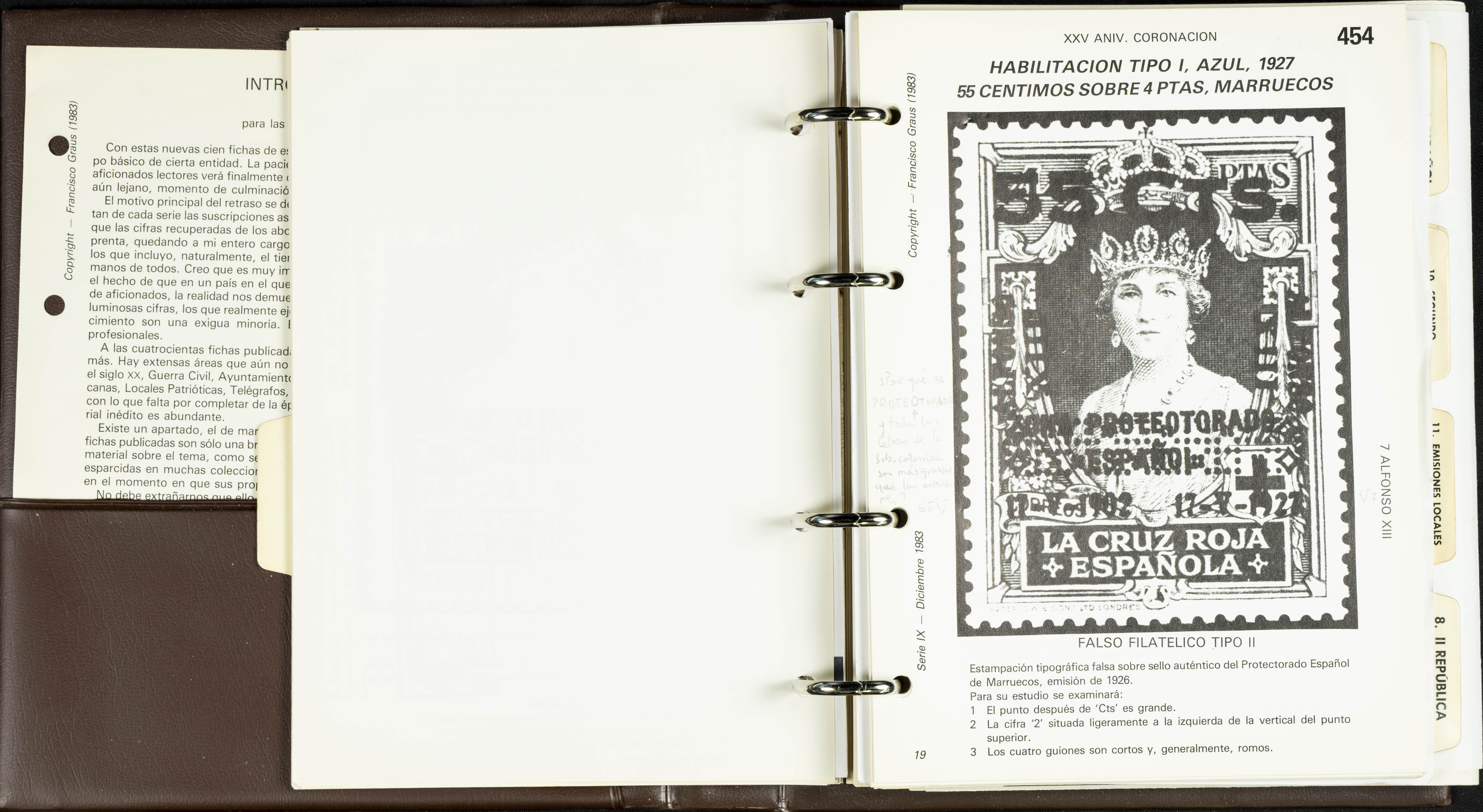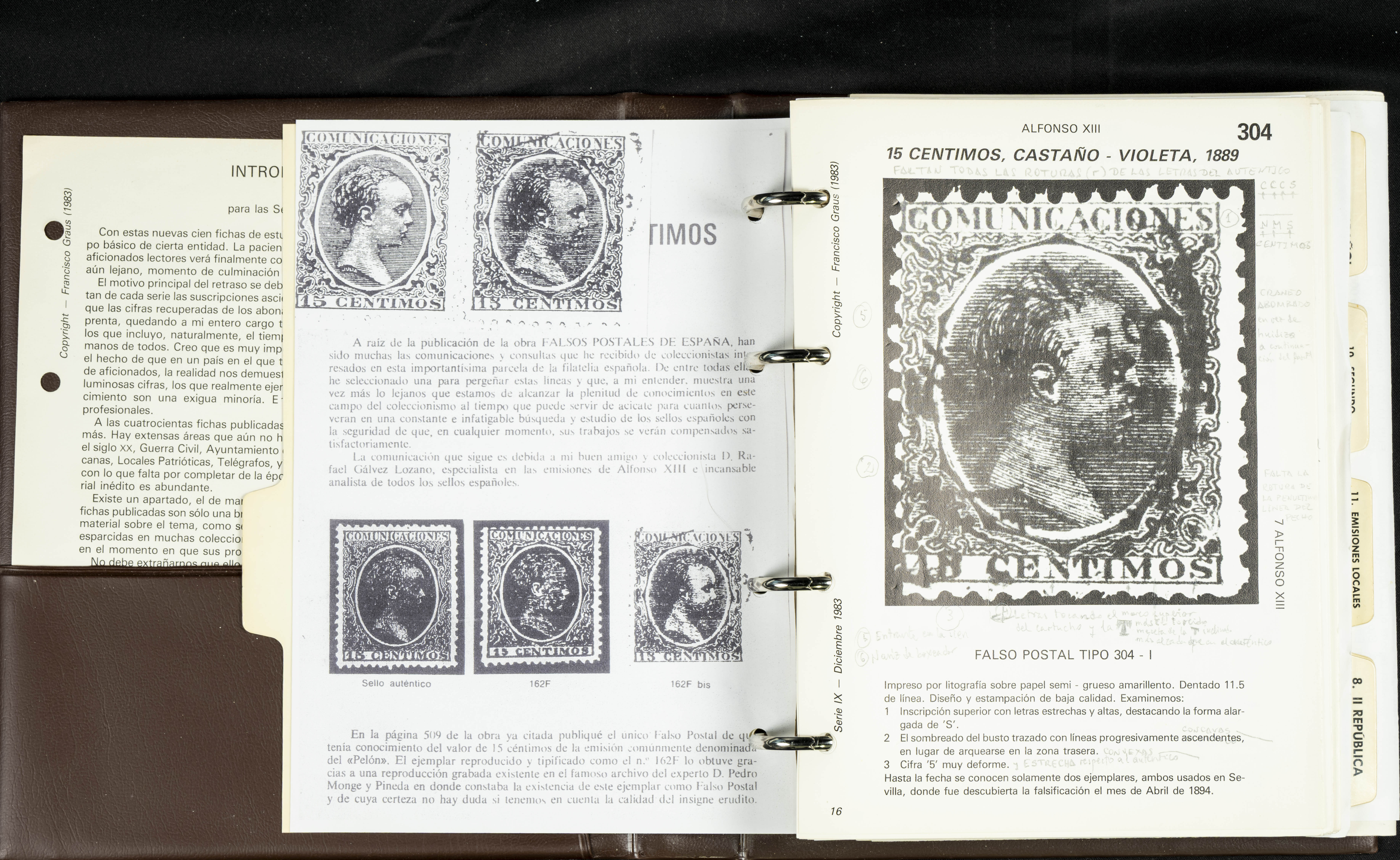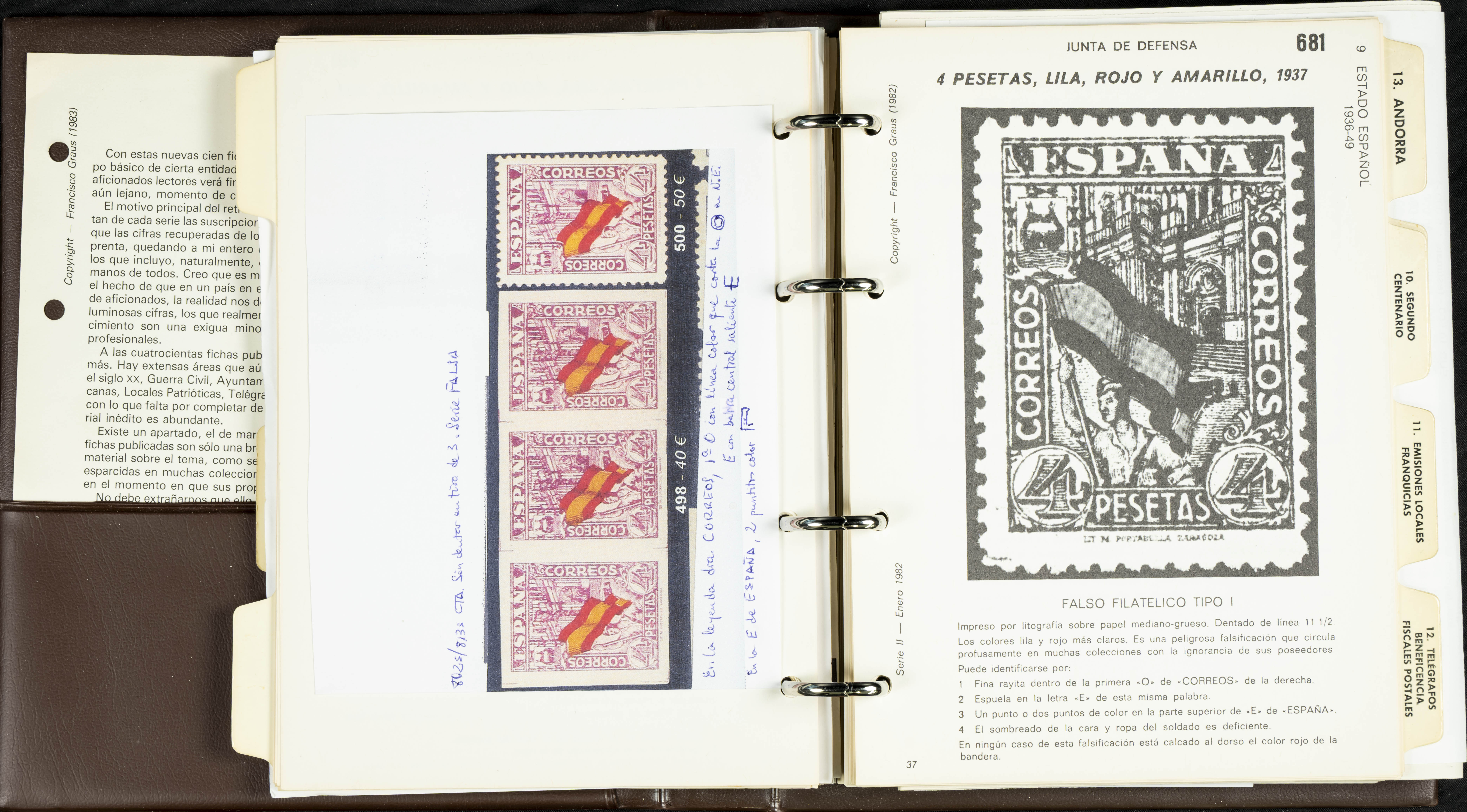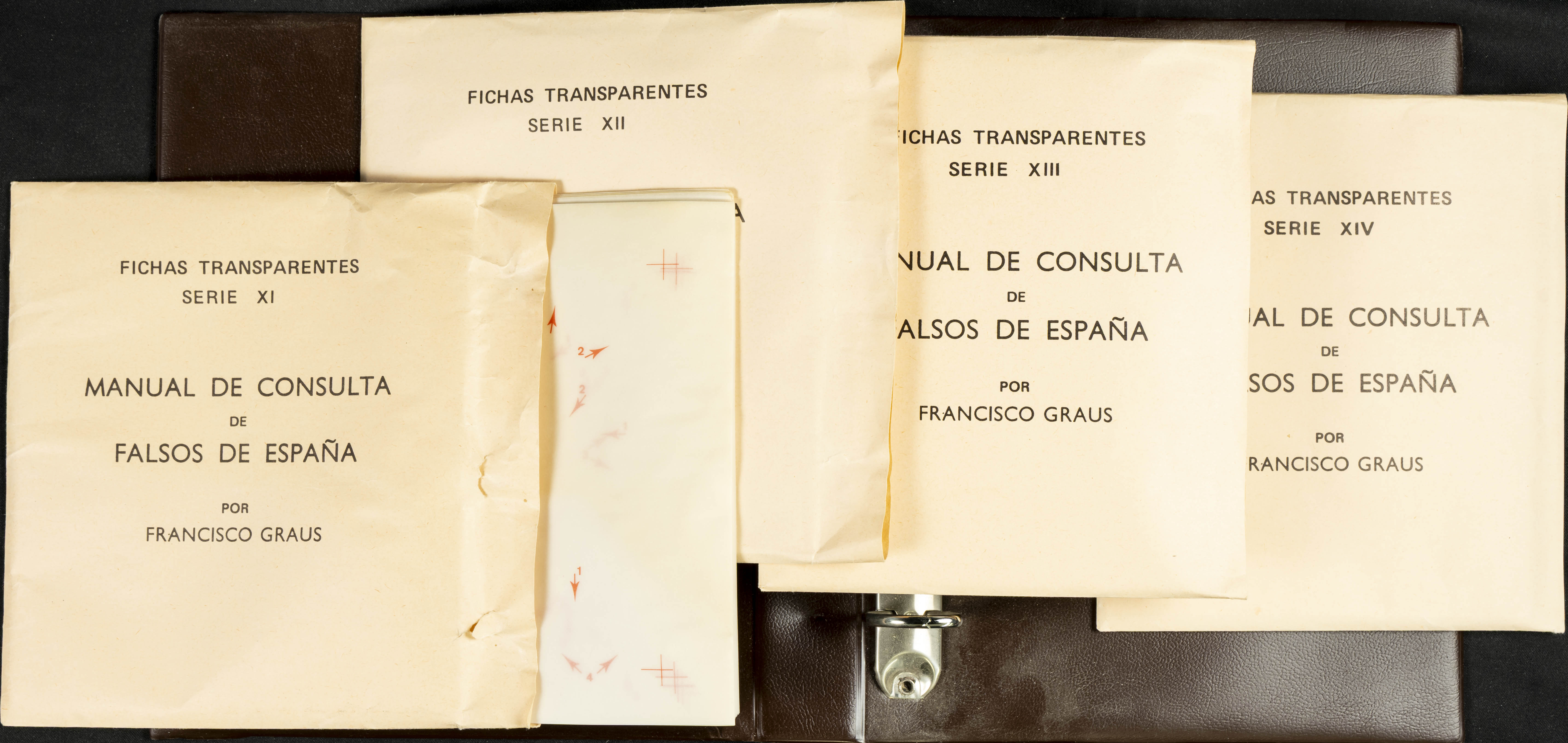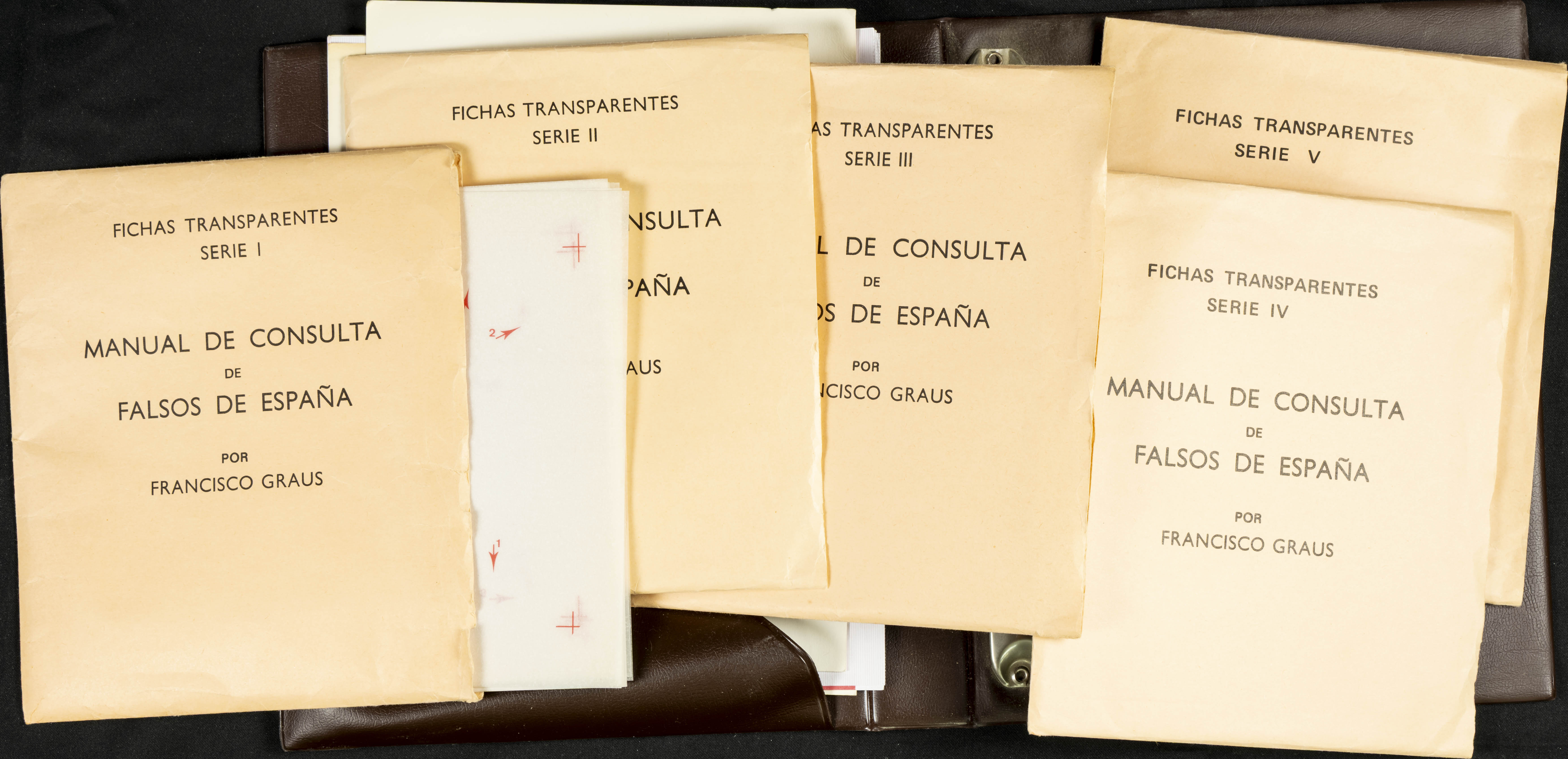 (1986ca). Complete set of the MANUAL OF REFERENCE OF SPANISH FORGERIES, composed of seven volumes with interchangeable cards (some useful annotations by the collector). Francisco Graus. Barcelona, 1986ca. REFERENCE WORK AND ONE OF THE MOST IMPORTANT PUBLISHED BY AN EXPERT IN SPANISH PHILATELY.