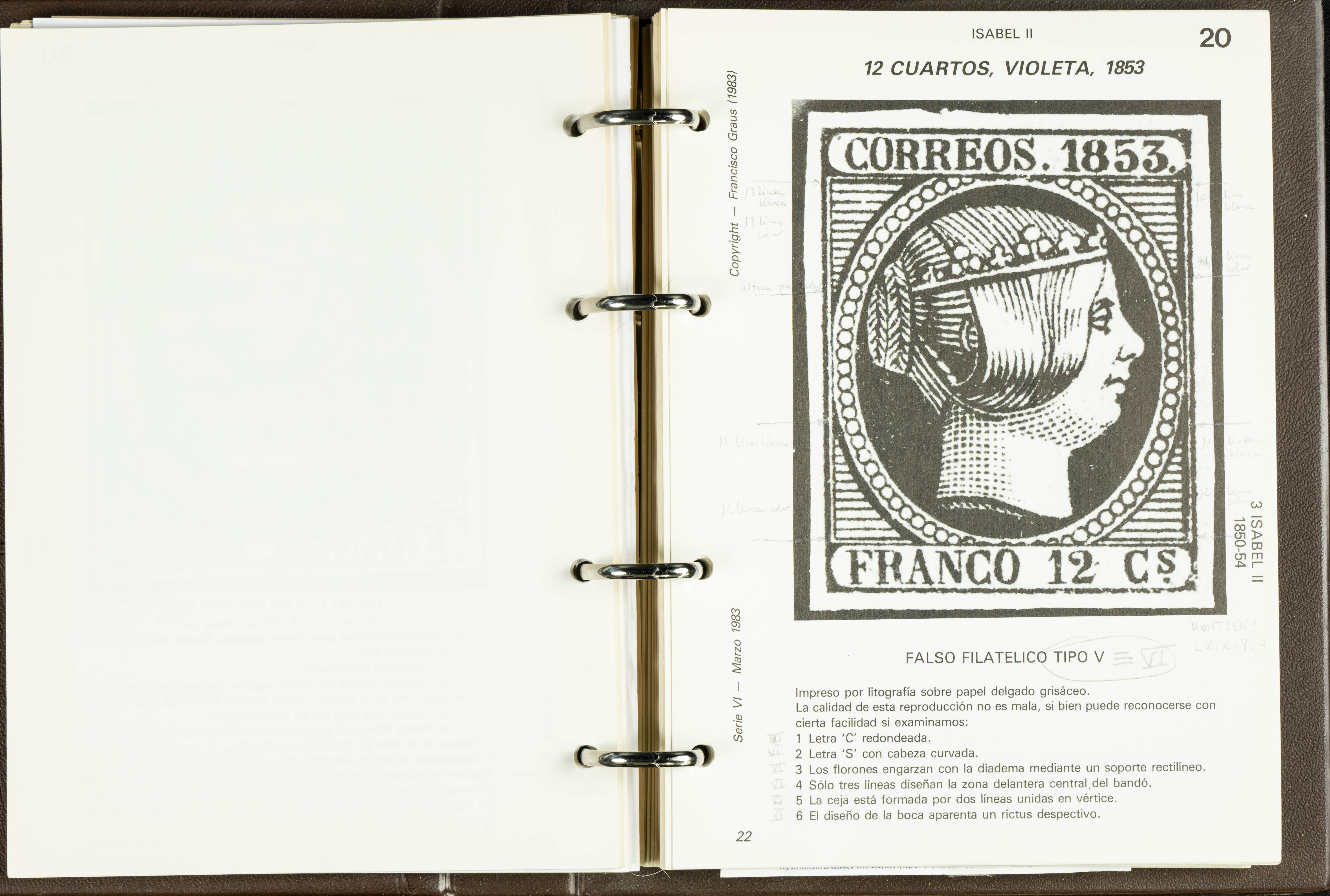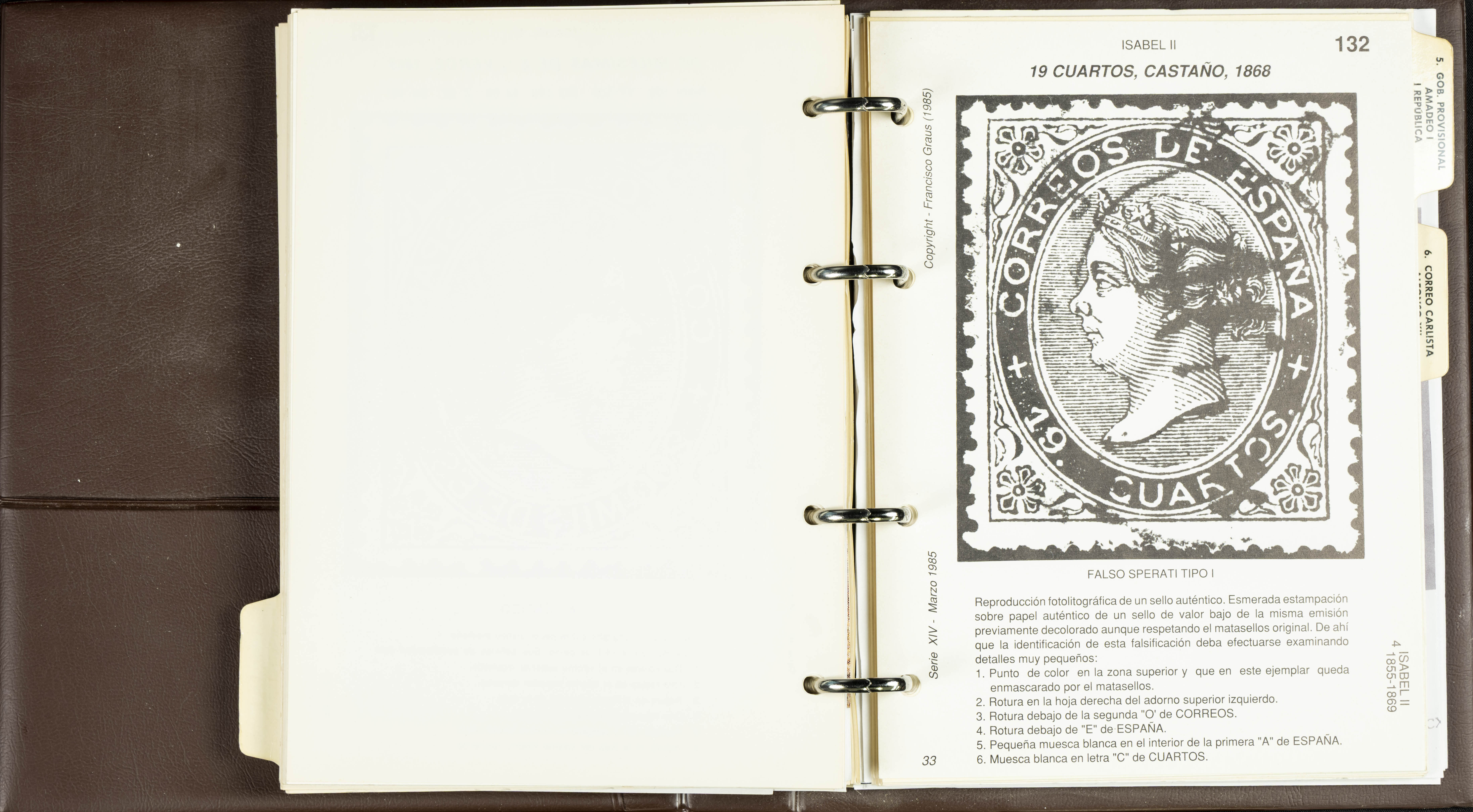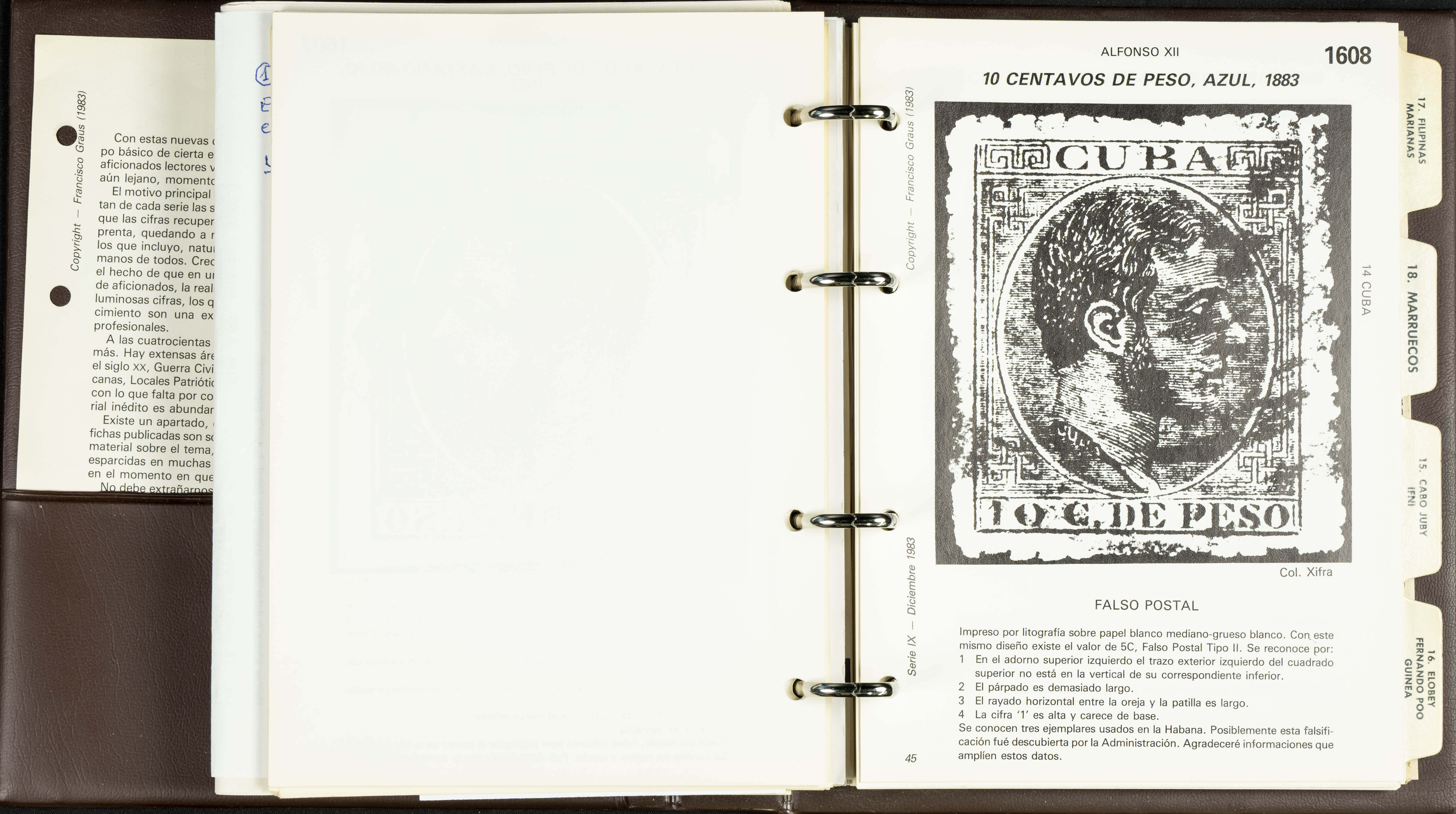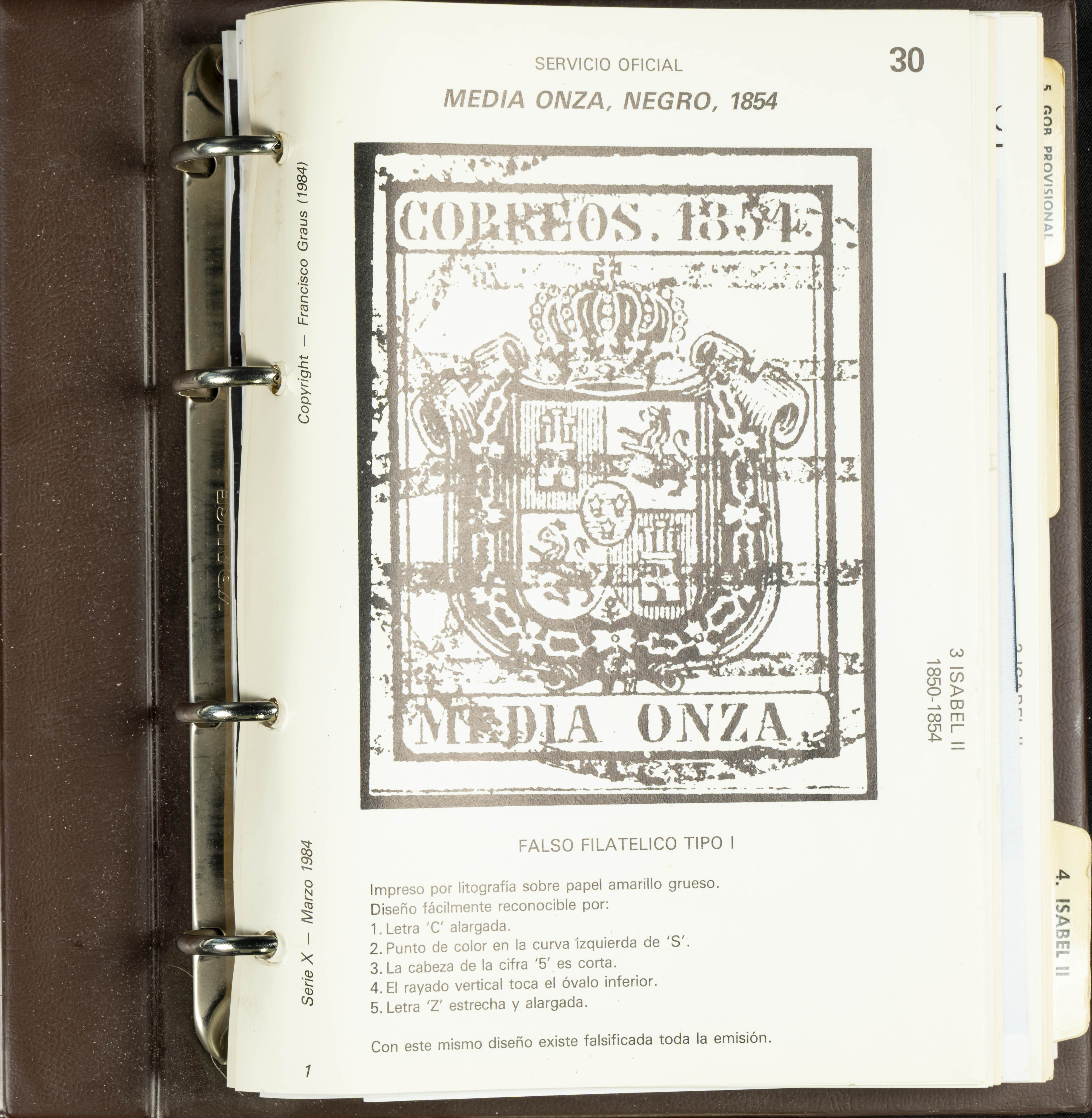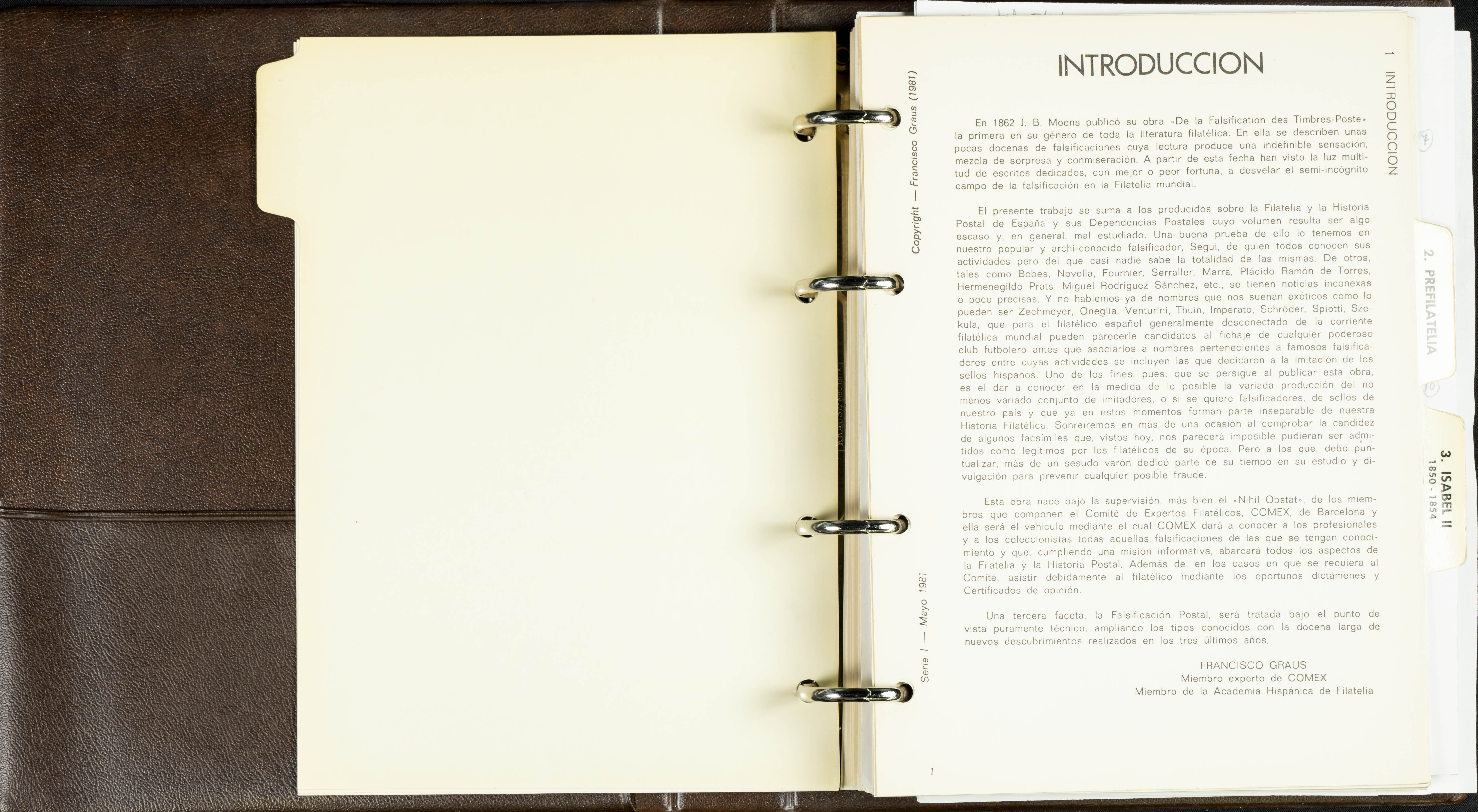 (1986ca). Complete set of the MANUAL OF REFERENCE OF SPANISH FORGERIES, composed of seven volumes with interchangeable cards (some useful annotations by the collector). Francisco Graus. Barcelona, 1986ca. REFERENCE WORK AND ONE OF THE MOST IMPORTANT PUBLISHED BY AN EXPERT IN SPANISH PHILATELY.
