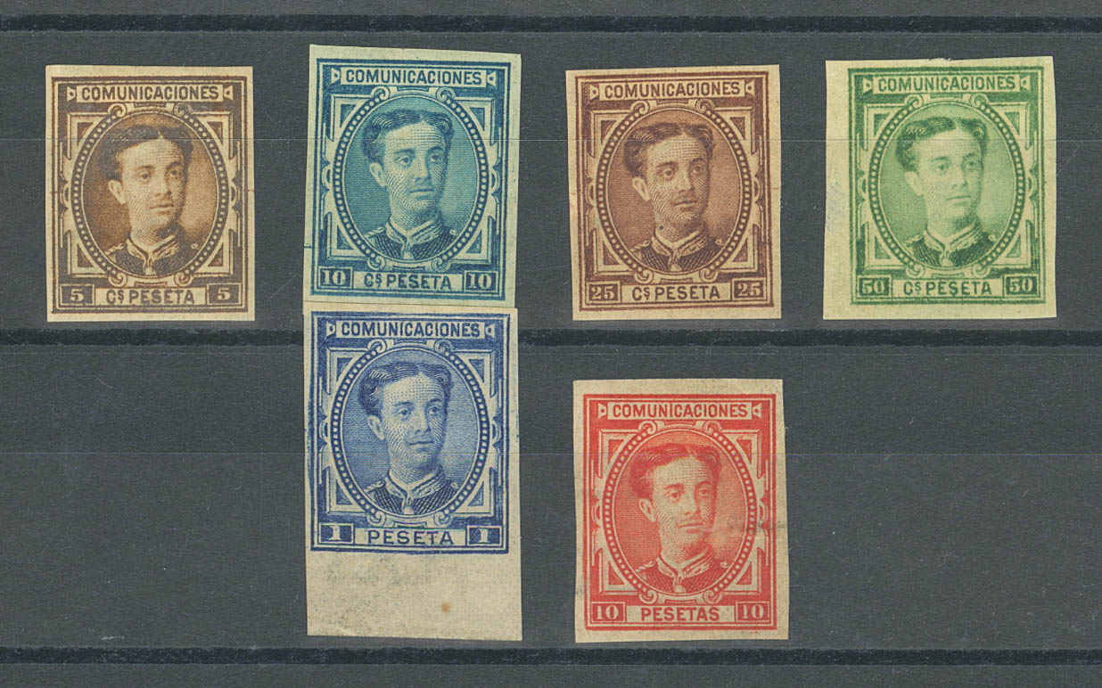★ 174/75s, 177s, 179/80s, 182s. 1876. 5 cts, 10 cts, 25 cts, 50 cts (light dot), 1 pts and 10 pts. WITHOUT TOOTH. MAGNIFICENT. Edifil 2026: 506 Euros