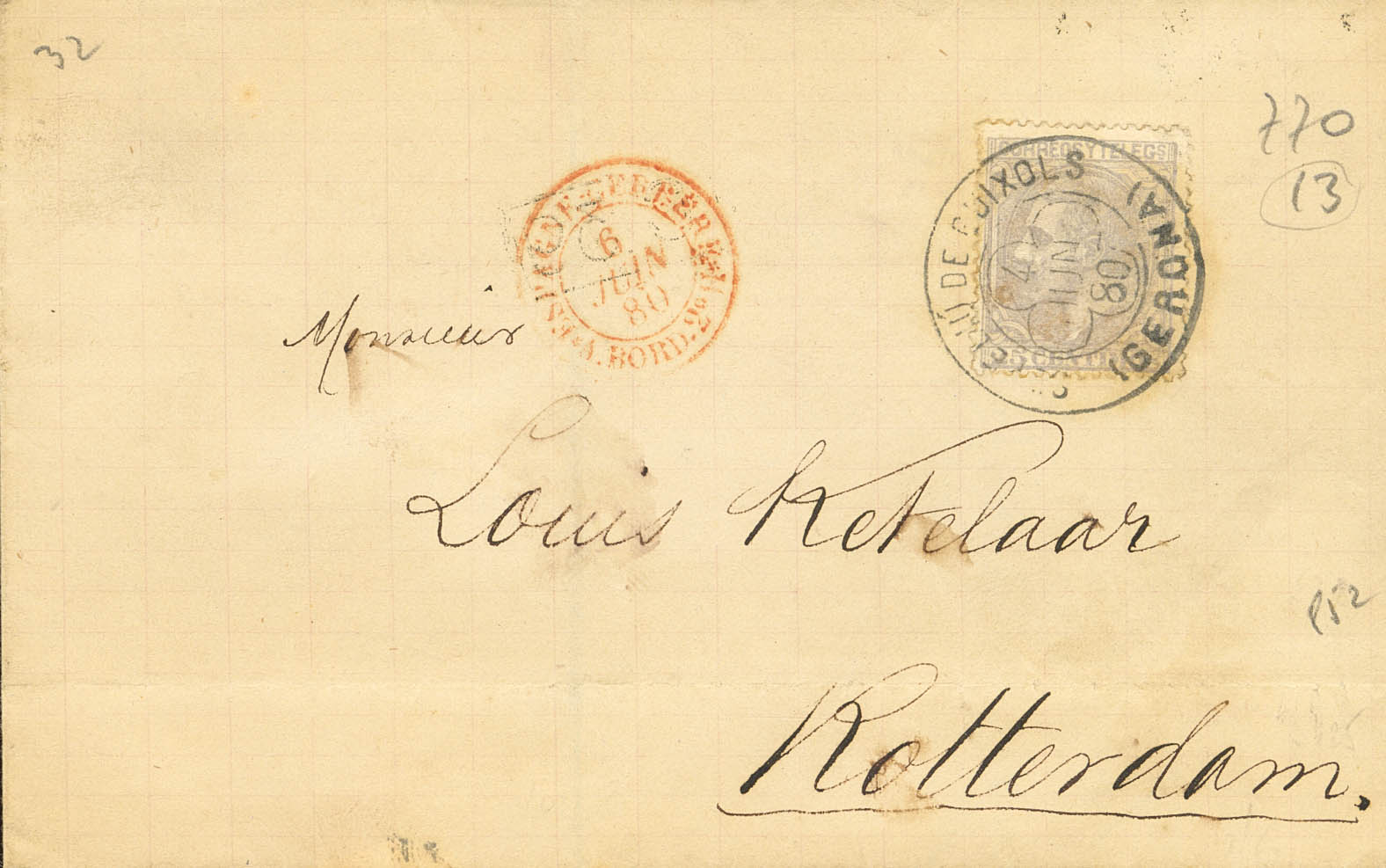 204. 1880. 25 cts blue gray. SAN FELIU DE GUIXOLS to ROTTERDAM (NETHERLANDS). Clover postmark S.FELIU DE GUIXOLS / (GERONA), arrival on the back. MAGNIFICENT.