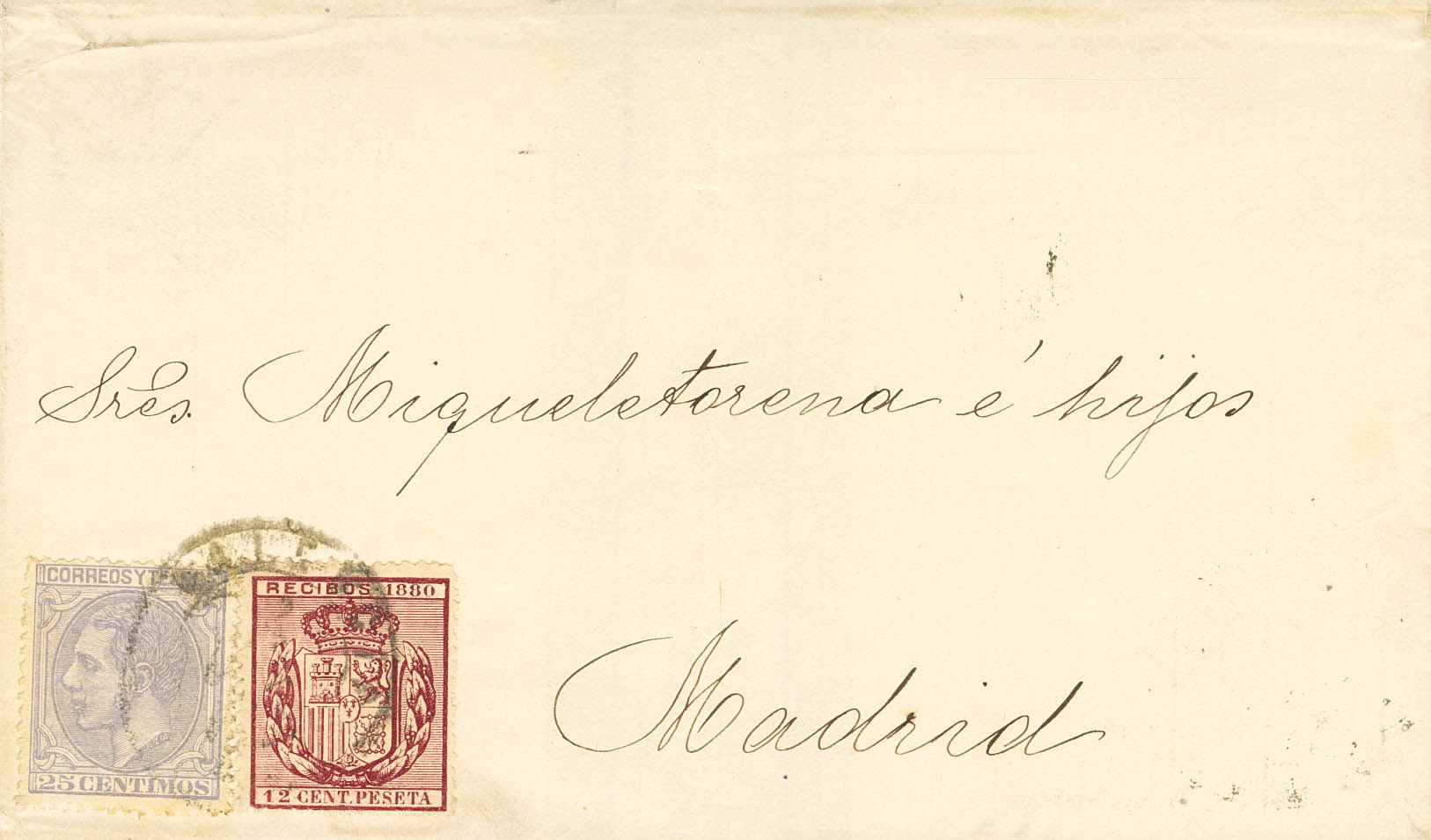 204. 1880. 12 cts carmine chestnut RECEIPTS (1880) and 25 cts blue grey. VALENCIA to MADRID. MAGNIFICENT AND RARE POSTAL USE OF A REVENUE STAMP. (Alemany 31)