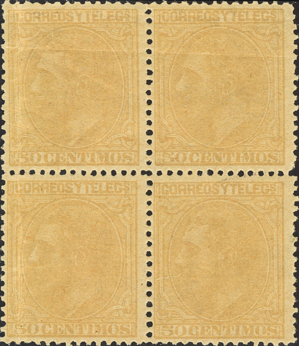 ★ 206(4). 1879. 50 cts pale orange, block of four (gum folds). BEAUTIFUL AND RARE. Edifil 2009: 900 Euros