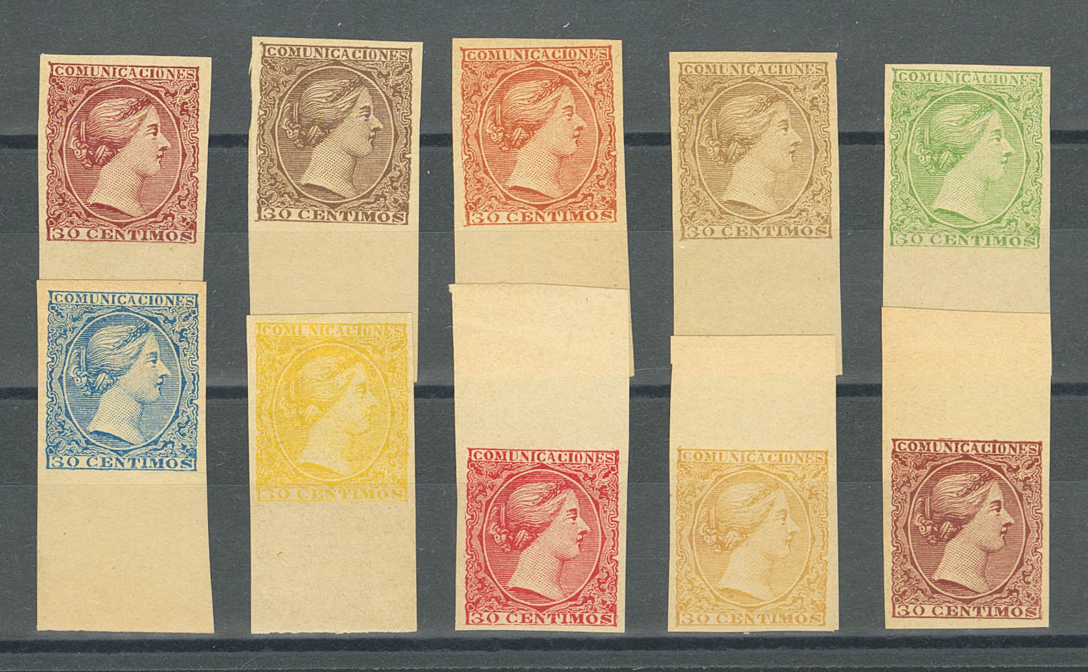 (★)1889. Set of ten 30 CTS COLOR ESSAYS OF AN UNADOPTED DESIGN OF THE QUEEN REGENT, in different colors. MAGNIFICENT.