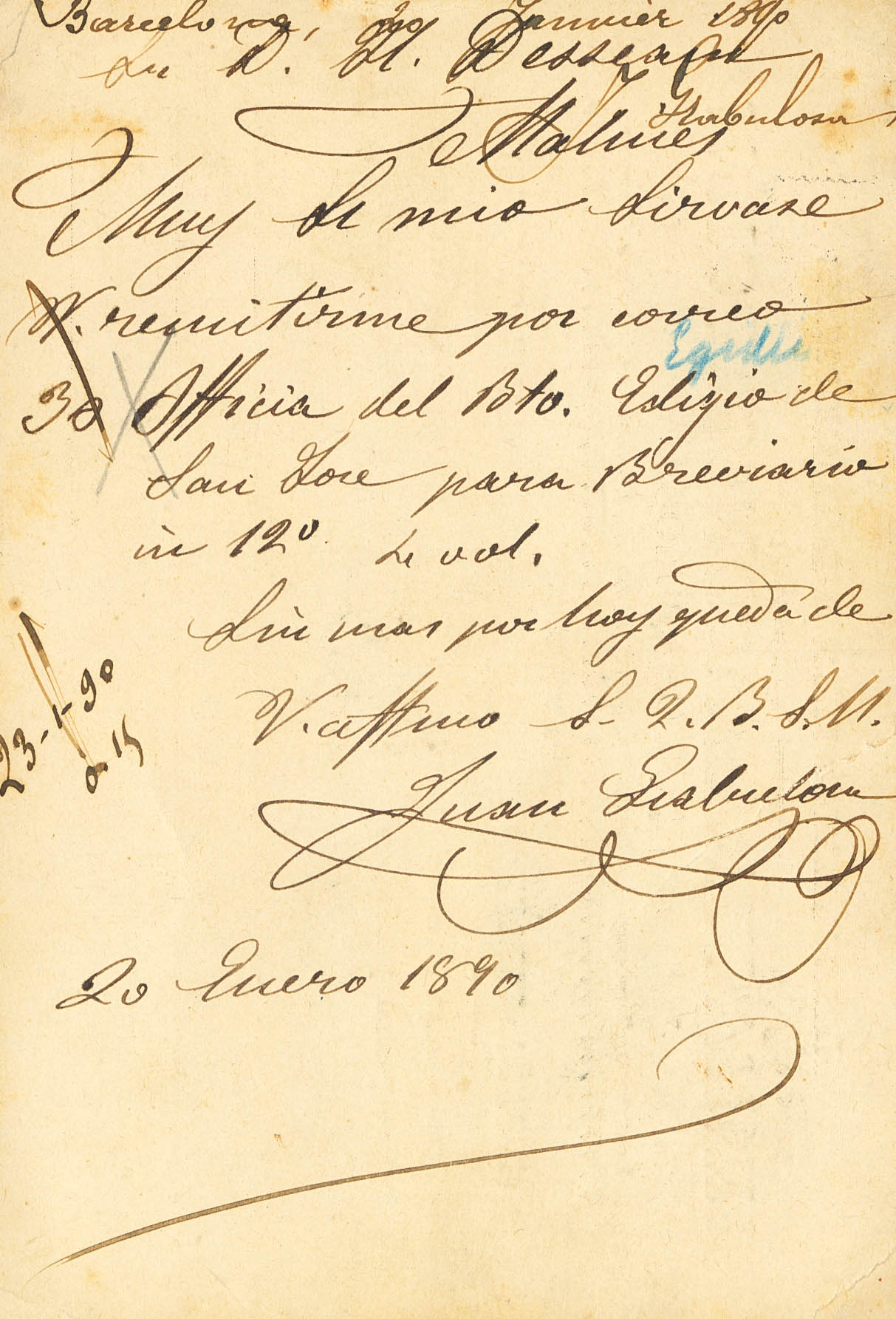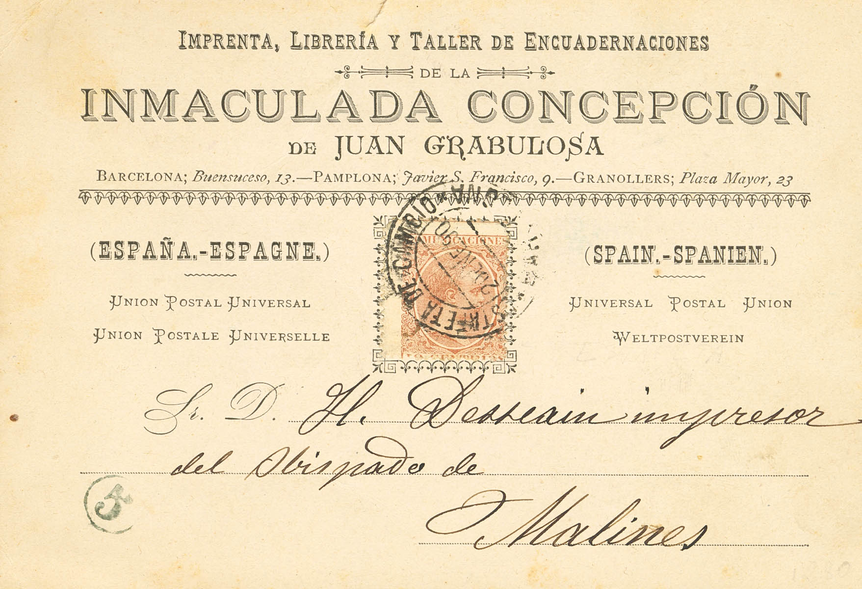 217. 1890. 10 cts yellowish brown (practically with the value cartridge invisible). Commercial postcard IMMACULATE CONCEPTION from BAGoodELONA to MALLINS (BELGIUM). Arrival on the front. MAGNIFICENT.