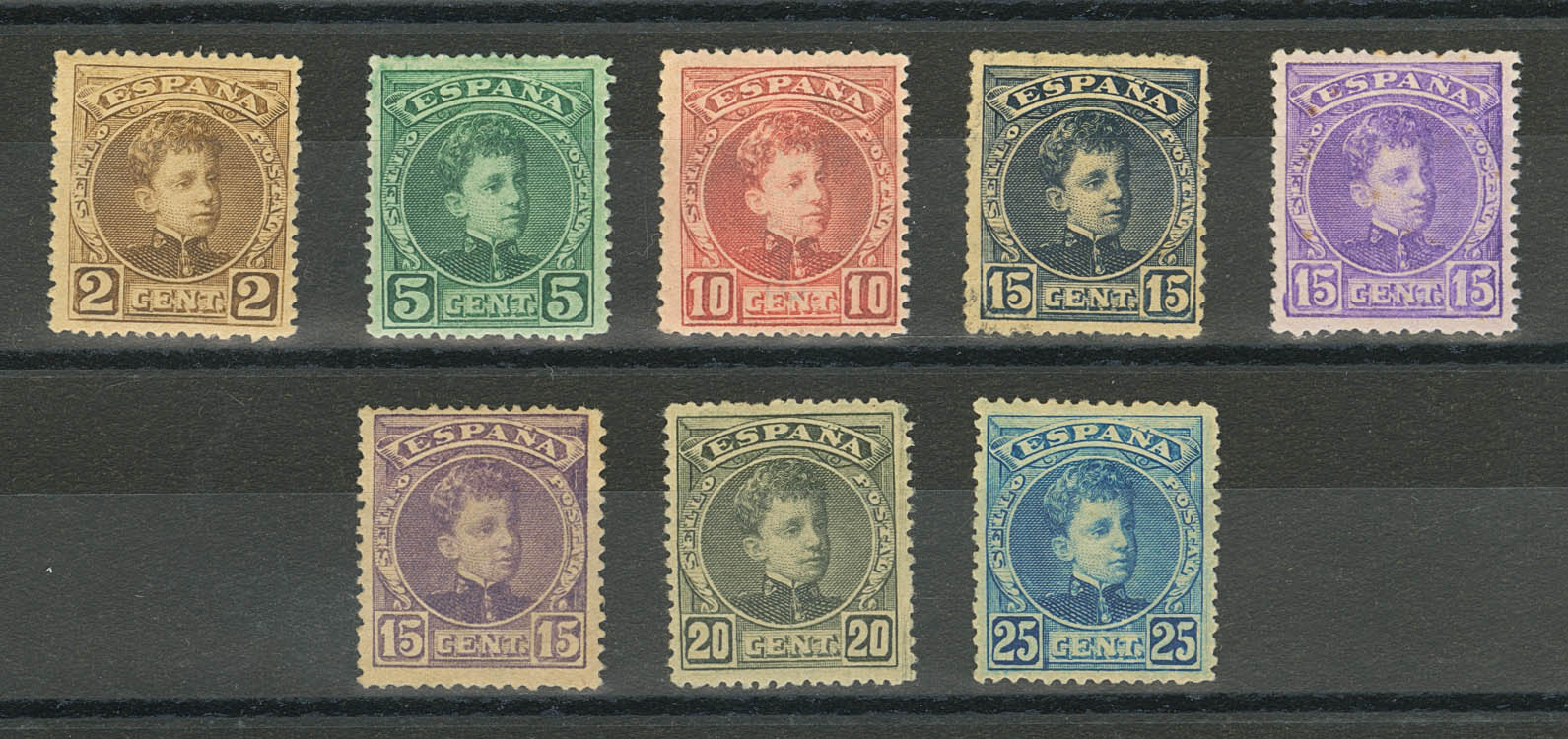 ★ 241/48. 1901. 2 cts, 5 cts, 10 cts, 15 cts blue black, 15 cts violet, 15 cts chestnut lilac, 20 cts and 25 cts. Excellent centering. MAGNIFICENT. Edifil 2026: 99 Euros