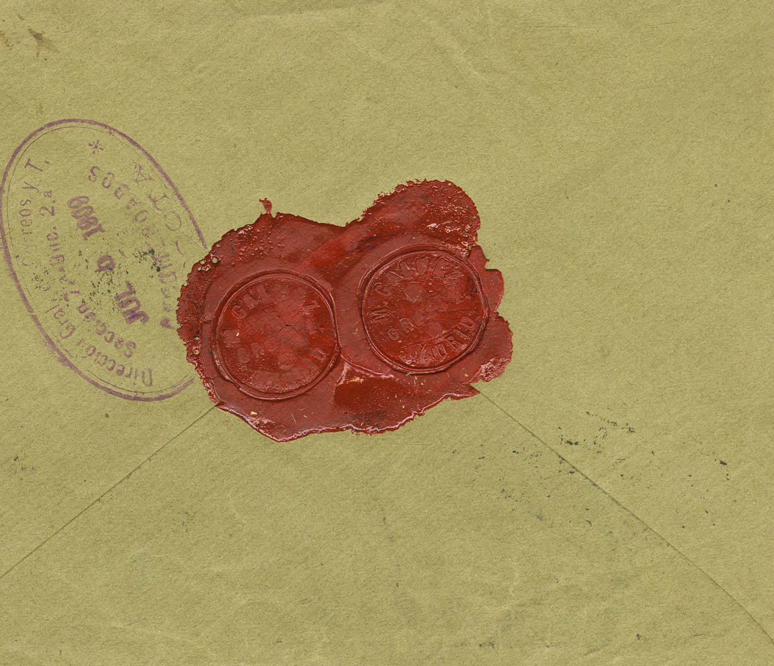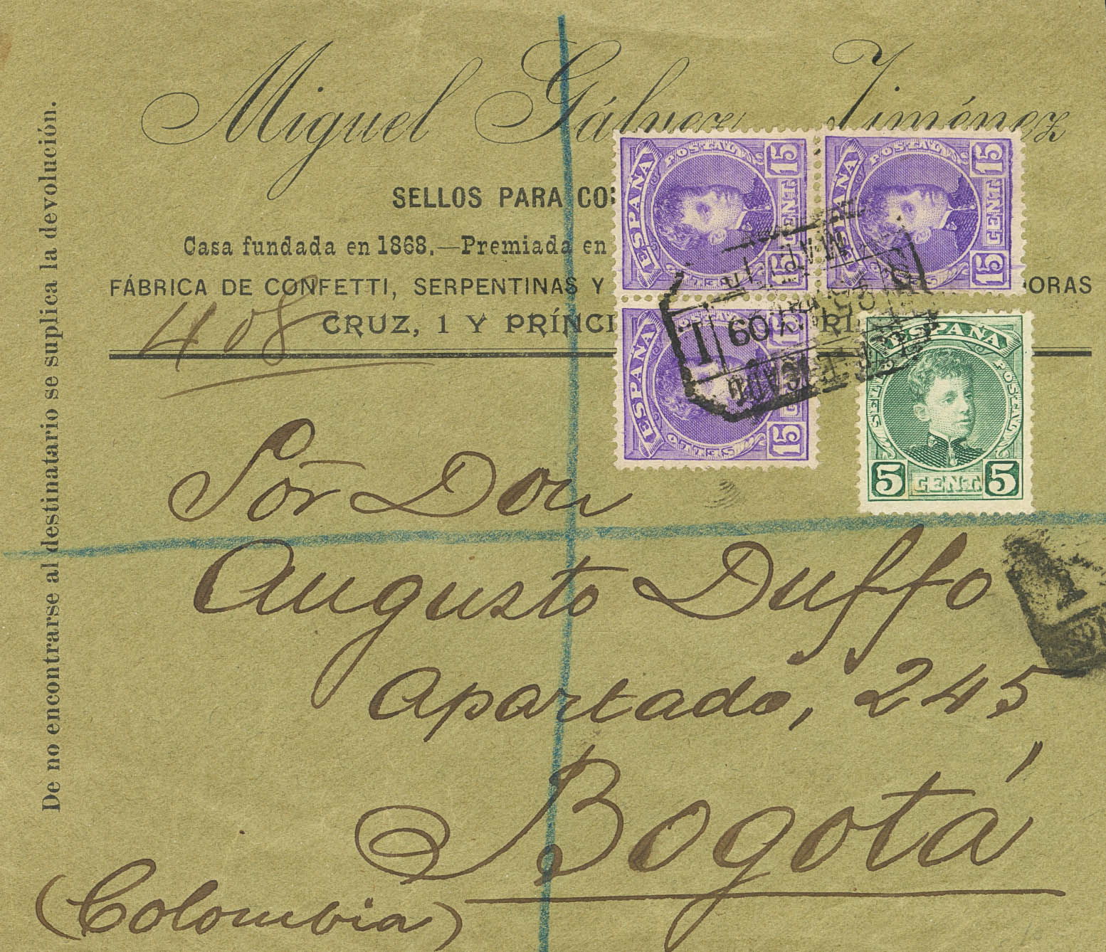 242, 246(3). 1909. 5 cts green and 15 cts violet, three stamps. Letterhead of the philatelic dealer Miguel Gálvez. Certificate from MADRID to BOGOTA (COLOMBIA). Arrival on the back. MAGNIFICENT AND RARE.