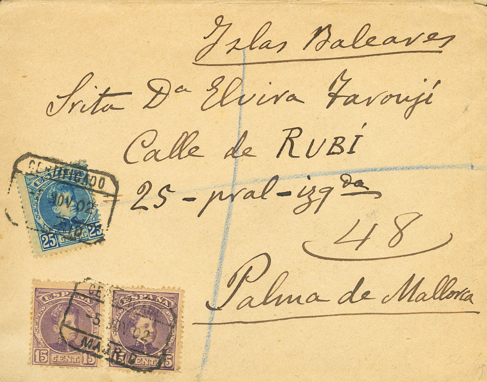245(2), 248. 1902. 25 cts and 15 cts, two stamps. Certificate from MADRID to PALMA DE MALLOGoodA. Arrival on the back. MAGNIFICENT.