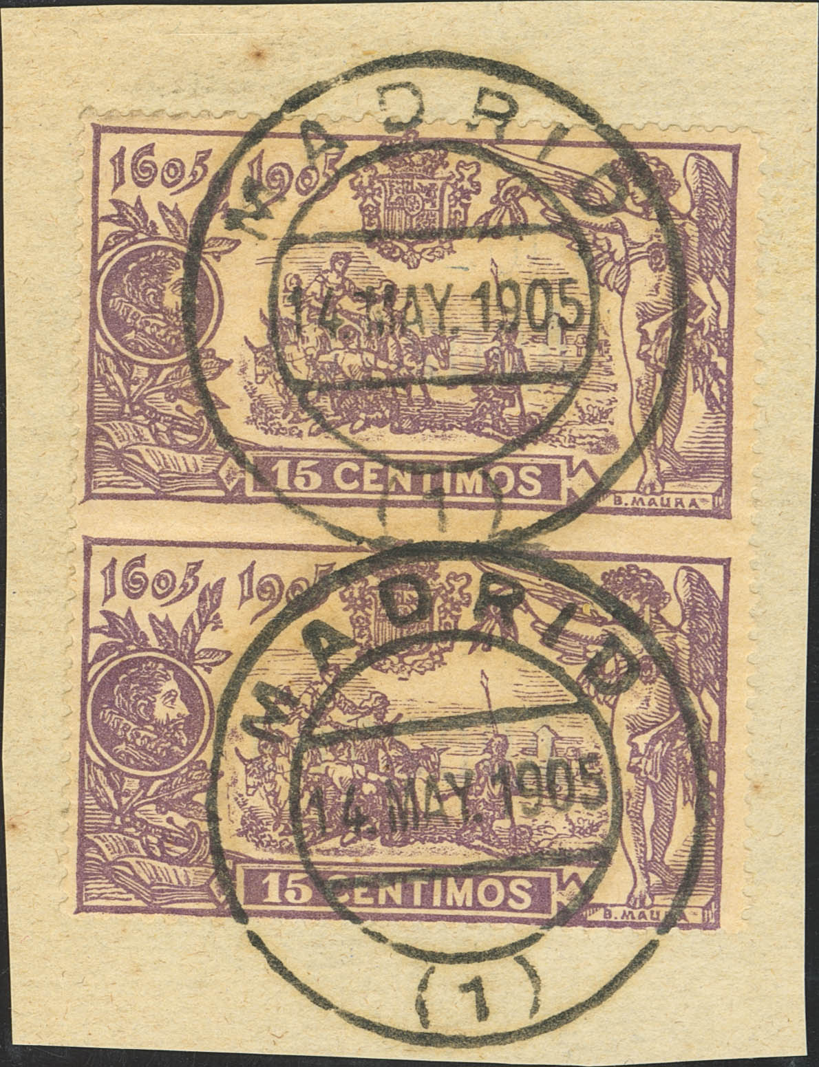 △ 259spv. 1905. 15 cts violet, vertical pair. UNDERTAKEN BETWEEN THE STAMPS. MAGNIFICENT. Edifil 2015: 121 Euros