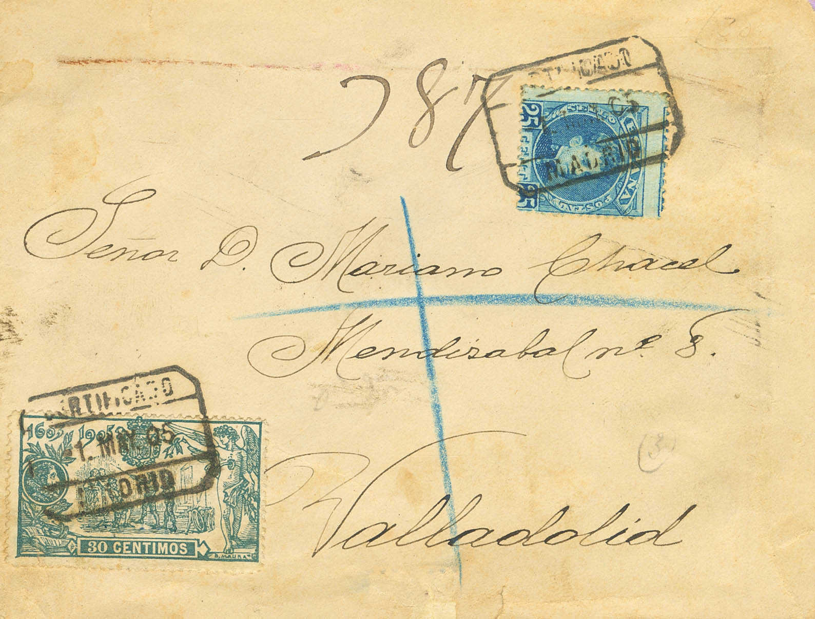 248, 261. 1905. 25 cts and 30 cts. Certificate from MADRID to VALLADOLID. Arrival on the back. MAGNIFICENT AND VERY RARE COMBINATION.