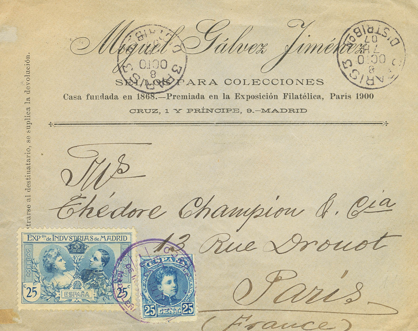 SR3, 248. 1907. 25 cts blue and 25 cts blue (Cadet). MADRID to PARIS (FRANCE). Arrival front. MAGNIFICENT AND RARE.