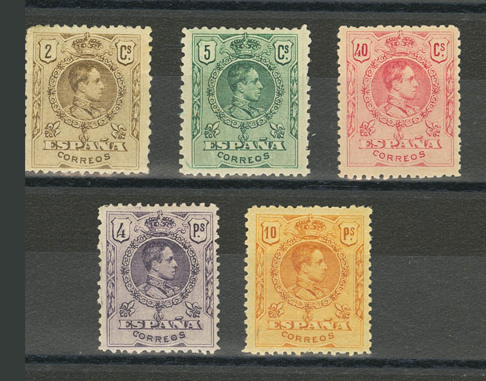 ★ 267/68, 276, 279/80. 1909. 2 cts brown, 5 cts green, 40 cts pink, 4 pts violet and 10 pts orange. MAGNIFICENT. Edifil 2026: 253 Euros