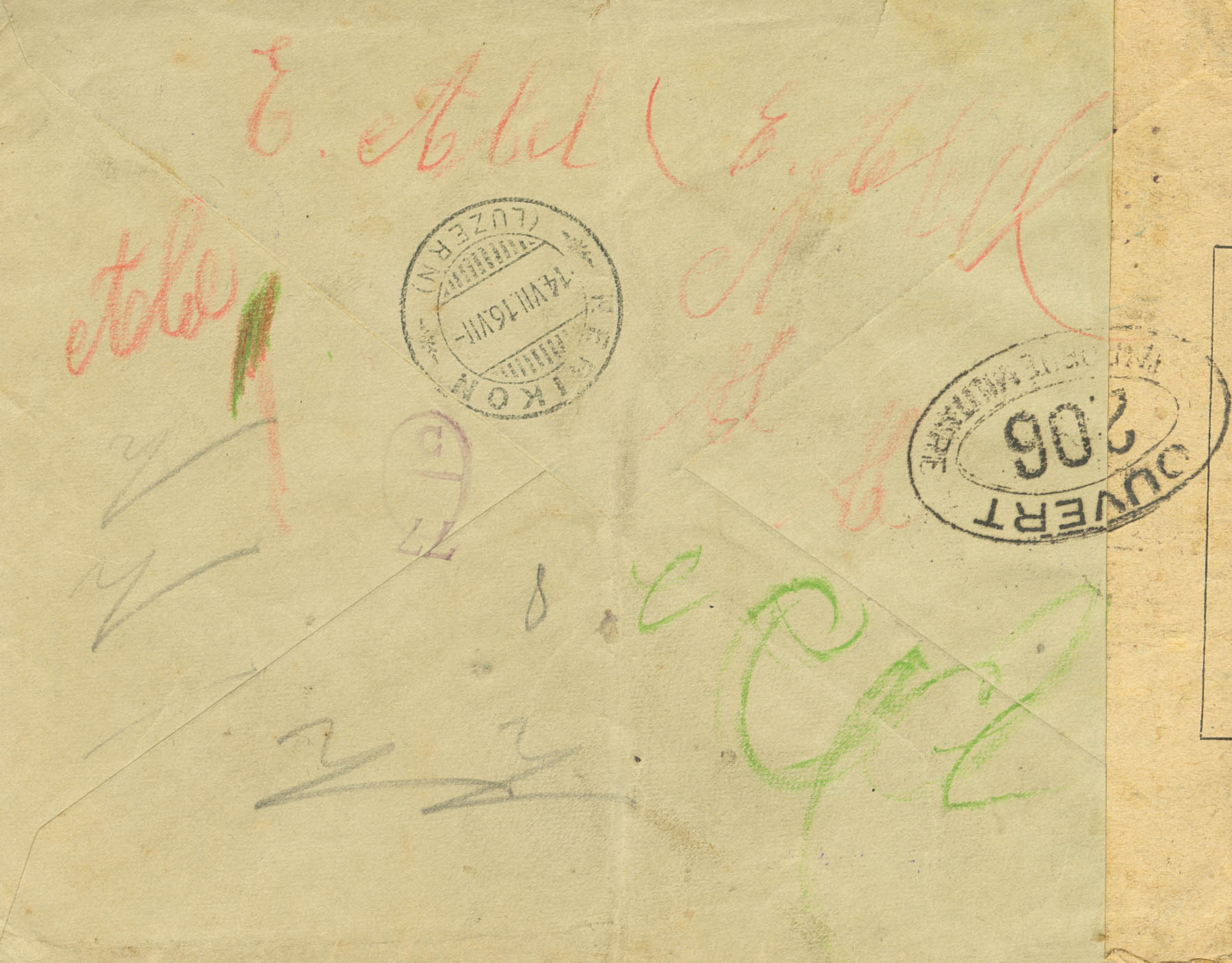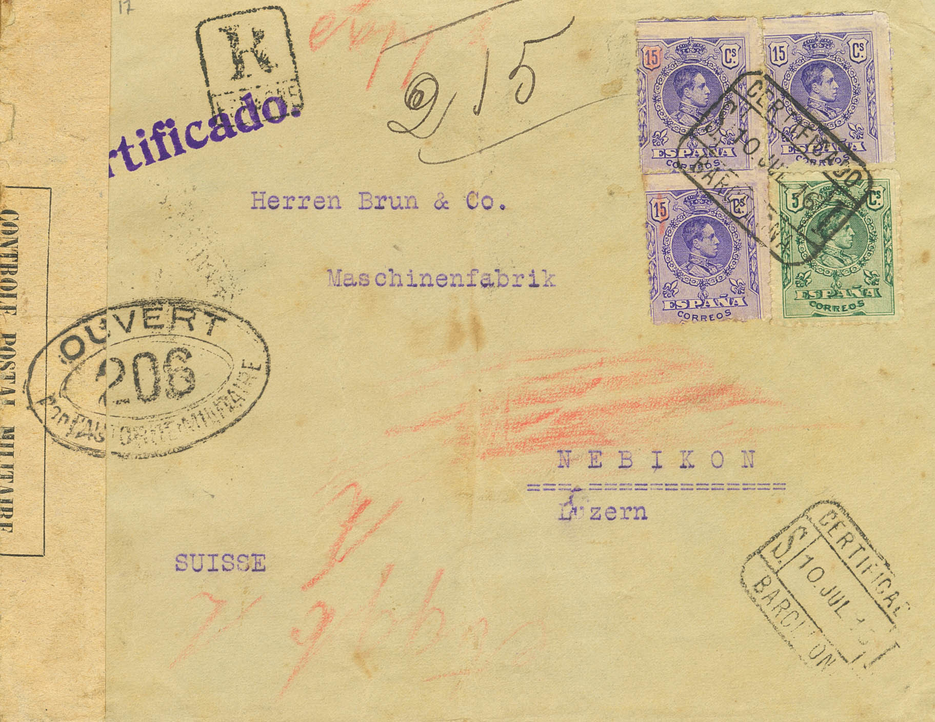 268, 270(3). 1910. 5 cts green and 15 cts violet, three stamps. Certificate from BAGoodELONA to NEBIKON (SWITZERLAND). Arrival on the back. MAGNIFICENT AND UNUSUAL POSTAGE.