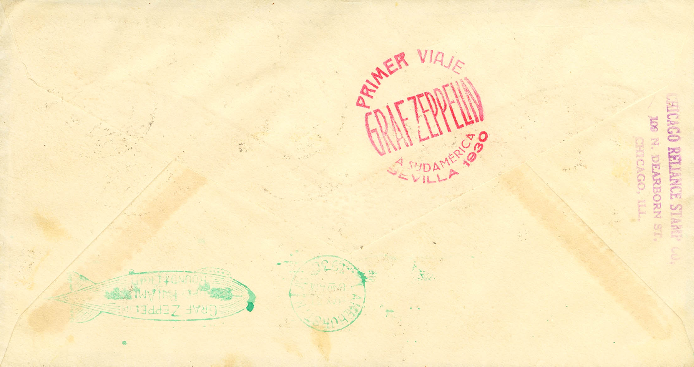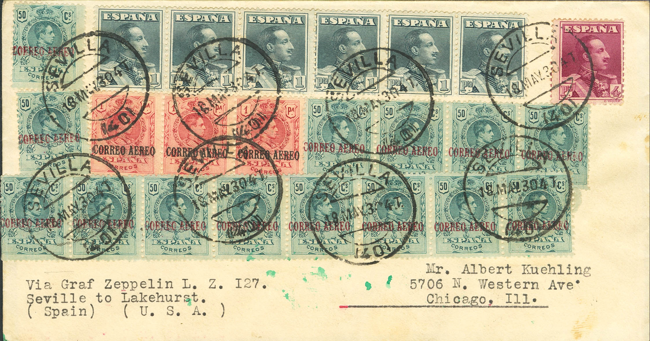 295(14), 296(3), 321(6), 322. 1930. 50 cts blue, fourteen stamps, 1 pt carmine, three stamps, 1 pt slate, six stamps and 4 pts carmine violet. Graf Zeppelin from SEVILLE to CHICAGO (USA). On the back: FIRST VOYAGE / GRAF ZEPPELIN / SOUTH AMERICA / SEVILLE 1930 and arrival at Lakehurst. MAGNIFICENT AND SPECTACULAR.