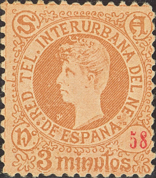 (★)(1920ca). No value figure, chestnut. NE INTEGoodITY TELEPHONE NETWORK / OF SPAIN / 3 MINUTES. BEAUTIFUL AND RARE, NOT CATALOGED.