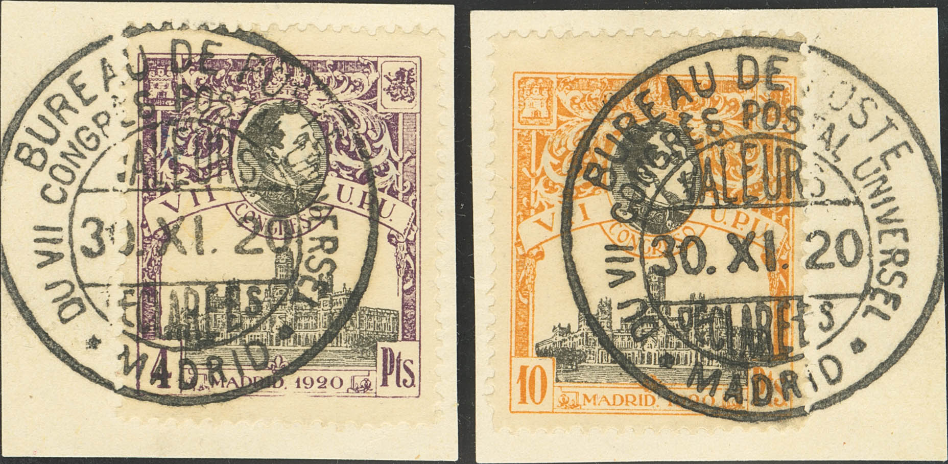 △ 308/09. 1920. 4 pts violet and black and 10 pts orange and black (excellent centering), on fragment. Postmark BUREAU DE POSTE / DU VIII CONGRES POSTAL UNIVERSEL / MADRID. MAGNIFICENT. Edifil 2026: 455 Euros