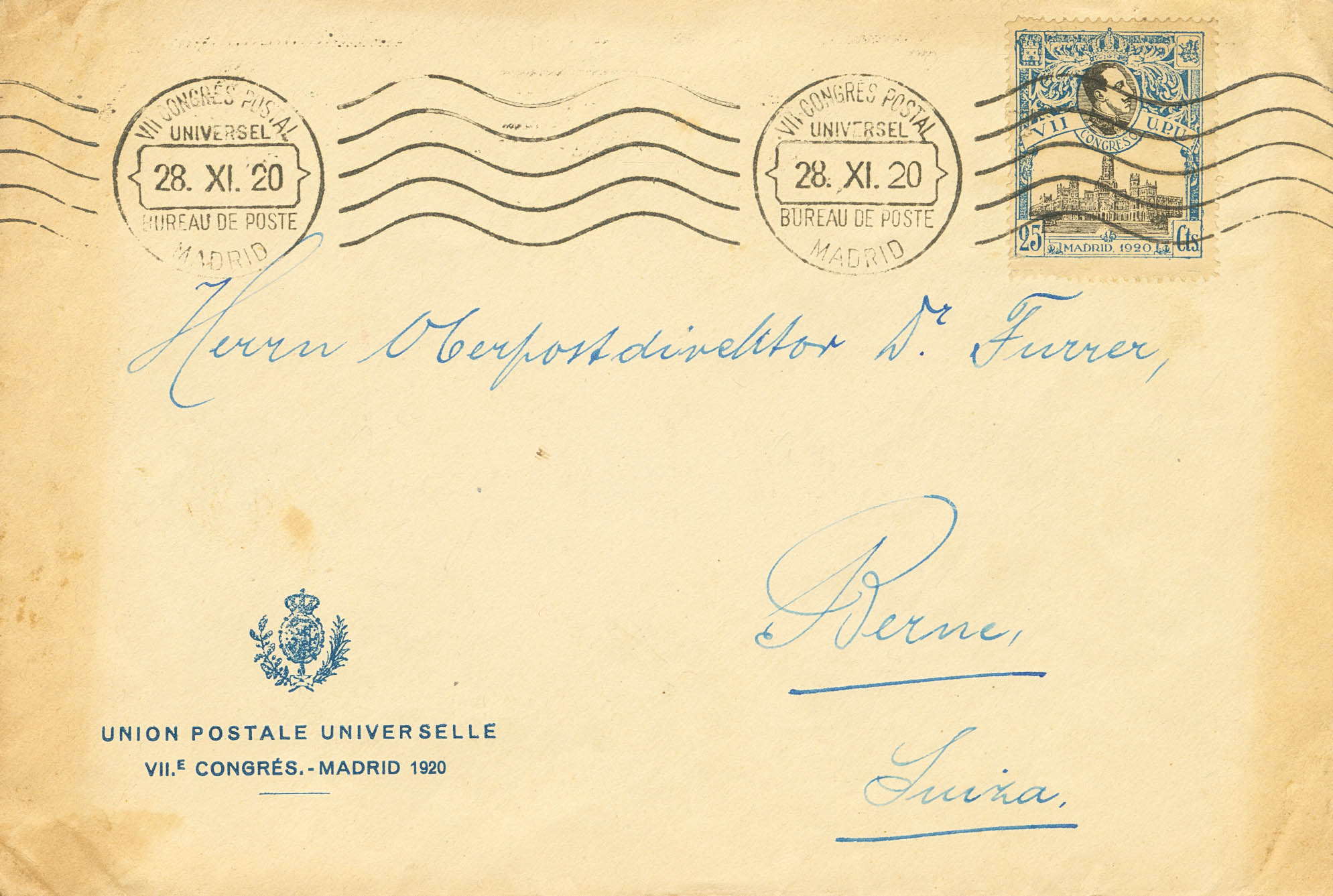 303. 1920. 25 cts blue. MADRID to BERN (SWITZERLAND). Special roller postmark VII POSTAL CONGRESS / UNIVERSAL / BUREAU DE POSTE / MADRID. MAGNIFICENT AND VERY RARE. Edifil 2015: +258 Euros