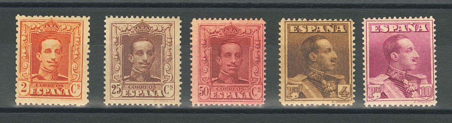 ★ 310ec, 317Aec, 320ec, 322/23ec. 1922. 2 cts orange, 25 cts lilac, 50 cts red chestnut, 4 pts chestnut, and 10 pts carmine lilac. COLOR ERRORS (corresponding to all those considered by the Edifil catalog). MAGNIFICENT AND RARE. Edifil 2015: 636 Euros