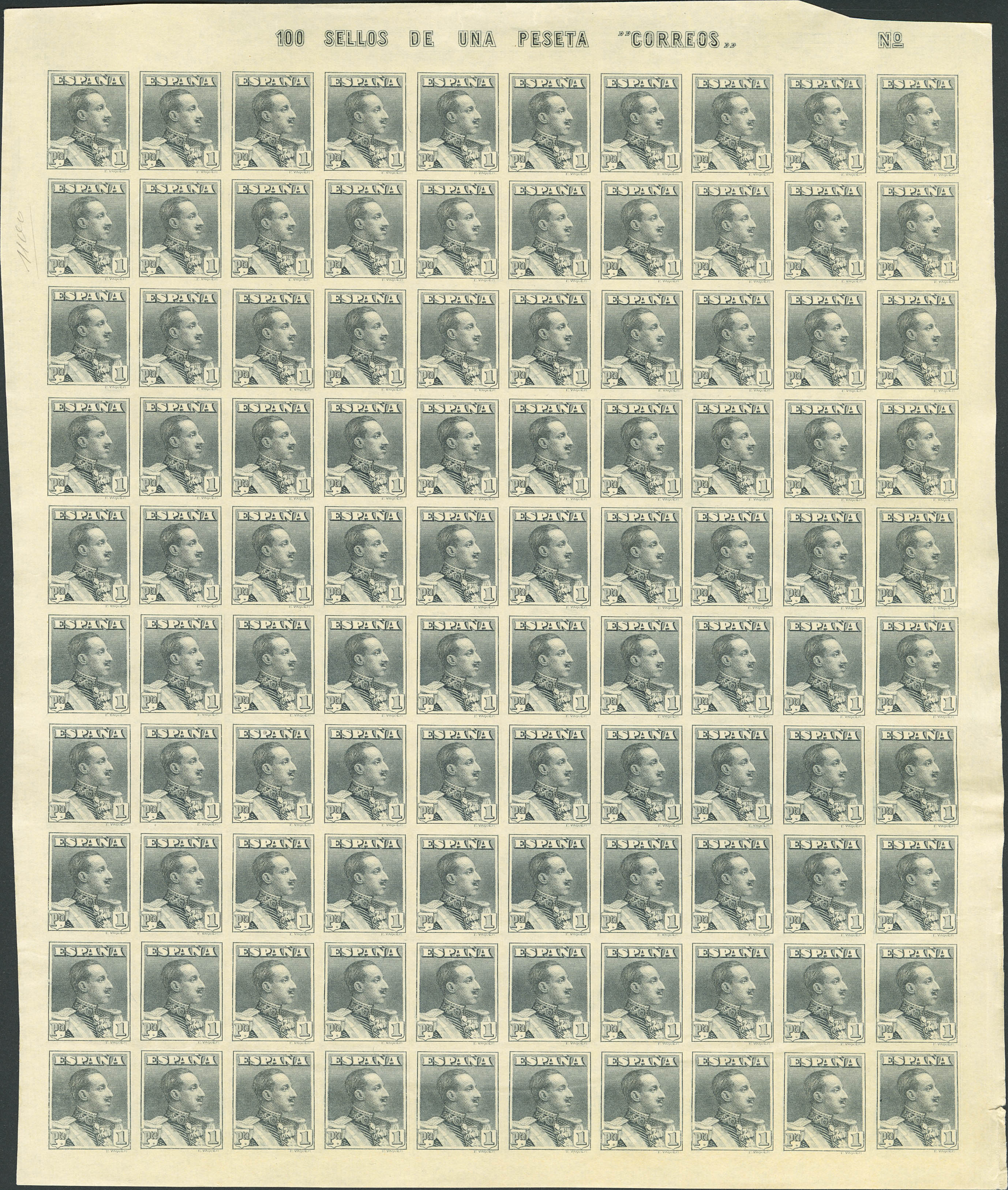 ★★ 321s(100). 1922. 1 pt slate, complete sheet of one hundred stamps. INPUT. MAGNIFICENT AND VERY RARE. Edifil 2026: +++4,600 Euros