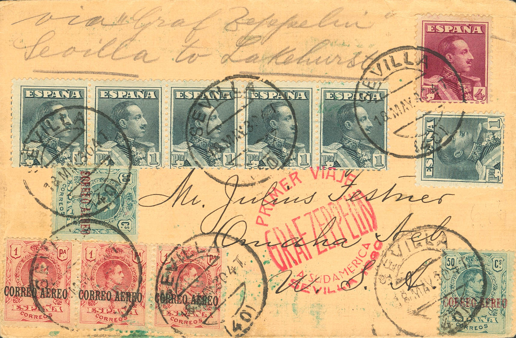 295(14), 296(3), 321(6), 322. 1930. 1 pt carmine, three stamps, 1 pt slate, six stamps, 4 pt carmine, on the back 50 cts green, fourteen stamps. Graf Zeppelin from SEVILLE to OMAHA (USA). On the back, arrival. MAGNIFICENT AND SPECTACULAR POSTAGE.