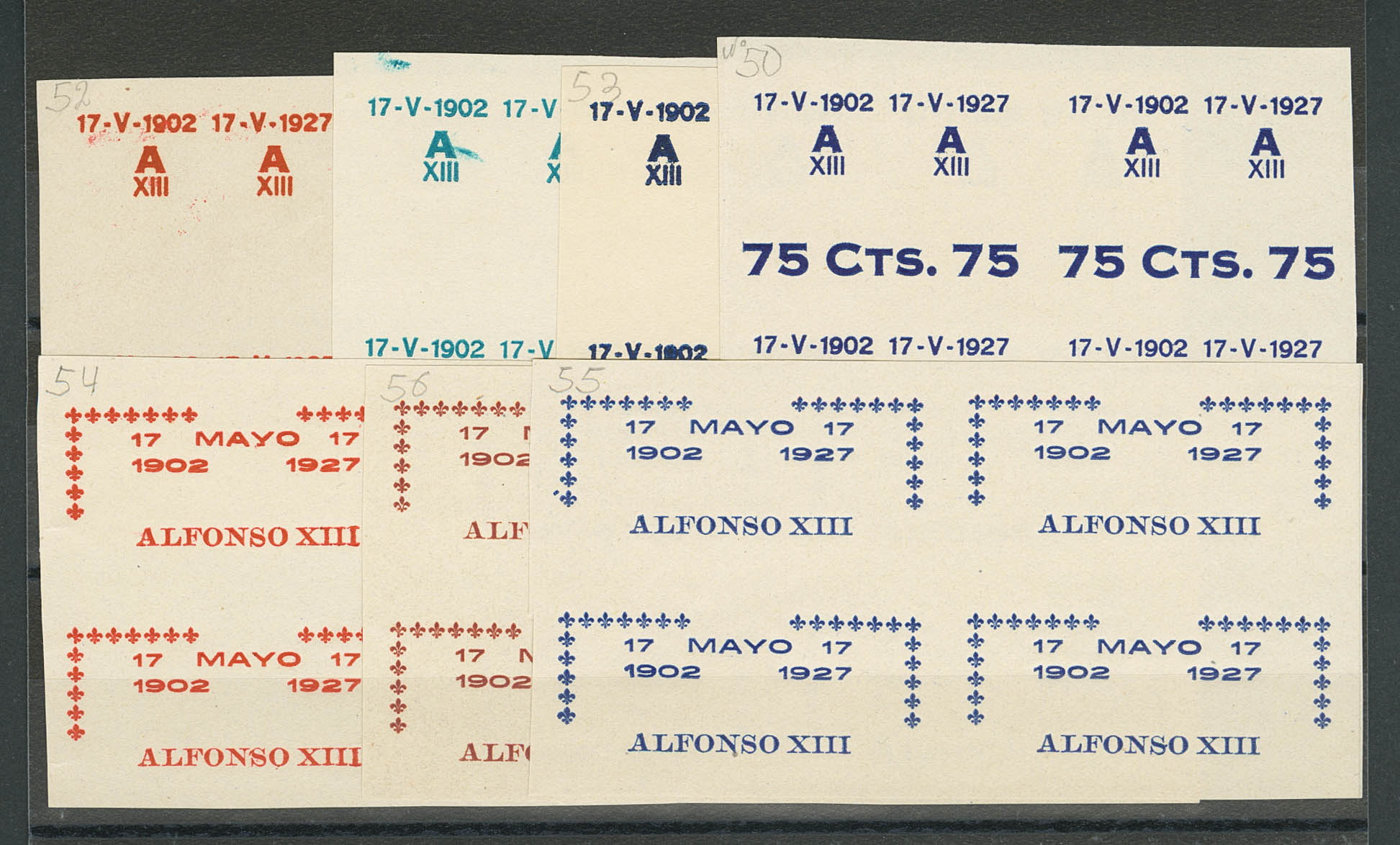 (★)1927. Complete series, seven values, blocks of four. OVERLOAD IMPRINT PROOFS. MAGNIFICENT AND RARE. (Gálvez CA55/61)