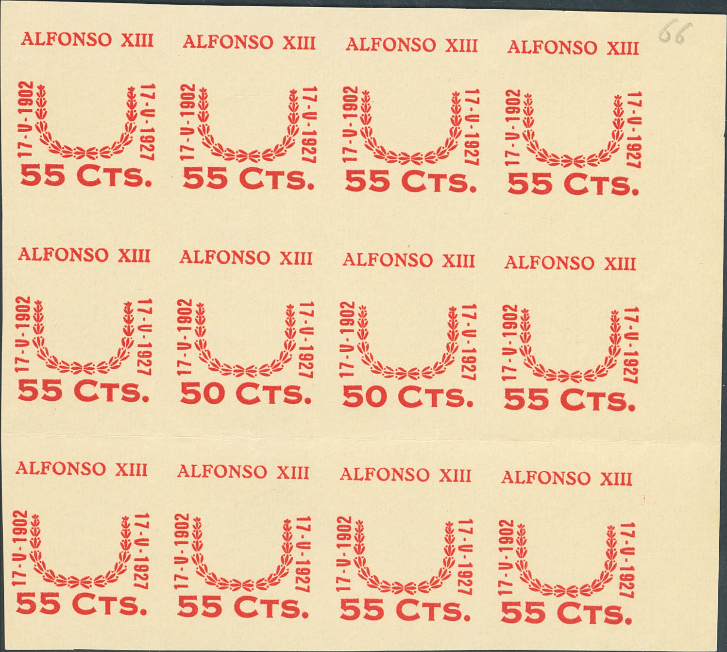 (★)1927. 55 cts red, block of twelve. PROOF OF THE IMPRINTS OF THE OVEGoodHARGES WITH THE 50 CTS ERROR. MAGNIFICENT AND RARE, THIS ARRANGEMENT OF THE STAMPS IS NOT CATALOGUED. (Gálvez, 2220)