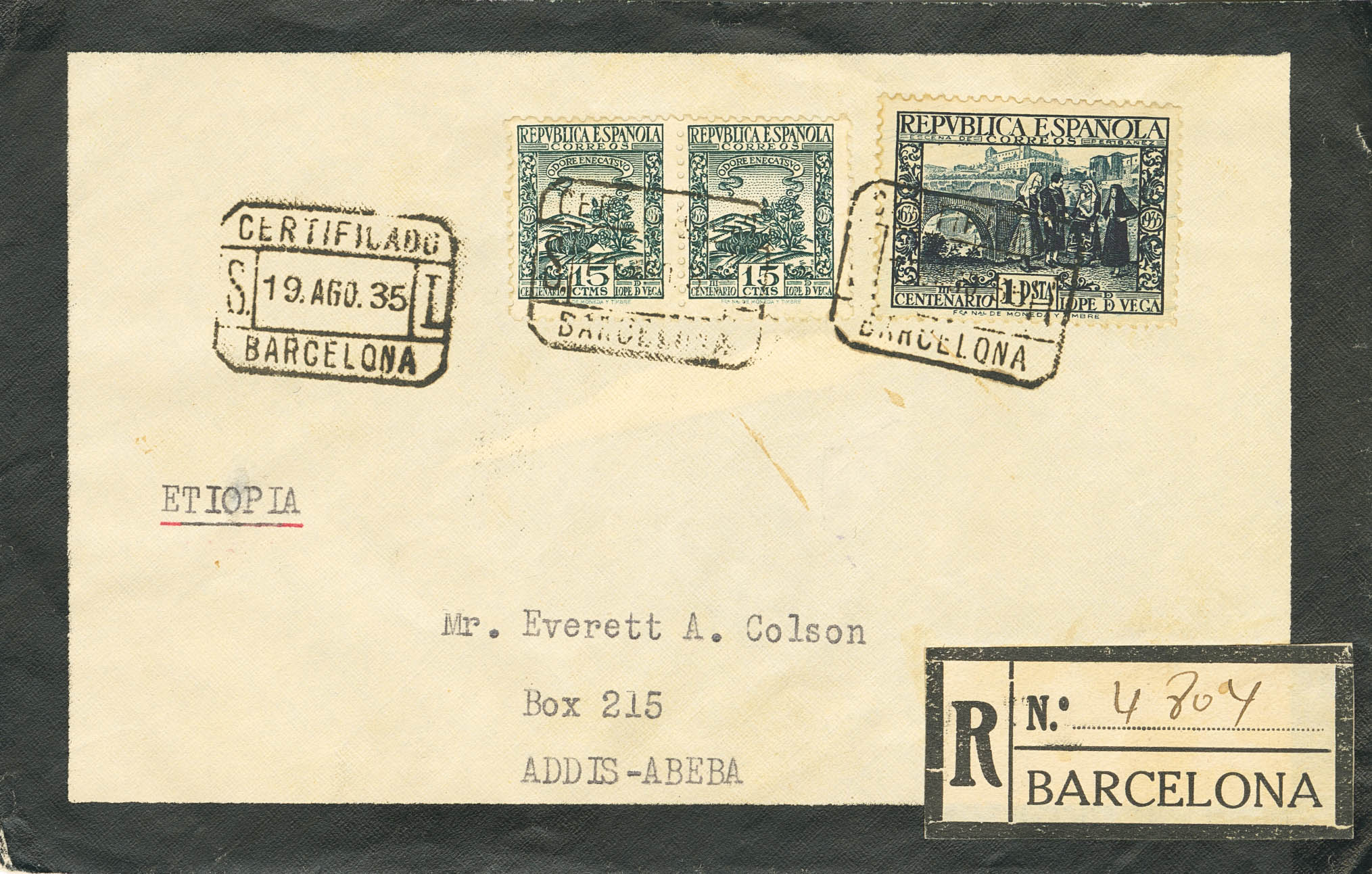 690(2), 693. 1935. 15 cts green, two stamps and 1 pt slate. Certificate from BAGoodELONA to ADDIS ABABA (ETHIOPIA). MAGNIFICENT AND VERY RARE DESTINATION.
